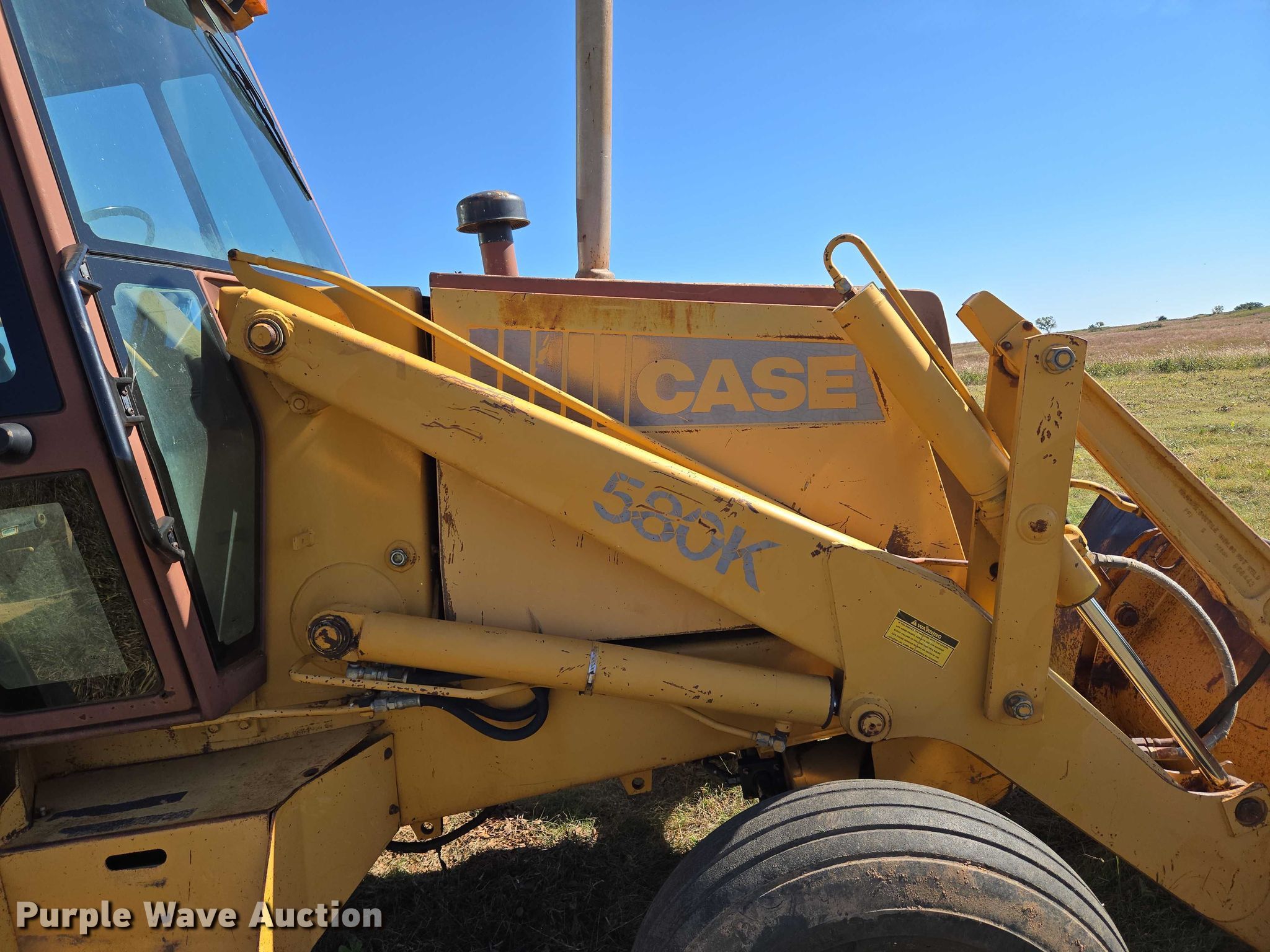 Case 580K backhoe. Hours: 3,880 on meter. Engine Case 4-390, Serial: 44399634, Cylinders: 4, Fuel type: Diesel. Transmission Shuttle shift, 4F - 4R. Operators station Enclosed cab, AC, Heat, Backhoe controls: Four stick. Features Loader Bucket Width: 82", Backhoe Extendable stick, Bucket Width: 24", Teeth: 5.. Tires Front: 11L-16, Rear: 19.L-24. Notes Glass missing, Hydraulic leak, Non-operational HVAC, Backhoe bucket damaged. Crawford, OK 73638