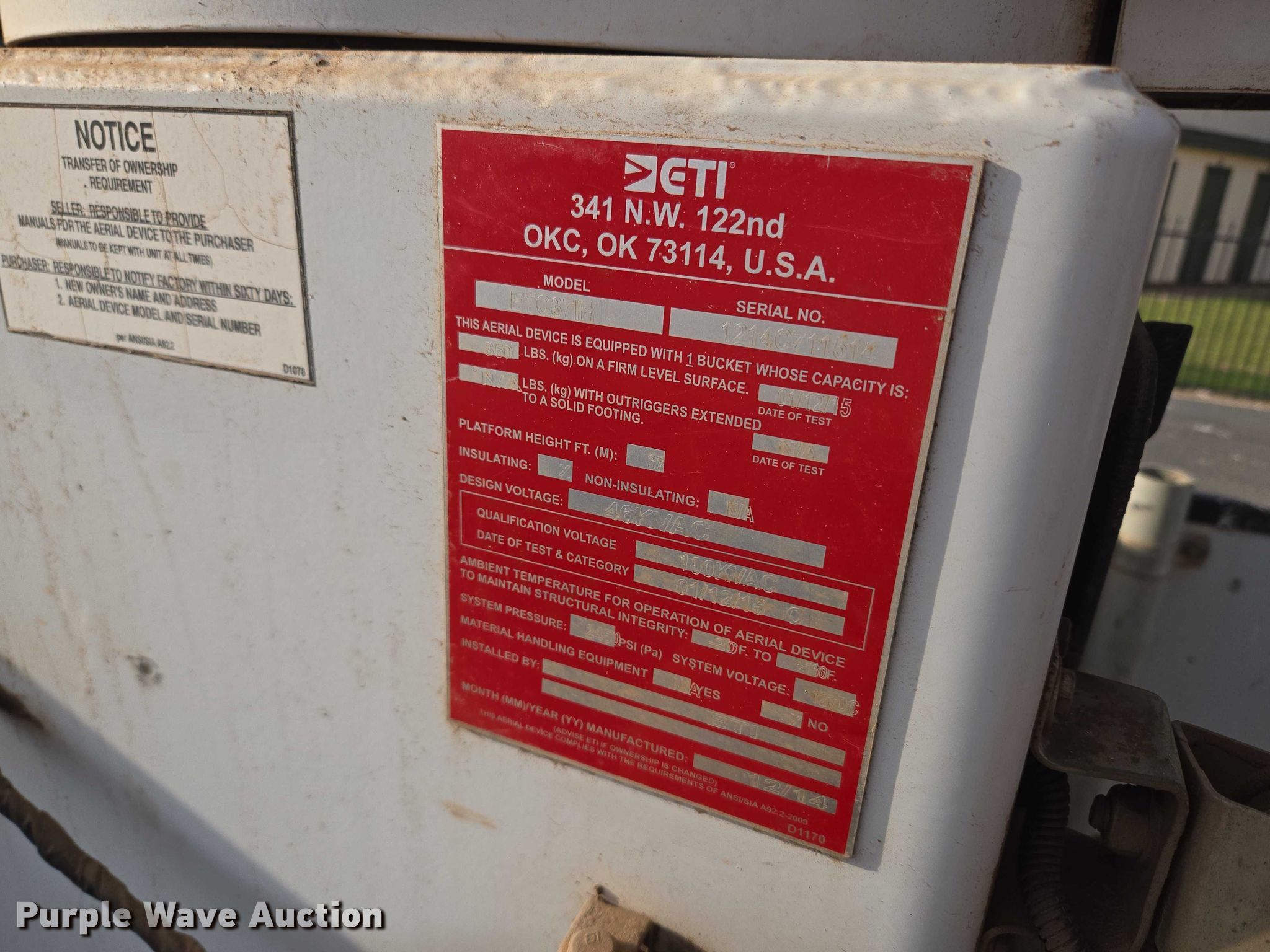 2015 RAM 5500 Crew Cab bucket truck. Miles: 188,560 on odometer, VIN: 3C7WRNEL2FG559203. Engine Cummins, Displacement: 6.7L, Cylinders: 6, Fuel type: Diesel. Transmission Automatic. Chassis Four wheel drive, Axles: Single, Suspension: Spring, Brakes: Hydraulic, PTO, GVWR: 19,000 lbs. Interior AC, Heat, Heated mirrors, Power windows, Power locks, Cruise control, Auxiliary controls. Features Bed Utility bed, Length: 12', Width: 96", Boom 2015 ETI ETC37H, Serial: 1214C711514, Boom length: 37', Maximum lift capacity: 350 lbs, Maximum lift height: 37', Boom type: Articulating, Insulated, Telescopic, Man basket, Boom controls Ground, Platform/ basket.. Tires Size: 225/70R19.5. Notes Dash warning indicator: Coolant low, Ball joint issues, Wheel bearing issues. Oklahoma title. Title distribution may be delayed up to 14 days from verification of funds. Alfalfa Electric Cooperative, Inc.. Cherokee, OK 73728