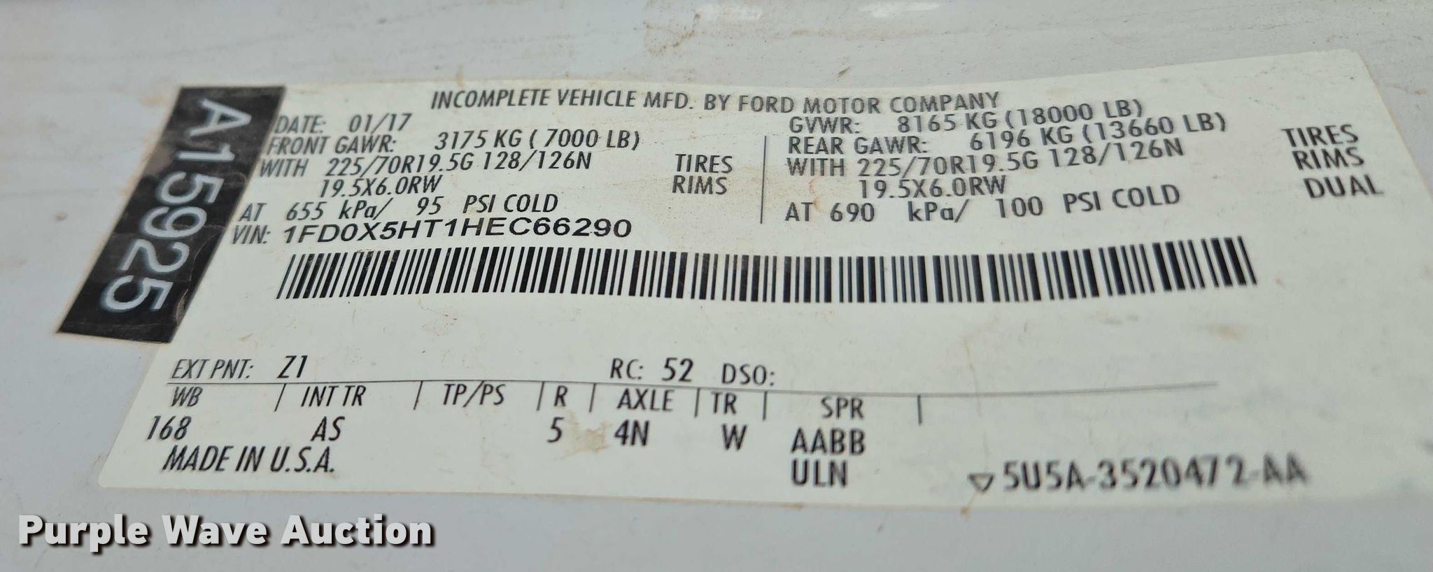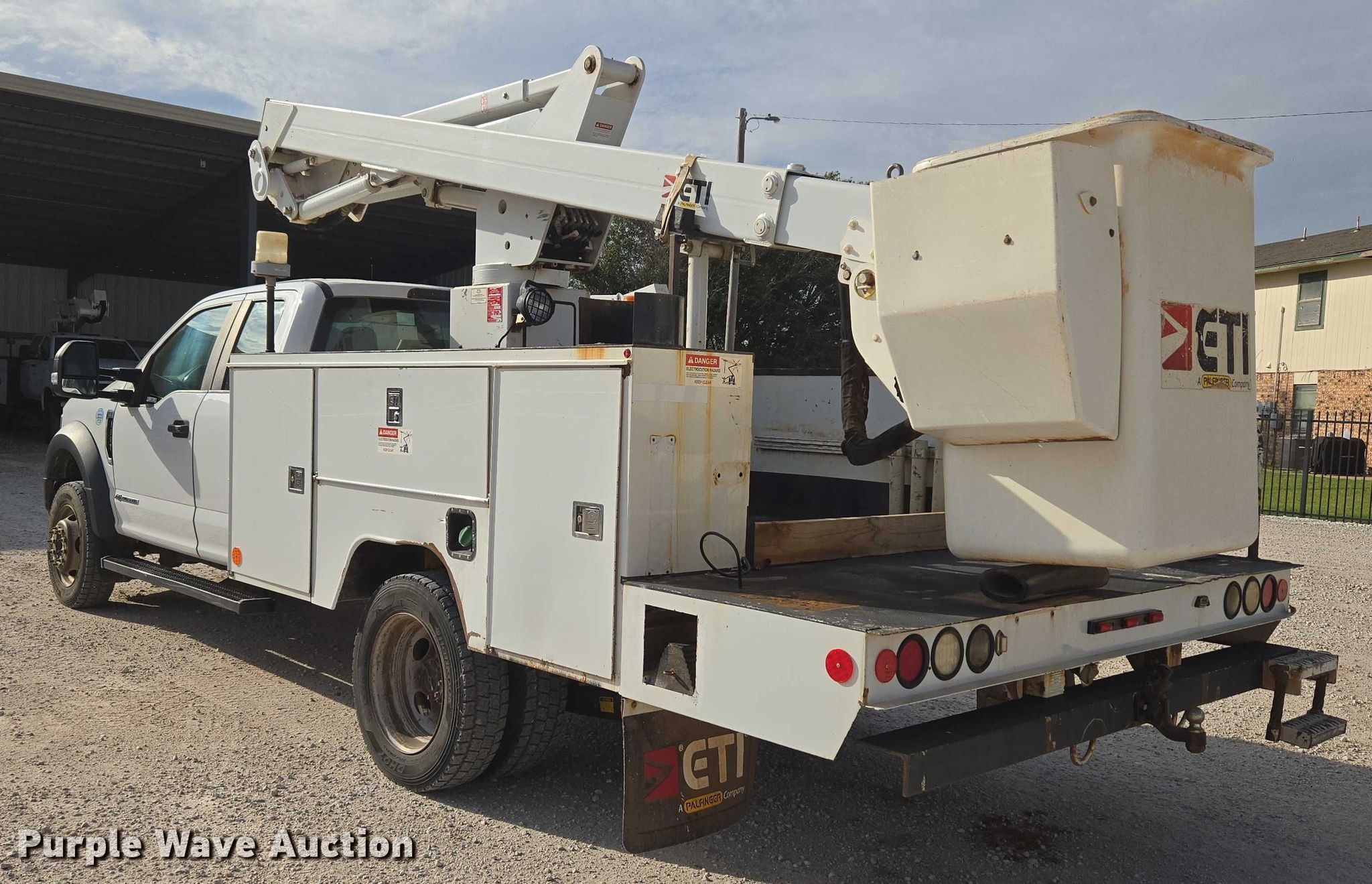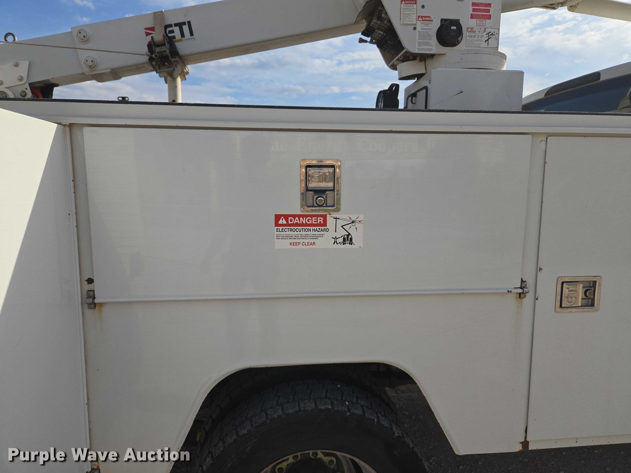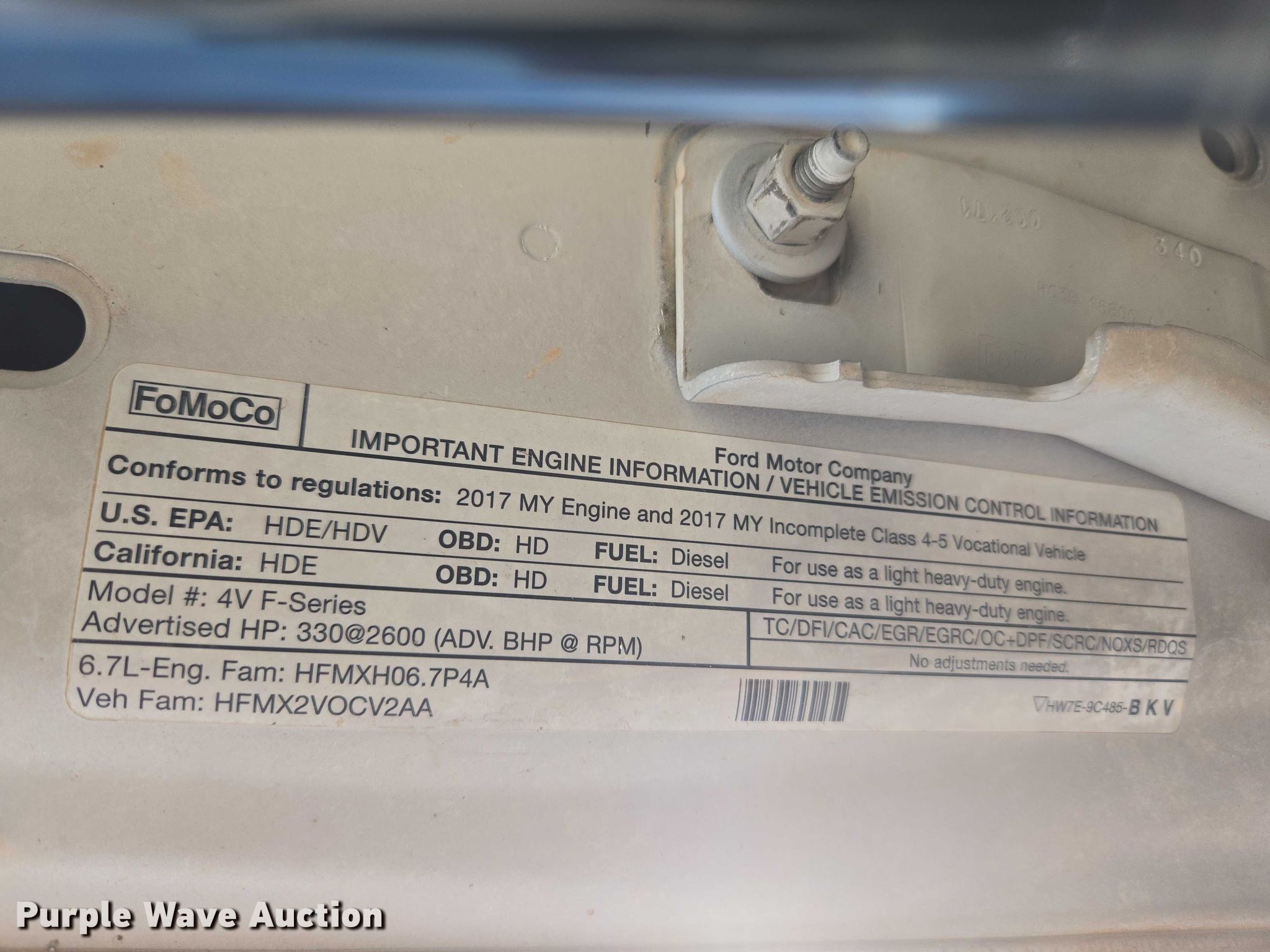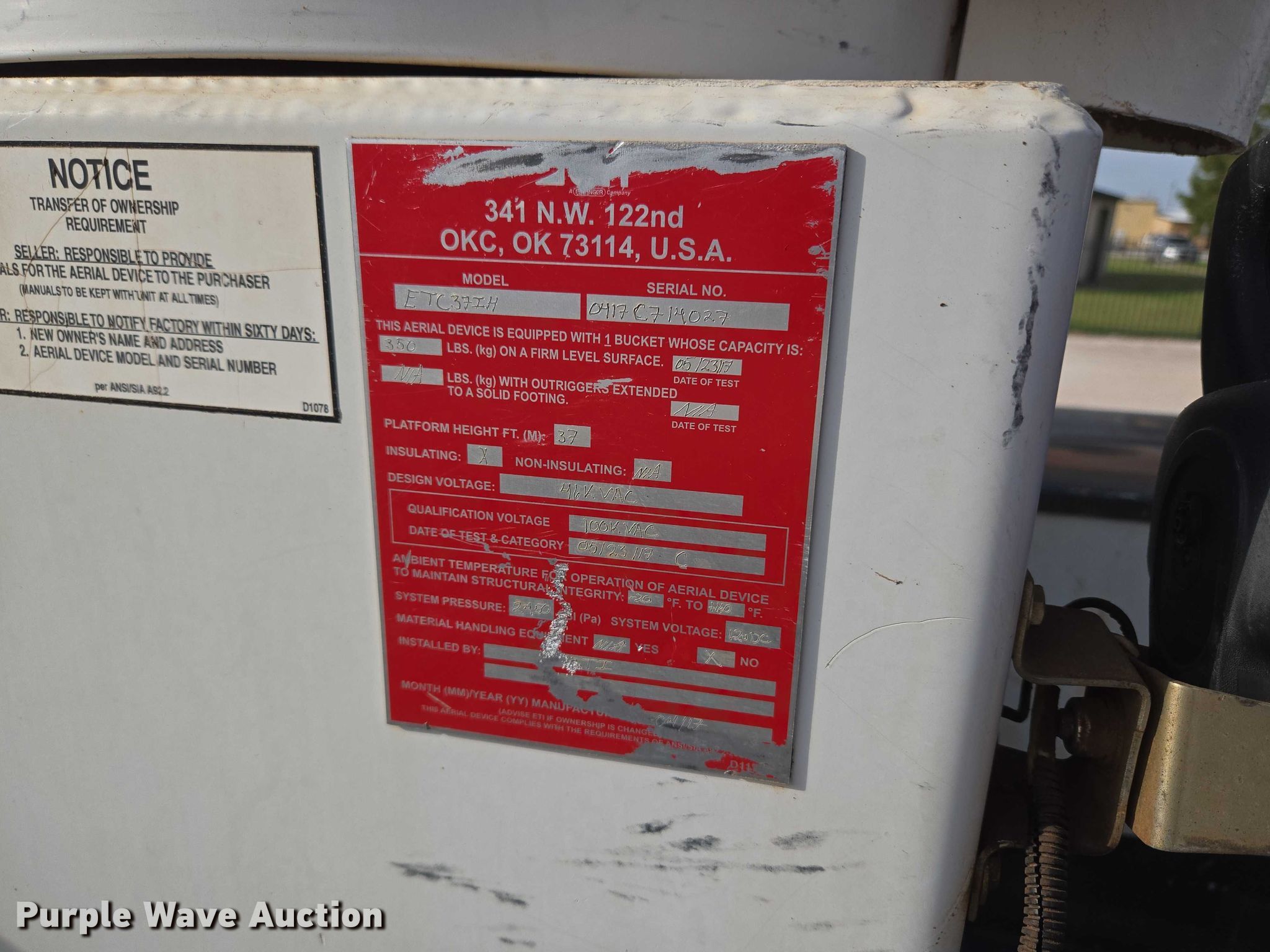2017 Ford F550 SuperCab bucket truck. Miles: 181,814 on odometer, VIN: 1FD0X5HT1HEC66290. Engine Displacement: 6.7L, Cylinders: 8, Fuel type: Diesel. Transmission Automatic. Chassis Four wheel drive, Axles: Single, Suspension: Spring, Brakes: Hydraulic, PTO, GVWR: 18,000 lbs. Interior AC, Heat, Heated mirrors, Power windows, Power locks, Cruise control. Features Bed Utility bed, Length: 12', Width: 96", Boom ETI ETC37IH, Serial: 0417C714027, Boom length: 37', Maximum lift capacity: 350 lbs, Maximum lift height: 37', Boom type: Articulating, Insulated, Telescopic, Man basket, Boom controls Ground, Platform/ basket.. Tires Size: 225/70R19.5. Notes Four wheel drive issues, Rear differential issues. Oklahoma title. Title distribution may be delayed up to 14 days from verification of funds. Alfalfa Electric Cooperative, Inc.. Cherokee, OK 73728