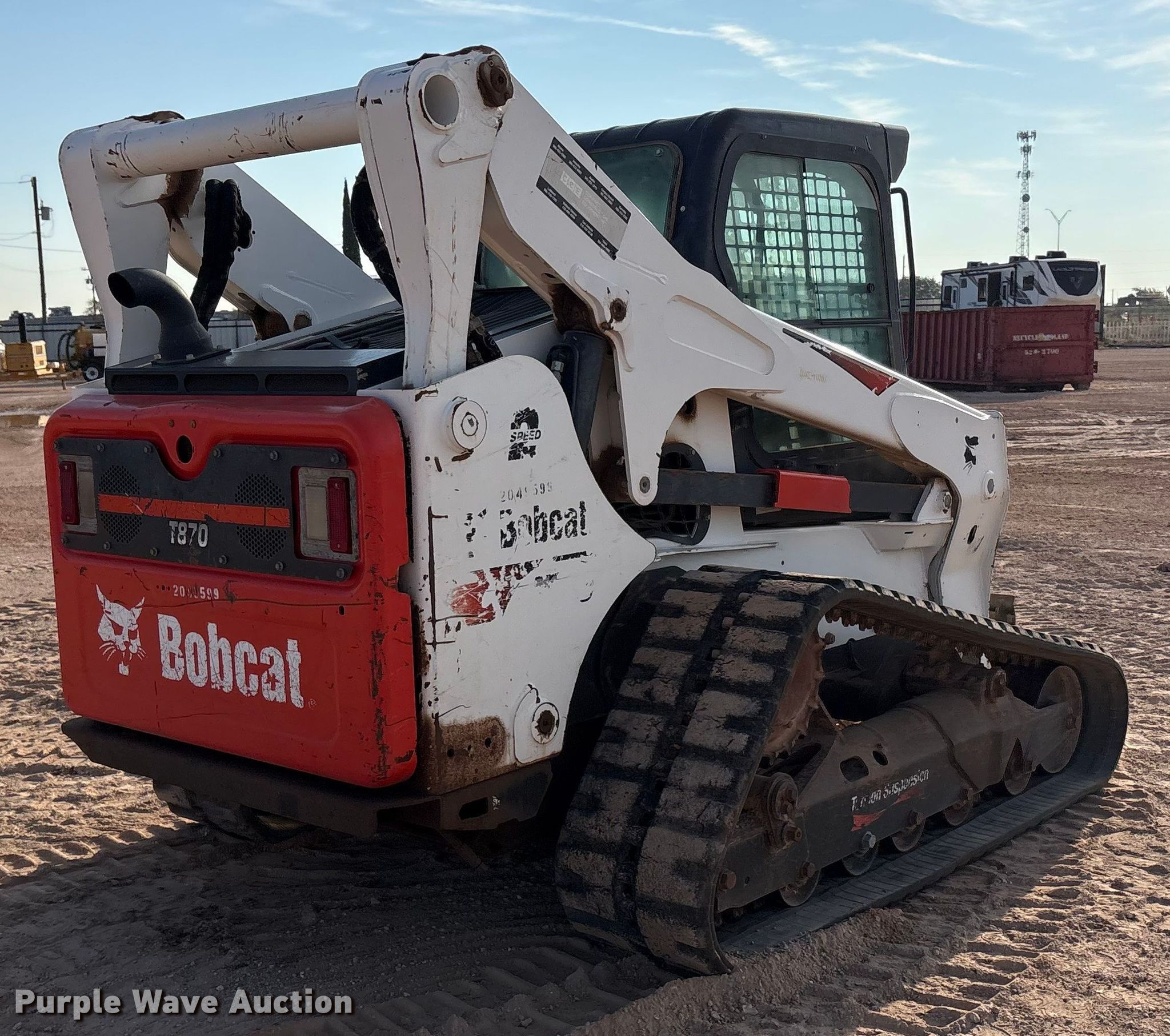 Purple Wave is selling a used Tracked Skid Steer Loader in Texas. This item is a 2019 Bobcat T870 tracked skid steer loader with the following: Hours: 2,971 on meter, Serial: B47C13135, Unit #: 2049599