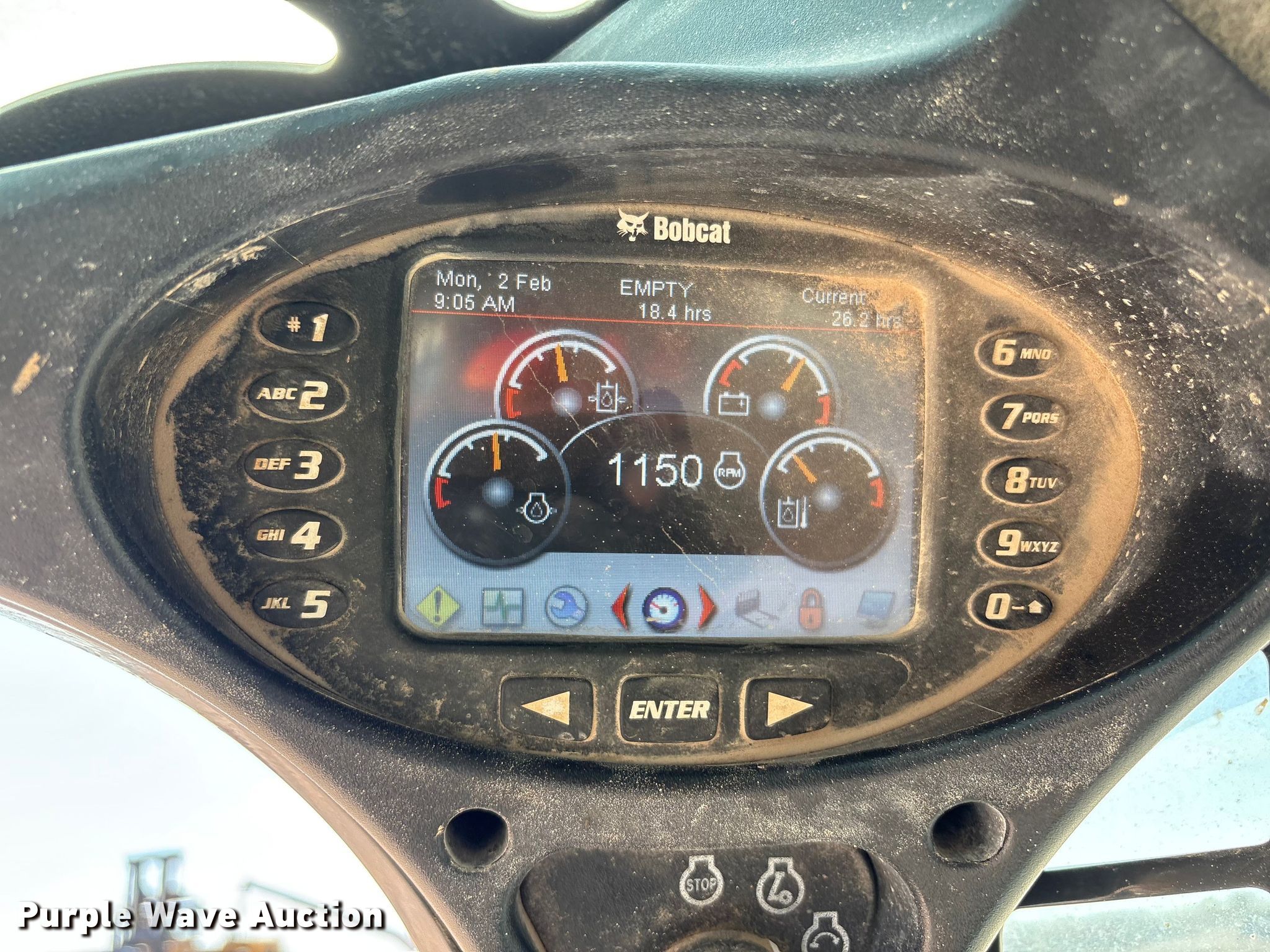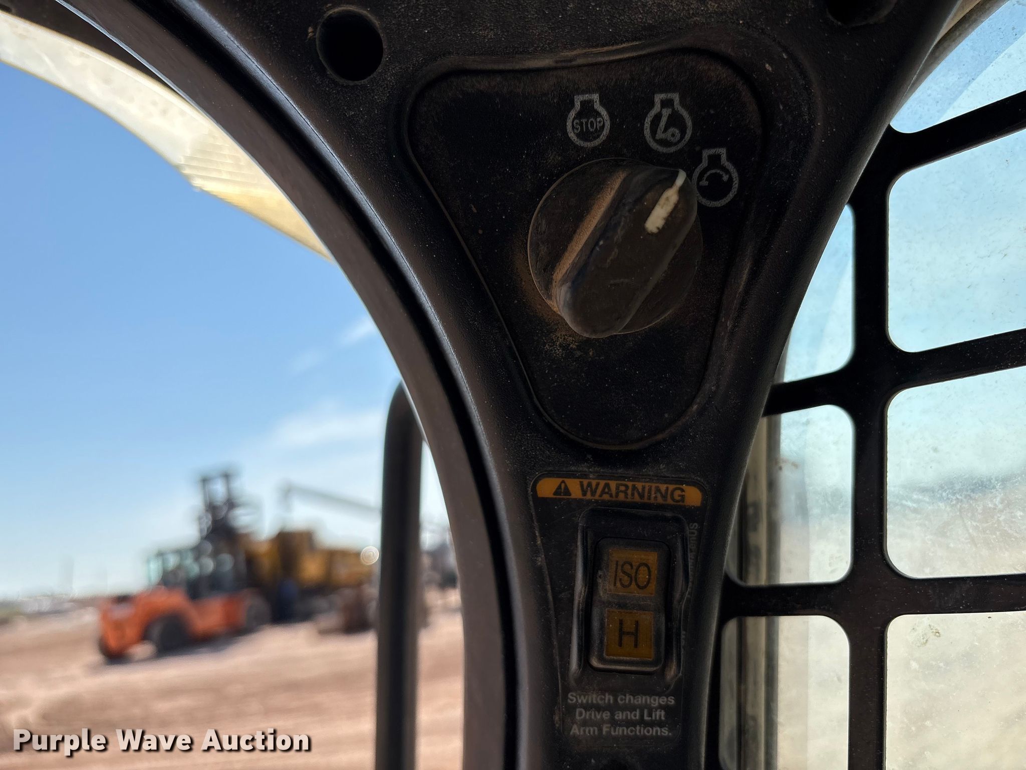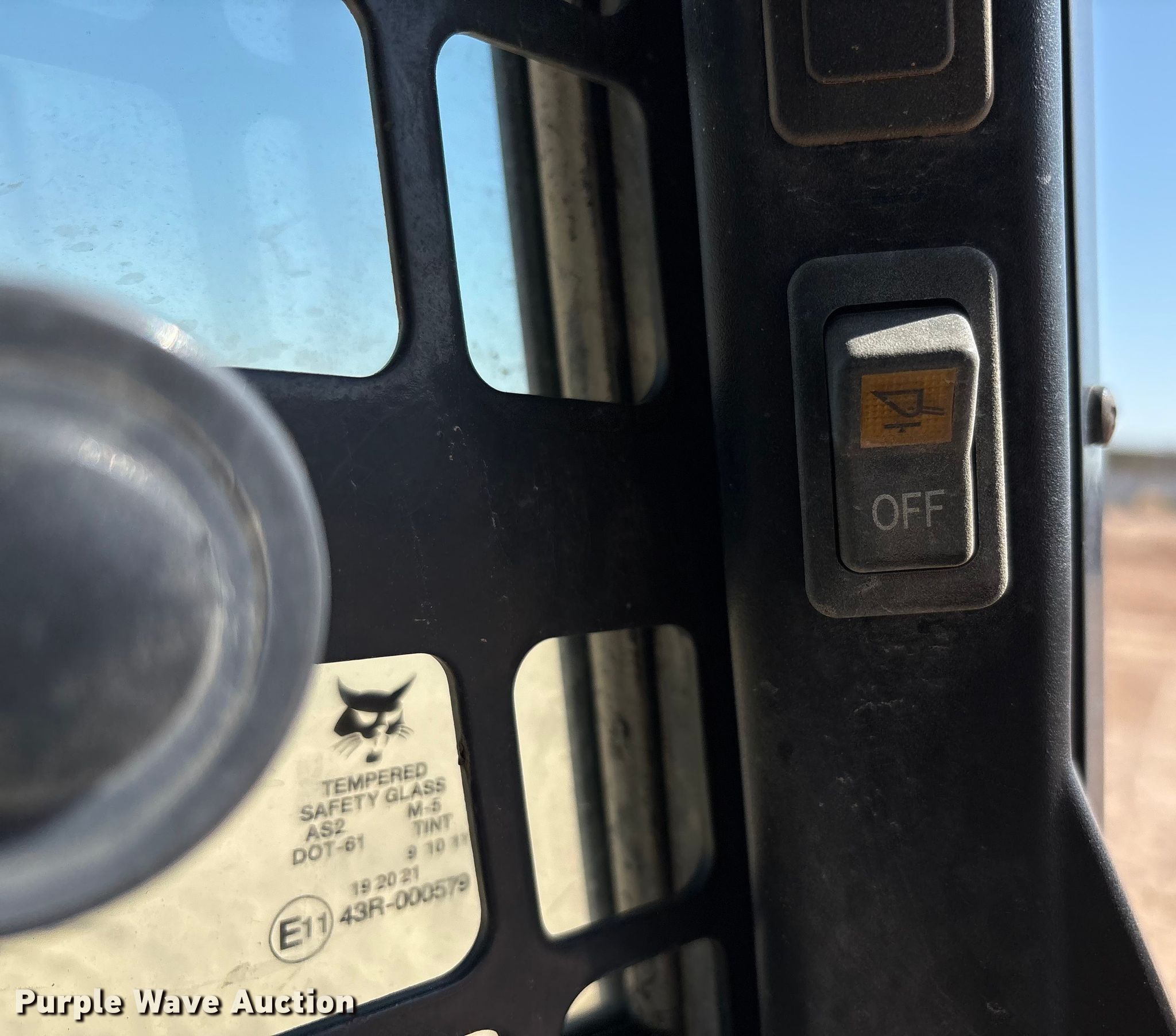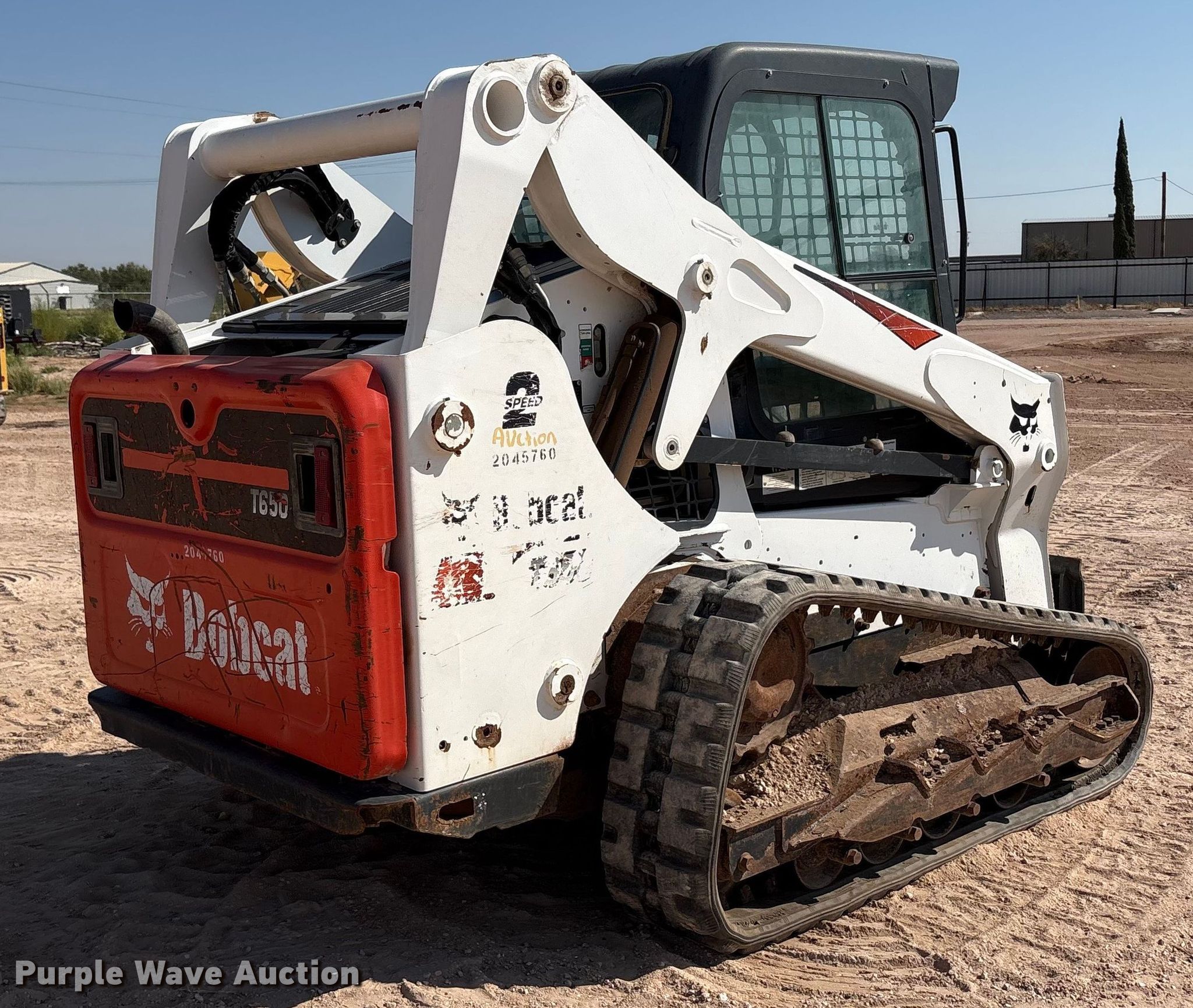 2018 Bobcat T650 tracked skid steer loader. Hours: 3,347 on meter, Serial: ALJG26672, Unit #: 2045760. Engine Bobcat, Cylinders: 4, Fuel type: Diesel. Transmission Hydrostatic, Two speed travel. Operators station Enclosed cab, OROPS, AC, Heat, Bucket control: Hand, Pattern changer, Electronic Monitoring System panel. Features Auxiliary hydraulics, Auxiliary electrical outlet, Quick coupler: Manual. Tracks Width: 13". Notes Door missing. Bobcat/CCE. Midland, TX 79706