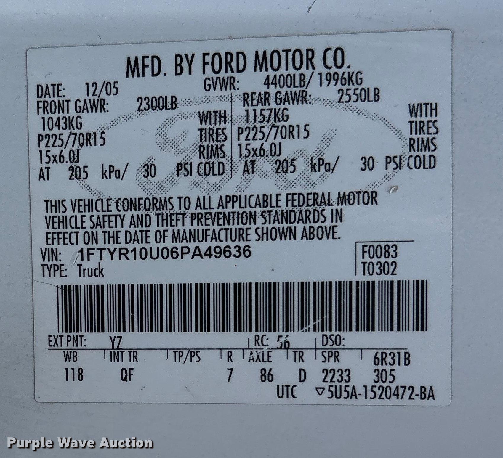 Purple Wave is selling a used Compact Pickup or Van in Texas. This item is a 2006 Ford Ranger pickup truck with the following: Miles: 201,818 on odometer, VIN: 1FTYR10U06PA49636