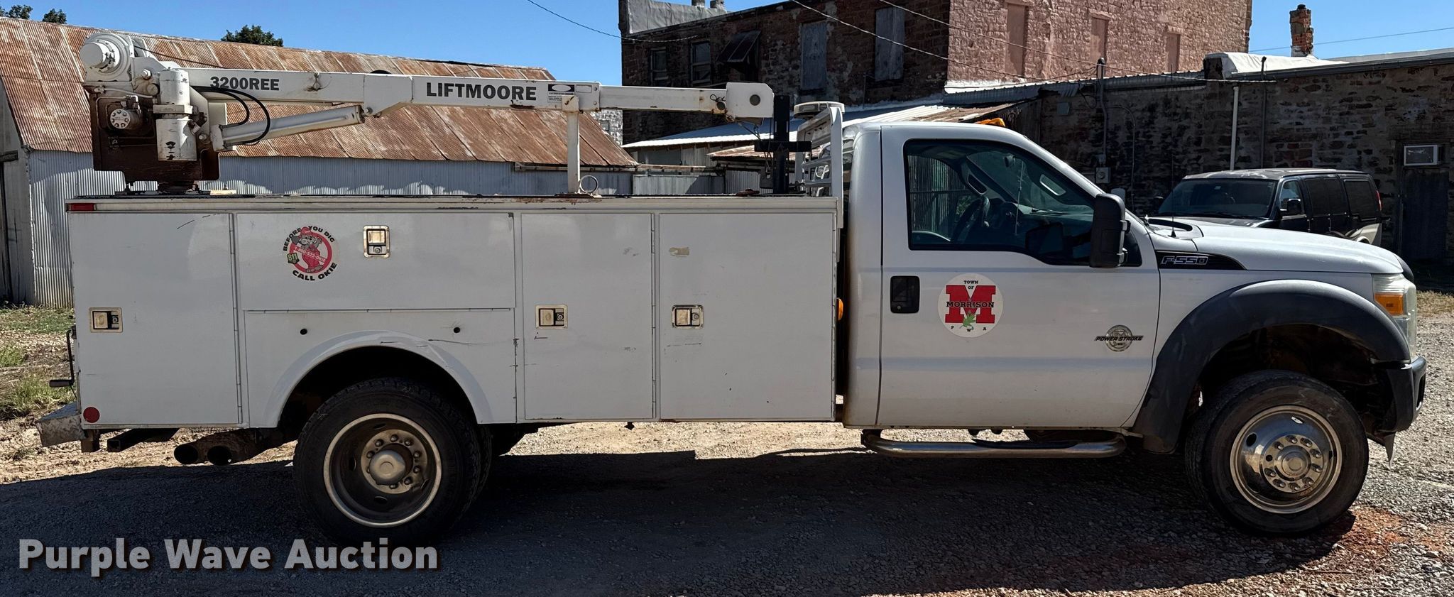 2011 Ford F550 Super Duty utility / service truck. Miles: 197,853 on odometer, VIN: 1FDUF5GT8BEC41609. Engine Displacement: 6.7L V8 OHV, Cylinders: 8, Fuel type: Diesel. Transmission Automatic. Chassis GVWR: 19,500 lbs, Wheelbase: 165". Interior AC, Heat, Auxiliary controls. Features Bed Utility bed, Omaha, Length: 11', Width: 96", Crane Liftmoore 3200REE. Tires Size: 225/70R19.5. Notes Contents not included, Dash warning indicator: Check engine, Windshield chipped or cracked, Hail damage, Jump start required during on-site data collection. Oklahoma title. Title distribution may be delayed up to 30 days from verification of funds. Town of Morrison. Morrison, OK 73061