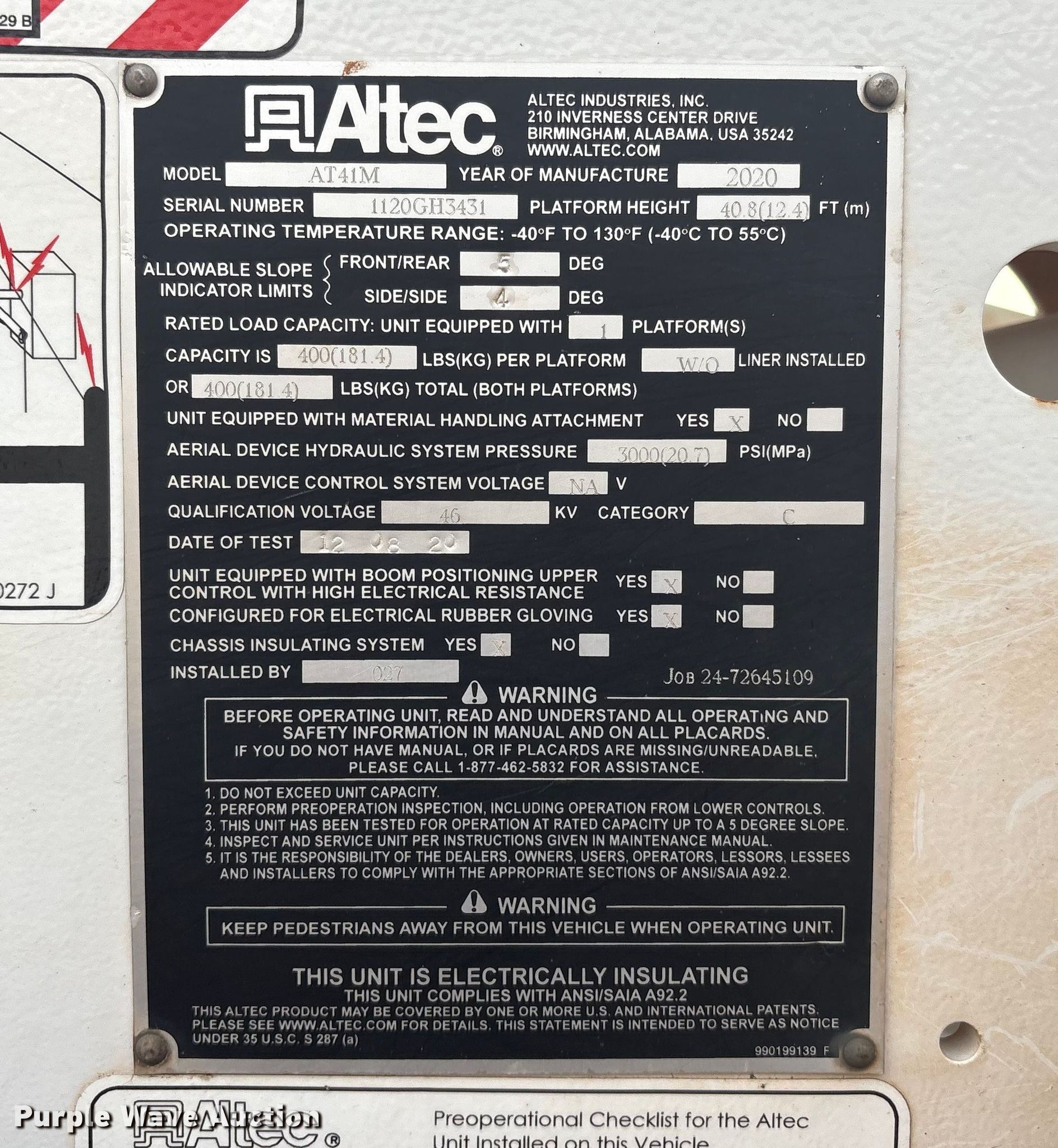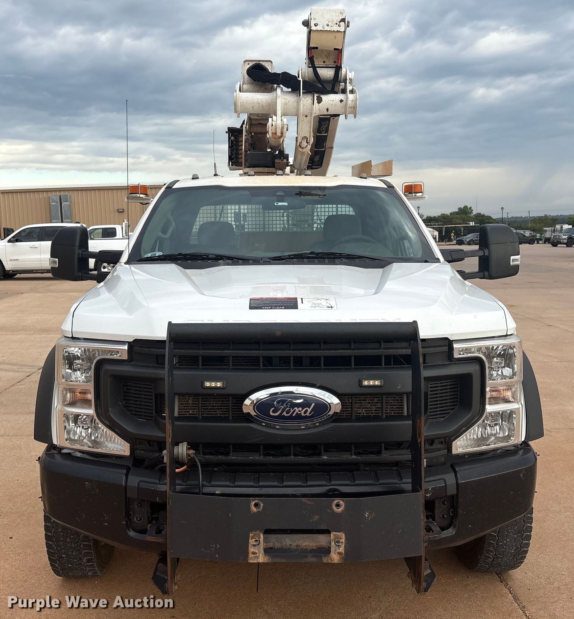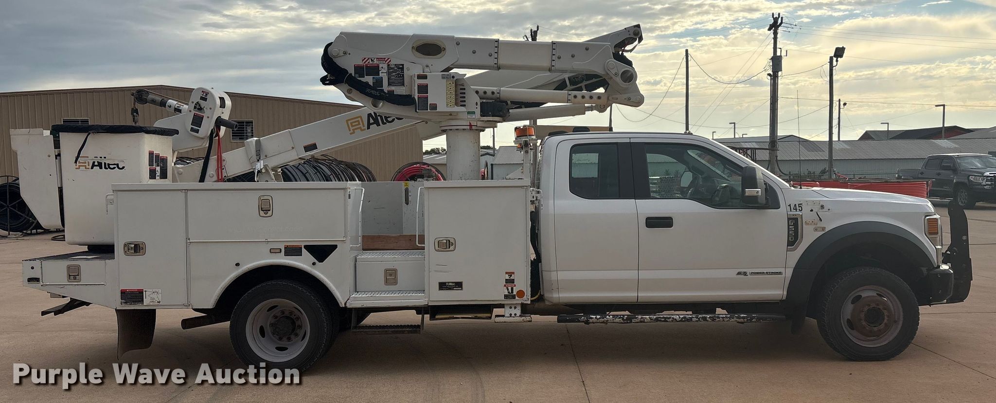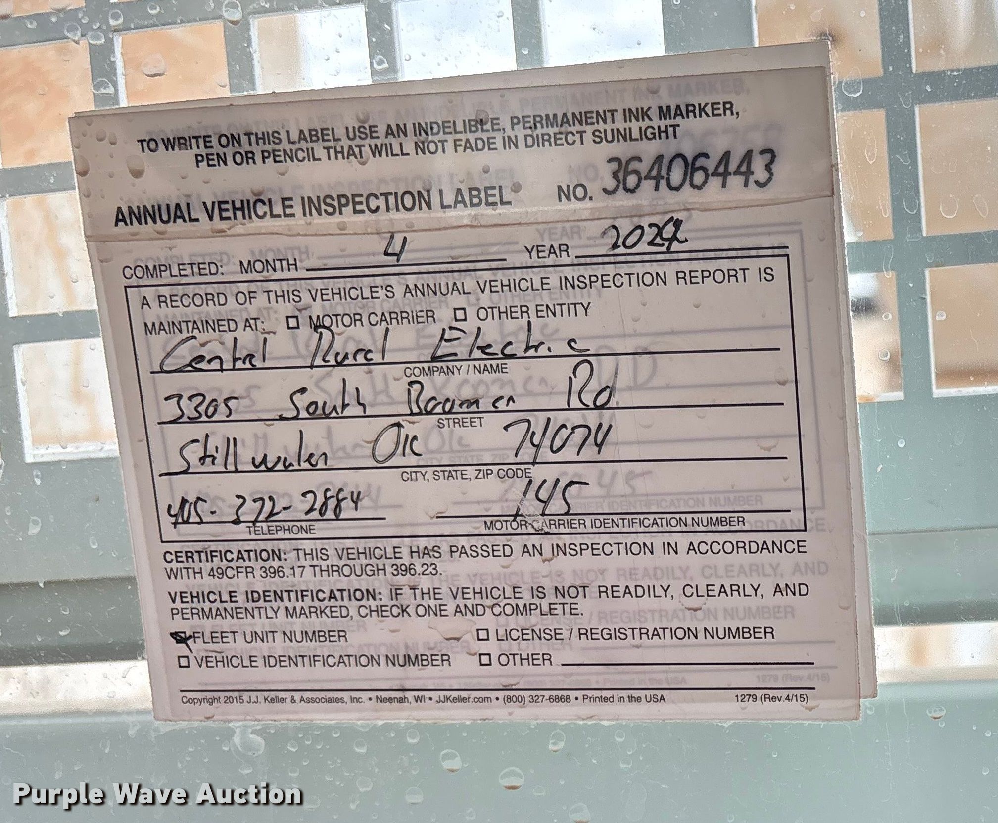 2020 Ford F550 SuperCab bucket truck. Miles: 212,703 on odometer, VIN: 1FD0X5HT0LEE90773. Engine Displacement: 6.7L, Cylinders: 8, Fuel type: Diesel. Transmission Automatic. Chassis Four wheel drive, Axles: Single, Suspension: Spring, Brakes: Hydraulic, PTO, Wet kit, GVWR: 7,500 lbs, Wheelbase: 192". Interior AC, Heat, Heated mirrors, Power windows, Power locks, Cruise control, Backup camera, Auxiliary controls, Brake controller. Features Bed Utility bed, Altec Industries Inc. 000870701-990399464, Serial: 856-76282428, Length: 13' 4", Width: 94", Boom 2020 Altec AT41M, Serial: 1120GH3431, Mast height: 41', Maximum lift capacity: 400 lbs, Boom type: Articulating, Insulated, Telescopic, Man basket, Boom controls Ground, Platform/ basket, Material handler, Certification valid through: 12/2025. Tires Size: 225/70R19.5. Notes Dash warning indicator: Check engine, Windshield chipped or cracked. Oklahoma title. Title distribution may be delayed up to 14 days from verification of funds. Central Rural Electric Cooperative, Inc.. Stillwater, OK 74074