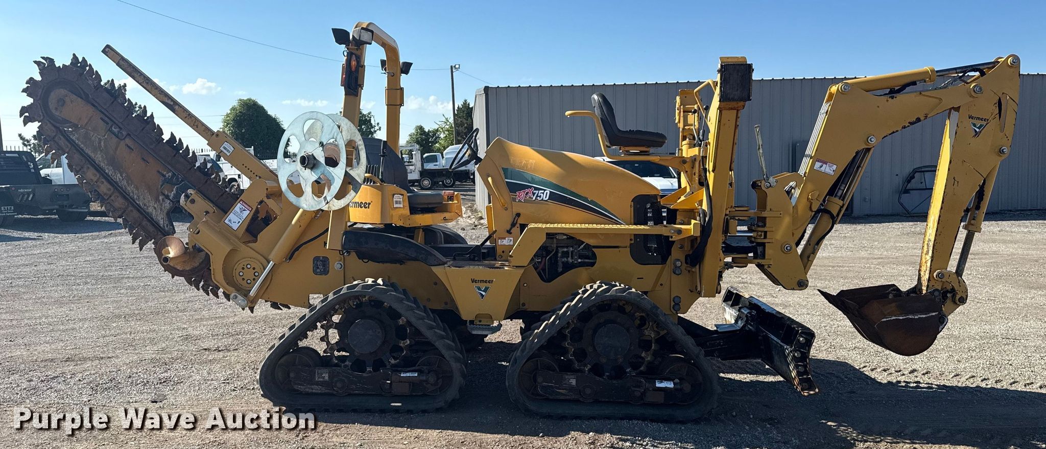 2015 Vermeer RTX750 trencher. Hours: 1,678 on meter, Serial: 1VR9110M2F1003045. Engine Deutz TD 2.9 L4, Serial: 11682454, Displacement: 2.925L, Cylinders: 4, Fuel type: Diesel, HP: 84, kW: 55. Transmission Hydrostatic, Two speed travel. Chassis Differential lock, Four wheel steer. Operators station OROPS. Features Trencher Model: TR750, Serial: 1VR9030TXF1001100, Estimated dig depth: 72", Cutting width: 6", Teeth: Dirt, Backhoe Model: B750, Serial: 1VR9060N6F1001131, Bucket width: 17", Backfill blade Width: 79". Tracks Width: 18", Rubber. Collinsville, OK 74021