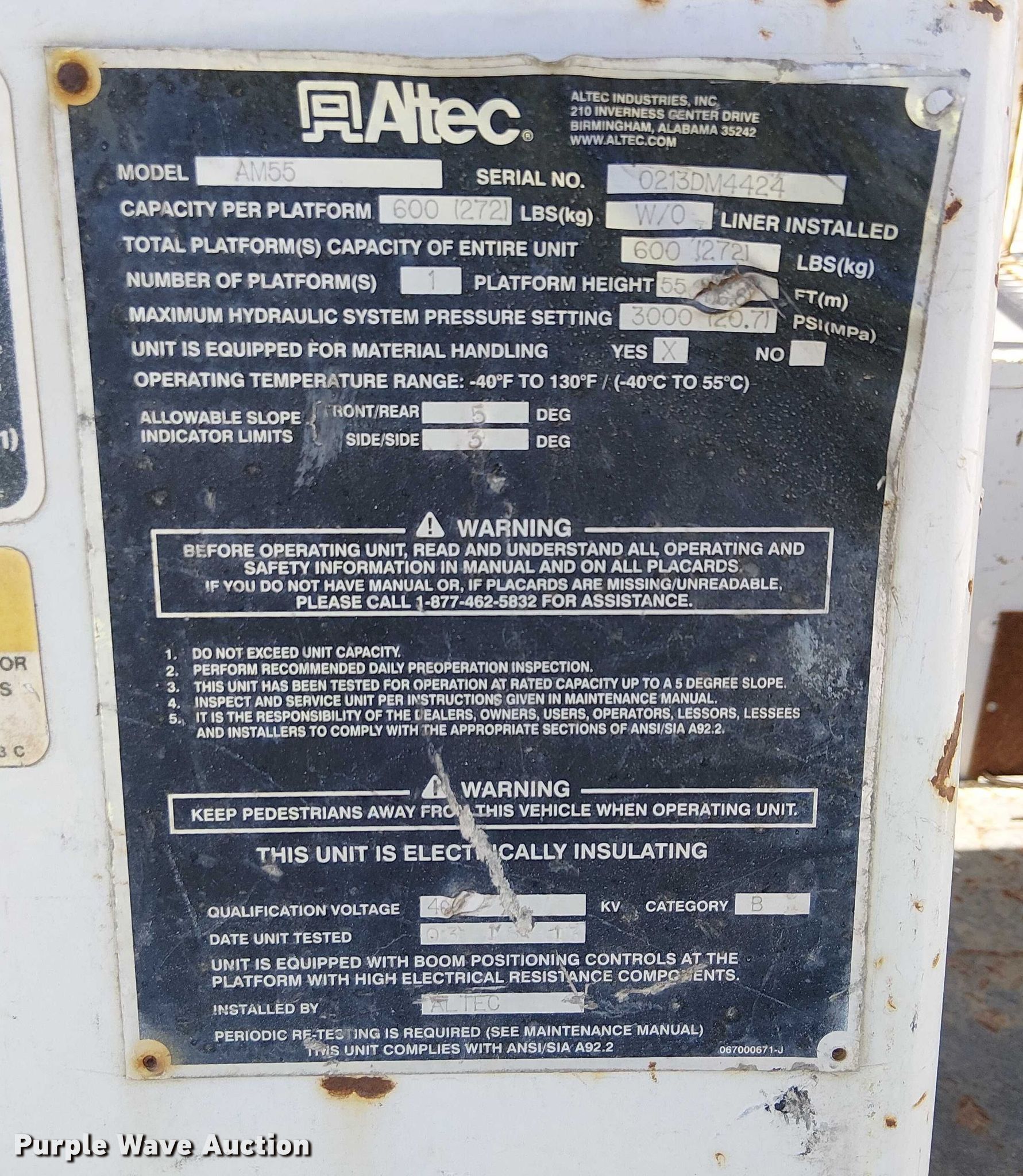 2013 International 7300 bucket truck. Miles: 75,355 on odometer, VIN: 1HTWBAAN1DJ364175, Unit #: 69572495. Engine International, Displacement: 7.6L, Cylinders: 6, Fuel type: Diesel. Transmission Allison, Automatic. Chassis Four wheel drive, Axles: Single, Suspension: Spring, Brakes: Air, PTO, GVWR: 33,000 lbs. Interior AC, Heat, Cruise control, Brake controller. Features Bed Altec, Serial: 37-24920685, Length: 16', Width: 94", Height: 137", Boom Altec AM55, Serial: 0213DM4424, Boom length: 55', Maximum lift capacity: 600 lbs, Boom type: Articulating, Insulated, Man basket, Boom controls Ground, Platform/ basket, Material handler, Diameter: 76". Tires Size: 11R22.5. Fleet inventory reduction, stored at a secured facility. Please review REQUIRED REMOVAL INSTRUCTIONS. Buyer responsible for all aspects of state emissions compliance. Titles will be distributed after confirmation of payment and removal. California title. Title distribution may be delayed up to 30 days from verification of funds. Henkels & McCoy West. Colton, CA 92324