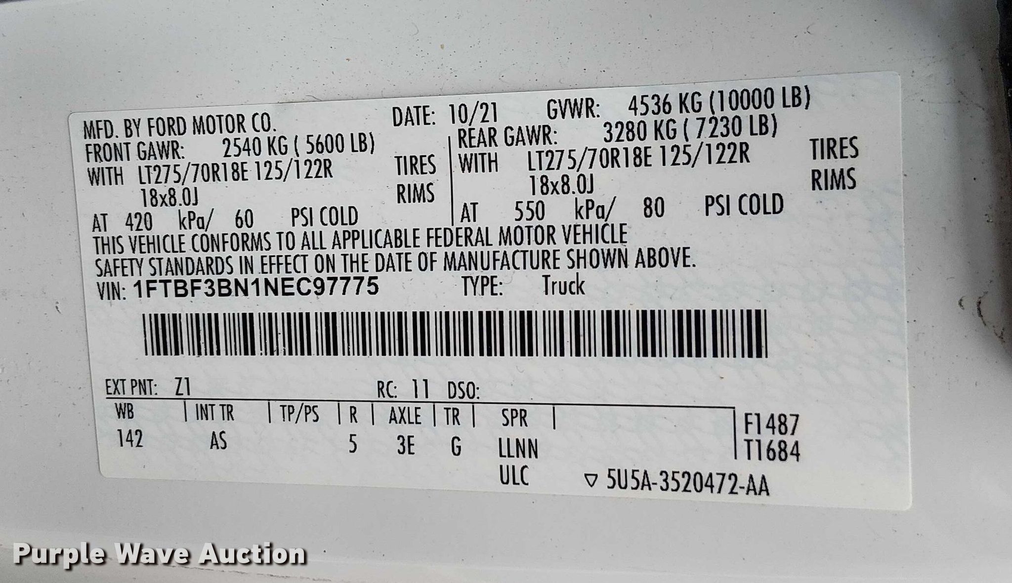 2022 Ford F350 Super Duty pickup truck. Miles: 23,676 on odometer, VIN: 1FTBF3BN1NEC97775. Engine Displacement: 7.3L V8 SOHC, Cylinders: 8, Fuel type: Gas. Transmission Automatic, Four wheel drive. Interior AC, Heat, Power windows, Power locks, Cruise control, Backup camera. Tires Size: 275/70R18. Notes Non-operational backup camera. New York title. Title has a lien that will be released following the close of the auction. Title distribution may be delayed up to 60 days from verification of funds. East End Group Inventory Reduction. Yaphank, NY 11980