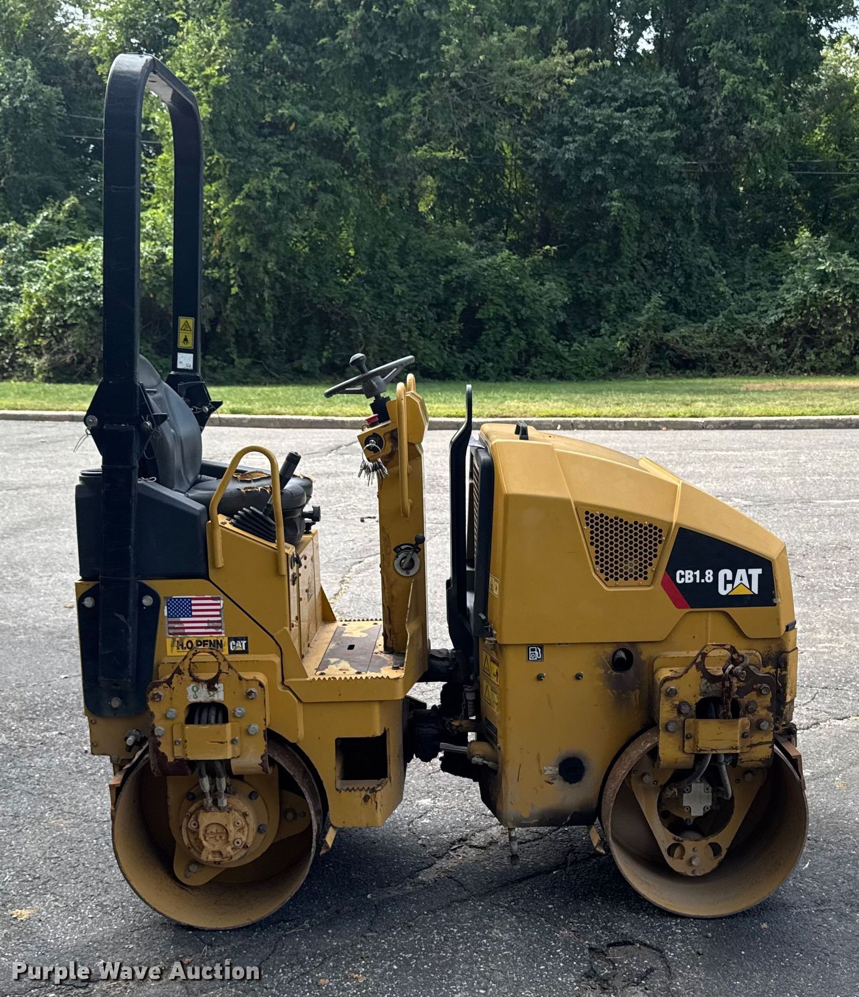 2019 Caterpillar CB1.8 double drum vibratory roller. Hours: 1,163 on meter, Serial: CAT0CB18KERX00188. Engine Caterpillar C1.1, Displacement: 1.13L, Cylinders: 3, Fuel type: Diesel. Transmission Hydrostatic. Operators station OROPS, Vandal cover. Features Drum type: Smooth, Vibratory system: Double, Independent drum controls, Front drum Width: 39", Diameter: 22", Rear drum Width: 39", Diameter: 22", Drum scrapers: Front, Rear, Water spray applicator: Front, Rear, Dual propel system. Notes Key not included. East End Group Inventory Reduction. Yaphank, NY 11980