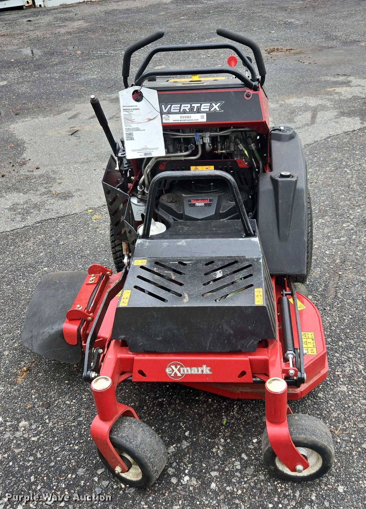 Exmark Vertex ZTR lawn mower. Hours: 30 on meter, Cutting width: 36", Serial: 417993595. Engine Kawasaki FS600V, Cylinders: 2, Fuel type: Gas. Transmission Hydrostatic. Features Stand on. Tires Front: 9x4.50-5, Rear: 21x8.50-10. East End Group Inventory Reduction - Open inspection October 16th and 17th from 9 a.m. to 4 p.m.. 124 Sills Road. Yaphank, NY 11980