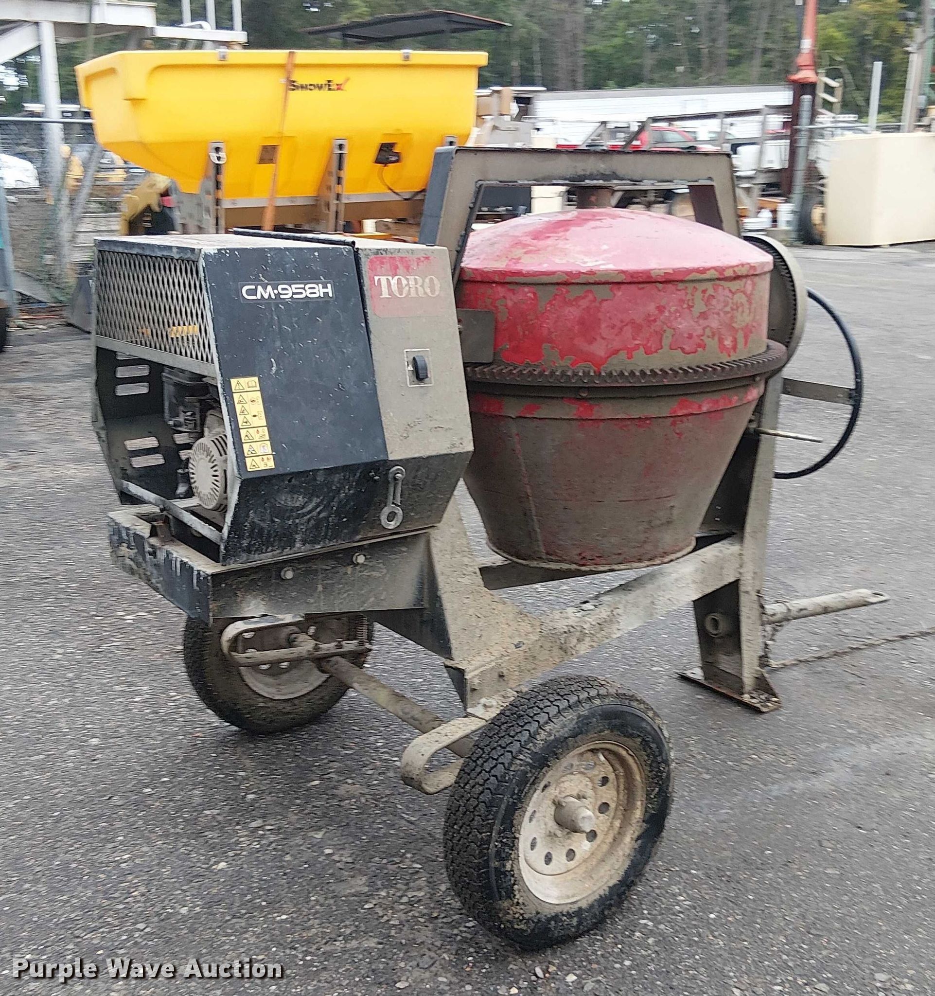 Toro CM 958H concrete mixer. Engine. Honda, Cylinders: 1, Fuel type: Gas. Tires Size: 175/80D13. East End Group Inventory Reduction - Open inspection October 16th and 17th from 9 a.m. to 4 p.m.. 124 Sills Road. Yaphank, NY 11980