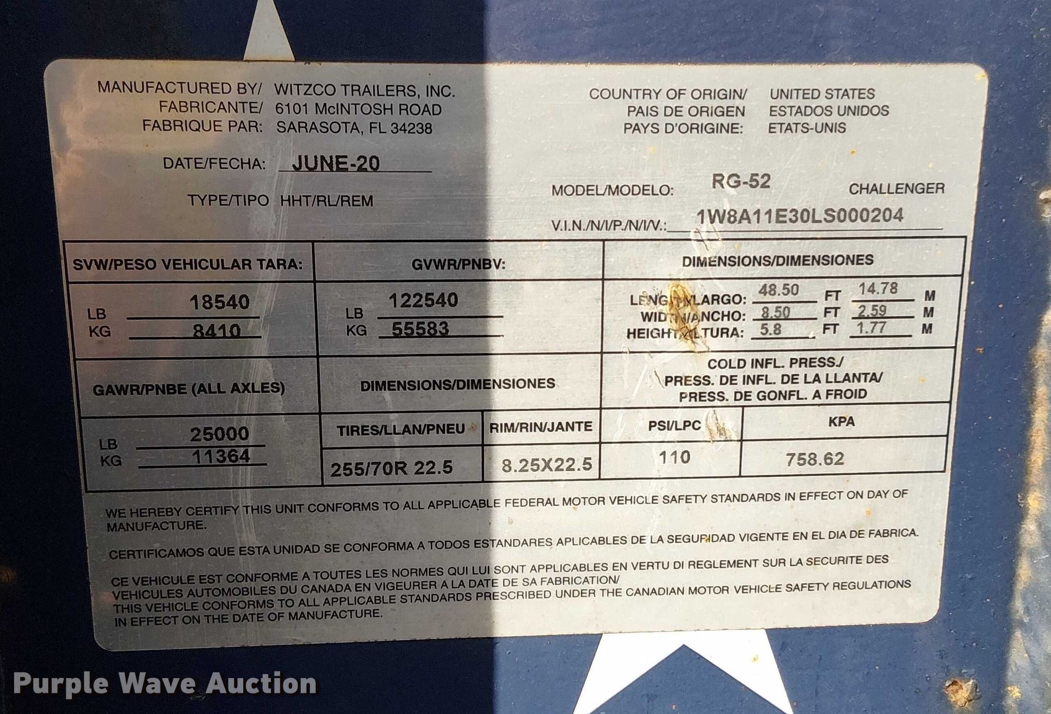 2020 Witzco lowboy equipment trailer. VIN: 1W8A11E30LS000204. Dimensions Overall Length: 48' 4", Width: 102", Deck Length: 22' 5", Width: 101", Rear deck length: 14' 9". Features Deck type: Wood, Outriggers: Swing-out Board size: 12", Hydraulic controls: Manual. Chassis Suspension: Spring, Brakes: Air, Axles: Triple, GVWR: 122,540 lbs, GAWR: 25,000 lbs. Tires Steel wheels, Size: 255/70R22.5. New York title. Title distribution may be delayed up to 30 days from verification of funds. East End Group Inventory Reduction. Yaphank, NY 11980