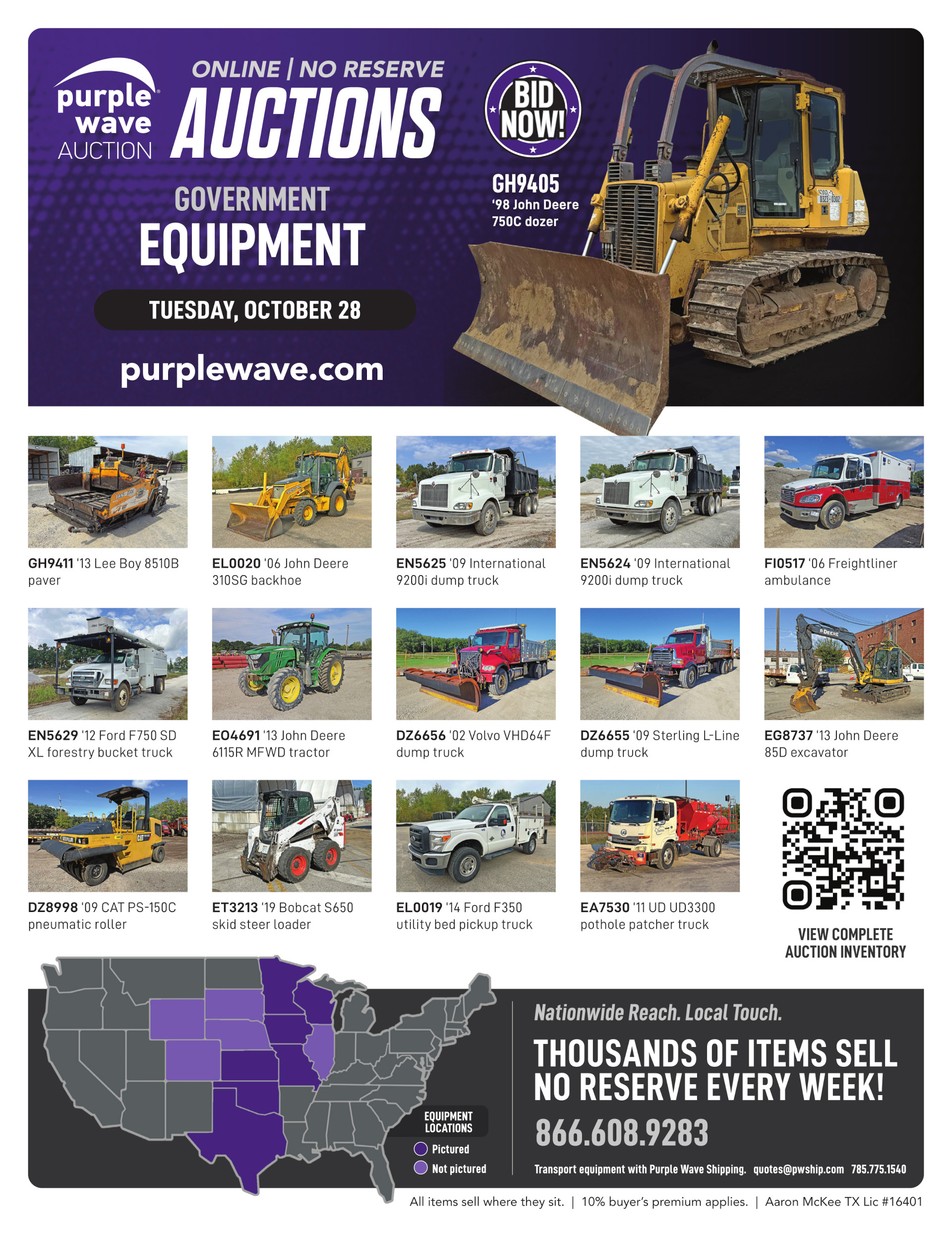 This auction is conducted by Purple Wave, Inc., whose home office is 825 Levee Drive, Manhattan, Kansas. Aaron McKee, Texas auctioneer license # 16401, operates Purple Wave, Inc. Complaints against us may be directed to the Texas Department of Licensing and Regulation, P.O. Box 12157, Austin, Texas 78711, (512) 463-6599. For additional required information, see the attached document.