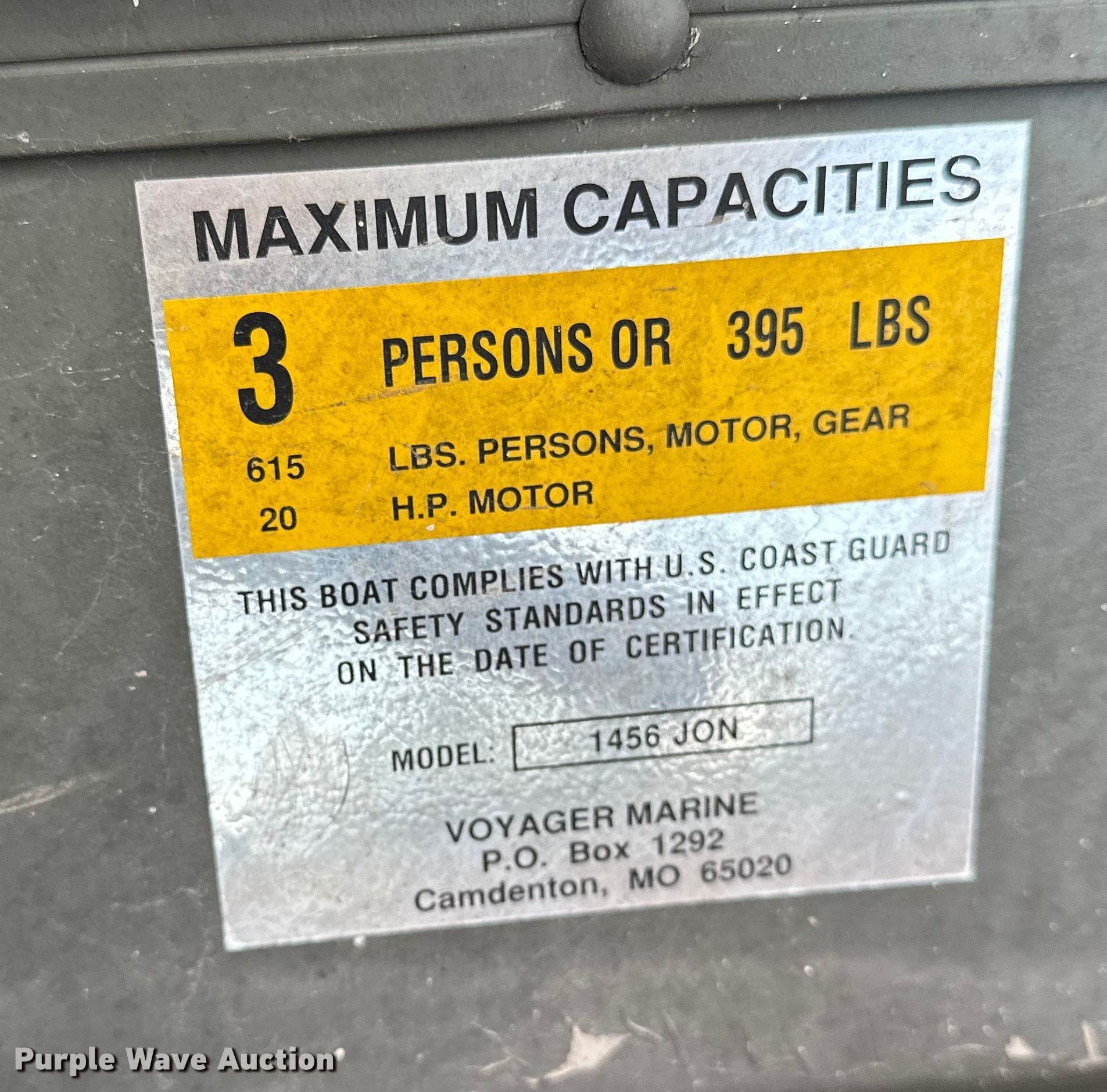Purple Wave is selling a used Boat in Kansas. This item is a Voyager 1456 Jon boat with the following: Hours: Unknown, Length: 14', Unit #: 27872