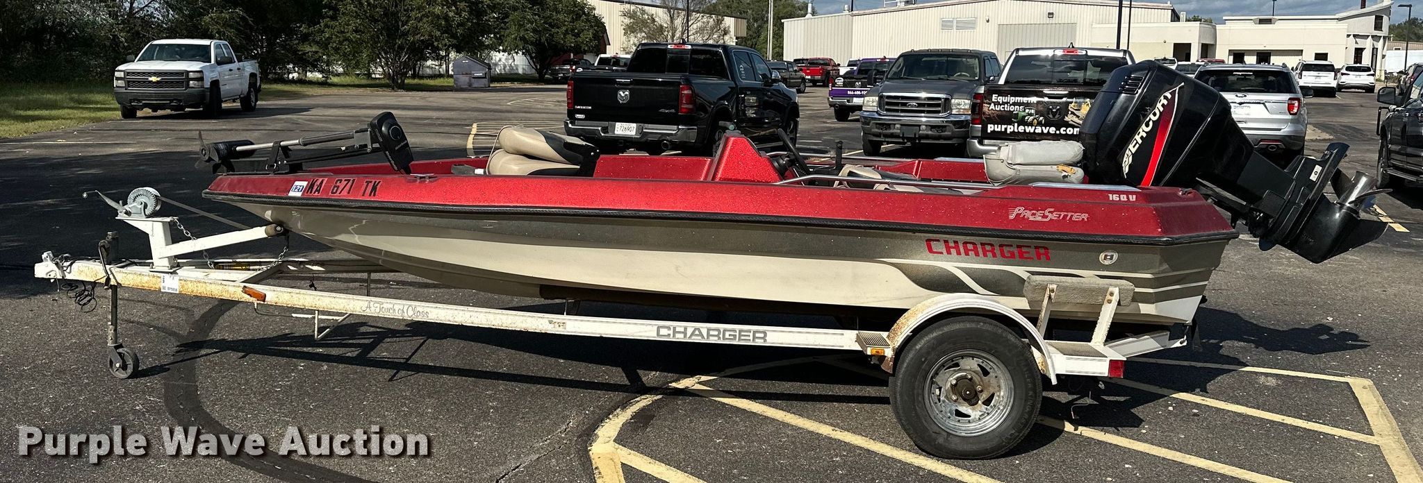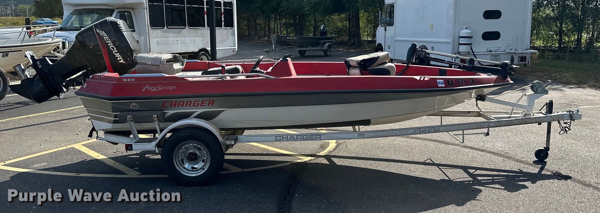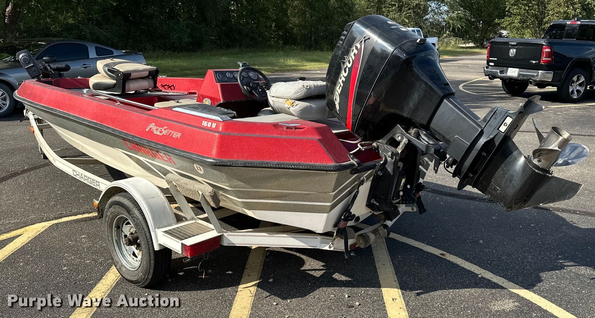 Pacesetter Charger 16 0/B boat. Hours: Unknown, Length: 16'. Engine Engine type: Outboard, Mercury, Serial: 0T010834, Fuel type: Gas, HP: 90. Operators station Capacity Person: 4, 560 lbs. Trailer Charger, Overall length: 18', Ball hitch size: 2", Axles: Single, Tire size: 175/80R13. Notes Possible engine leak, Unknown operating condition. Boat: Transfer of ownership documentation will be a bill of sale. Motor: Transfer of ownership documentation will be a bill of sale. Trailer: Transfer of ownership documentation will be a bill of sale. Kansas Wildlife & Parks. Manhattan, KS 66502