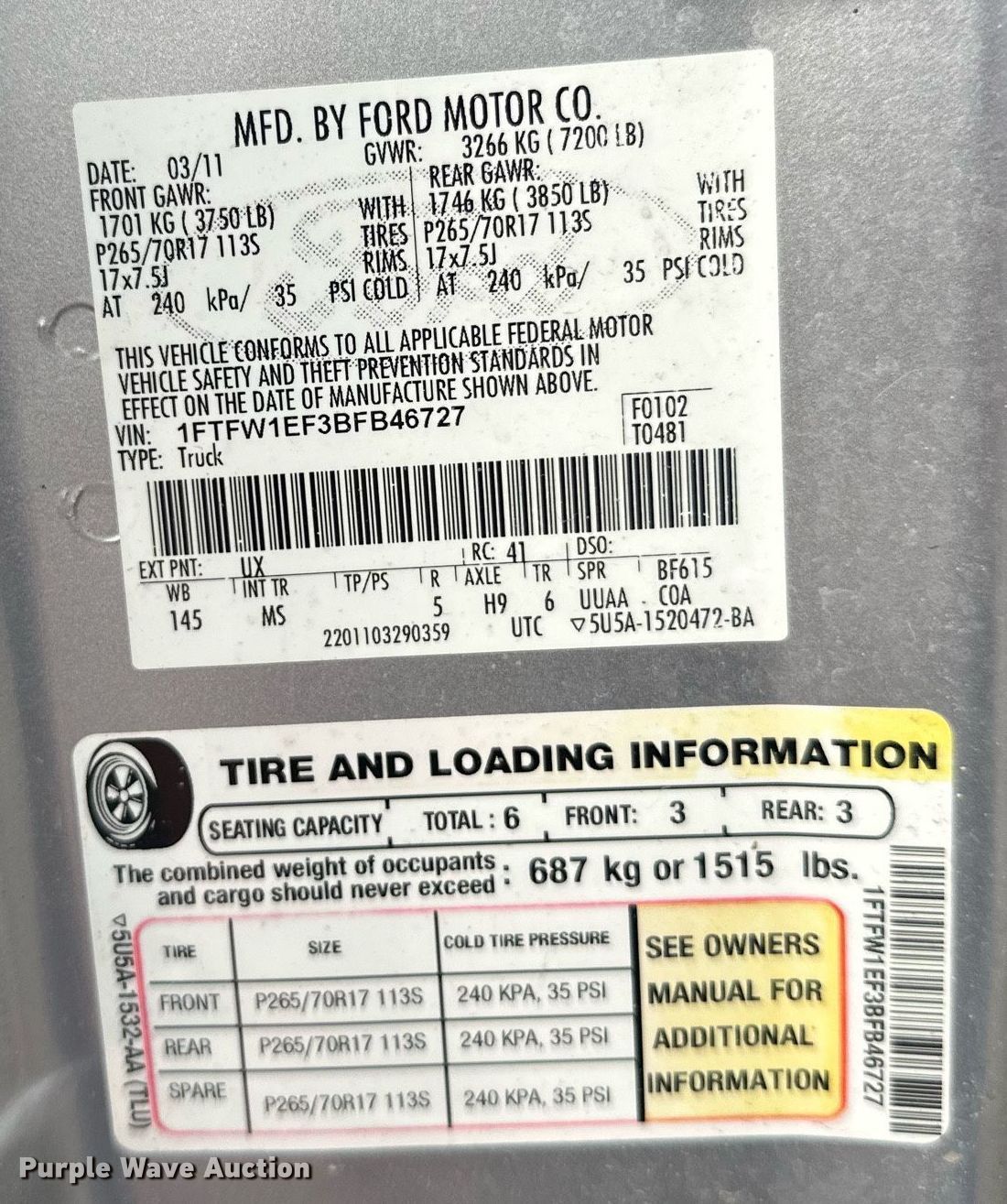 - VIN: 1FTFW1EF3BFB46727