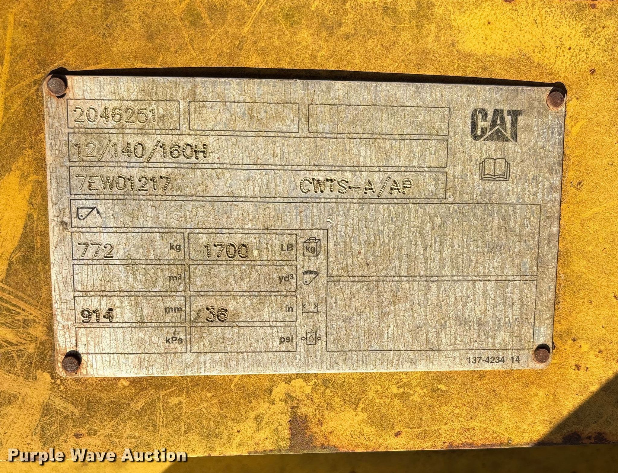 2006 Caterpillar 140H motor grader. Hours: 11,630 on meter, Serial: CAT0140?????02861. Engine Caterpillar, Cylinders: 6, Fuel type: Diesel. Transmission Powershift, 8F - 8R. Chassis Differential lock. Operators station Enclosed cab, AC, Heat, Hydraulic control valves: 9. Features Moldboard: Tip control, Side shift, Moldboard total width: 14' 2", Scarifier Make: Caterpillar, Scarifier type: Front-mounted. Tires Front: 14.00-R24. Notes Transmission issue , Hydraulic cylinder leak on scarifier, Scarifier teeth missing. Crawford County Commission Road District 1. Steelville, MO 65565