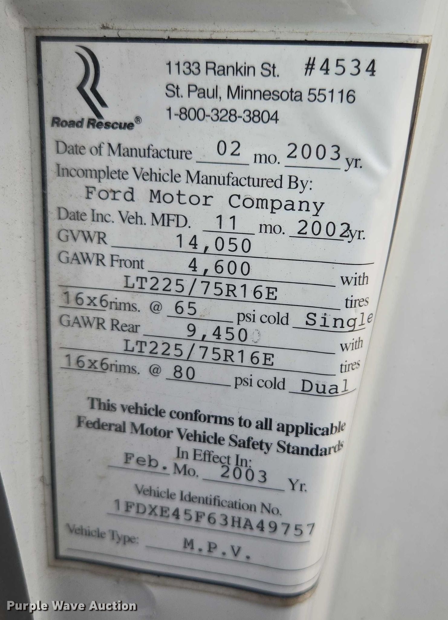 Take a look at this used 2003 Ford E450 ambulance being sold on October 28th, 2025 in the Tuesday October 28 Government Auction made by Ford. Take a look at all of the item information below or take a look at similar auctions for Trucks.