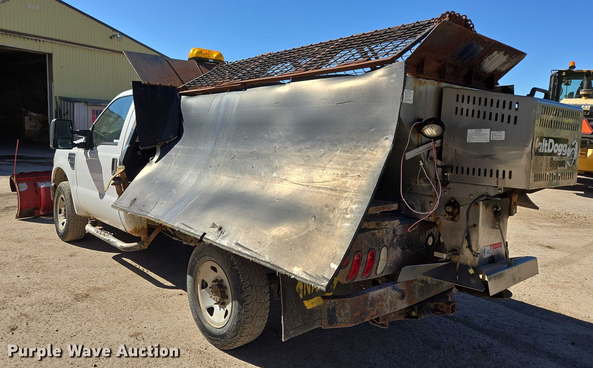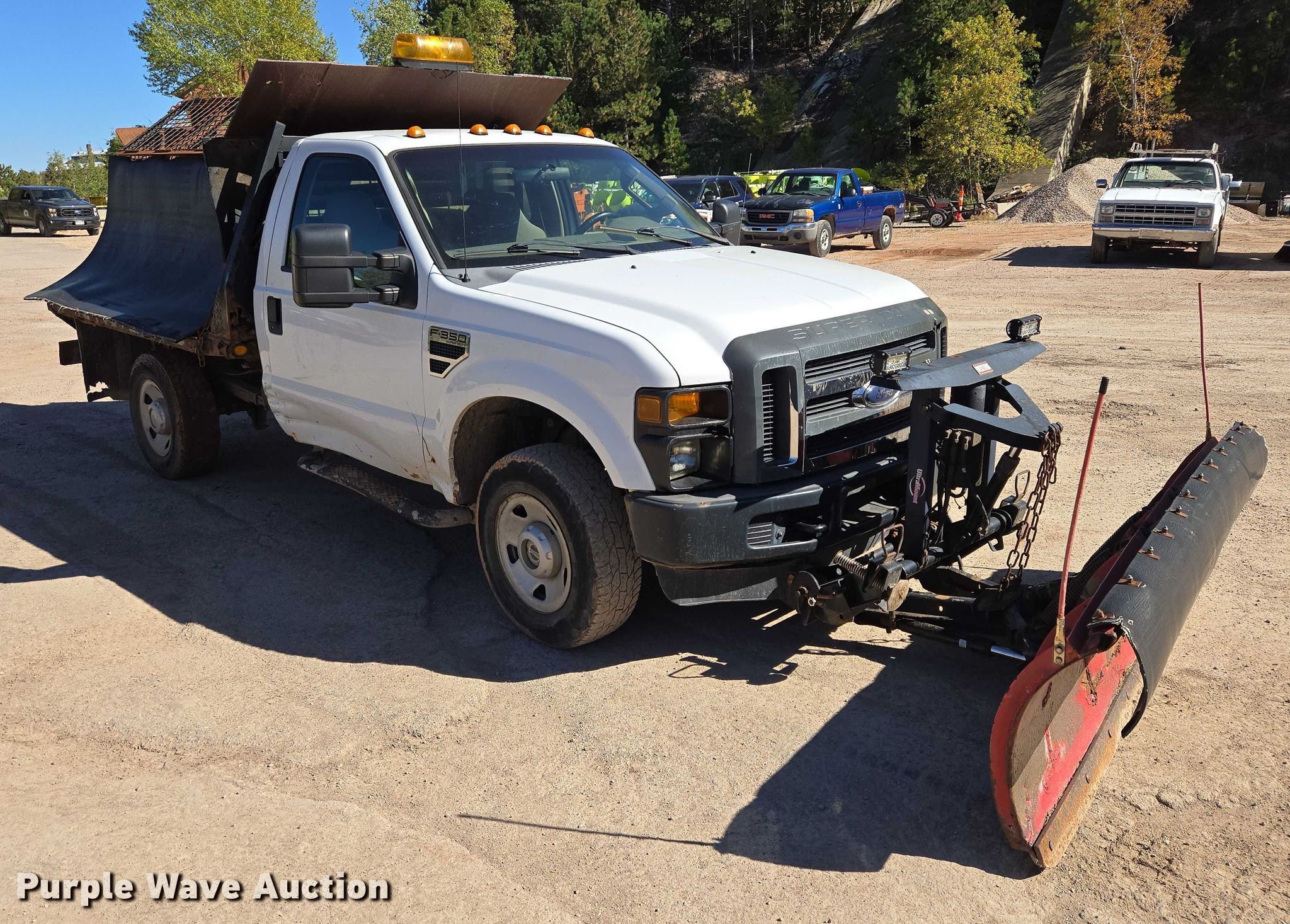 2009 Ford F350 Super Duty XL flatbed pickup truck. Miles: 76,075 on odometer, VIN: 1FTWF31559EA98219. Engine Displacement: 5.4L V8 SOHC, Cylinders: 8, Fuel type: Gas. Transmission Automatic, Four wheel drive. Interior AC, Heat. Features Bed Flatbed, Length: 9', Width: 86", Snow plow Western, Width: 7'6", Spreader Buyers Salt Dog. Tires Size: 245/75R17. Notes Frame rust damage , Spreader wiring harness removed but included, Dash warning indicator: Check engine. South Dakota title. Title distribution may be delayed up to 30 days from verification of funds. City of Lead, SD. Lead, SD 57754