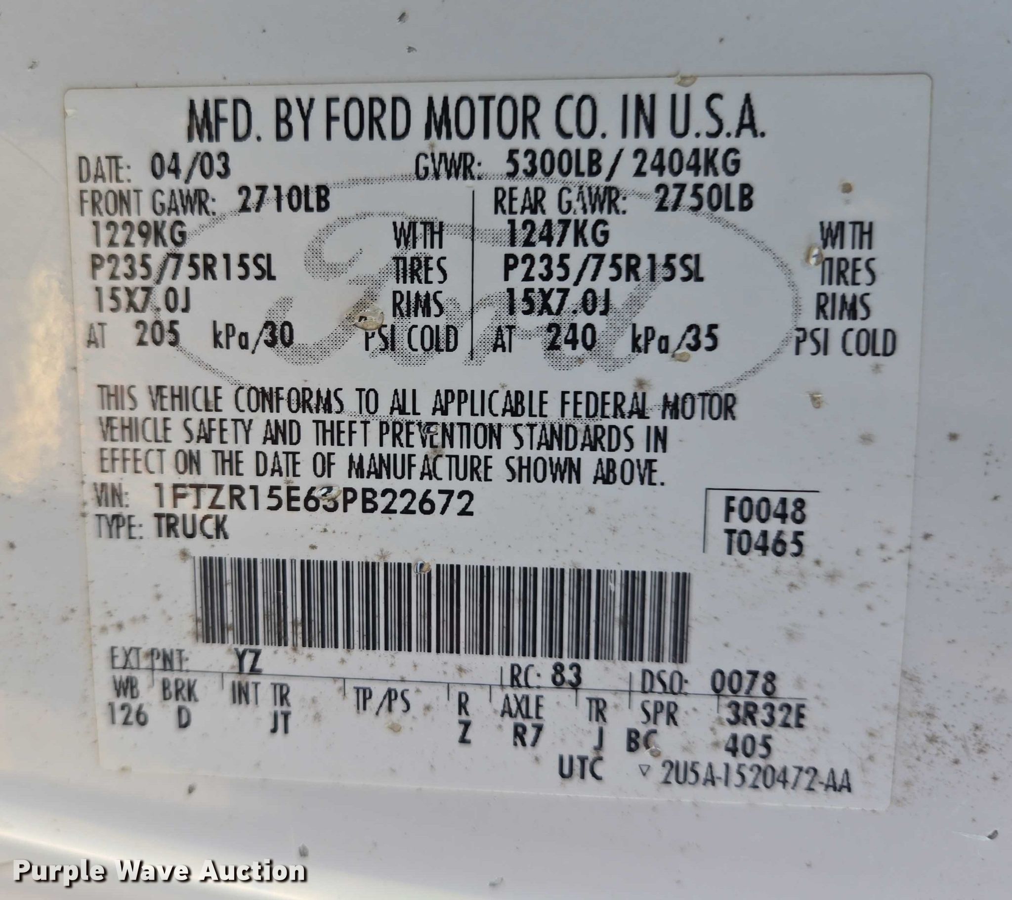 2003 Ford Ranger SuperCab pickup truck. Miles: 75,672 on odometer, VIN: 1FTZR15E63PB22672, Unit #: CD172. Engine Displacement: 4.0L V6 SOHC, Cylinders: 6, Fuel type: Gas. Transmission Manual, Speed: 5, Four wheel drive. Interior AC, Heat, Cruise control. Tires Size: 235/75R15. Notes Rust damage, Windshield chipped or cracked, Hail damage. South Dakota title. Title distribution may be delayed up to 14 days from verification of funds. State of South Dakota. Brookings, SD 57006