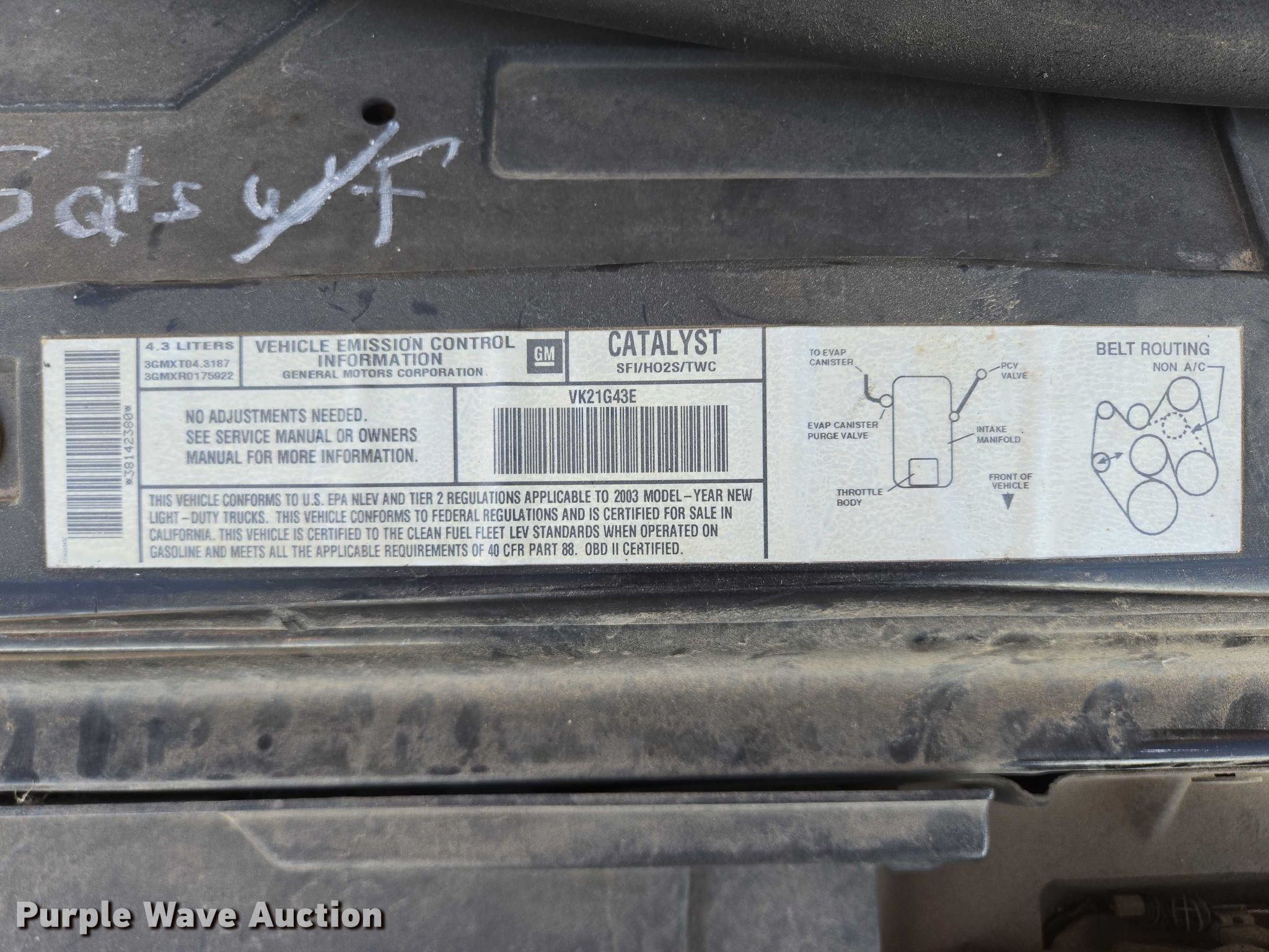 2003 Chevrolet S10 Ext. Cab pickup truck. Miles: 115,563 on odometer, VIN: 1GCDT19X338142380, Unit #: CD079. Engine Displacement: 4.3L V6 OHV, Cylinders: 6, Fuel type: Gas. Transmission Automatic, Four wheel drive. Interior AC, Heat, Cruise control. Tires Size: 235/75R15. Notes Tailgate missing, Dash warning indicator: Airbag. South Dakota title. Title distribution may be delayed up to 14 days from verification of funds. State of South Dakota. Brookings, SD 57006