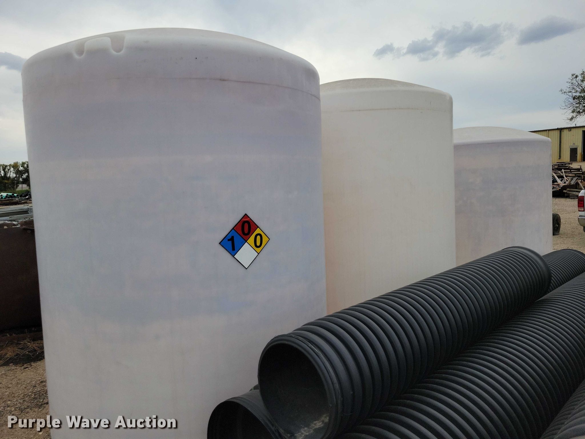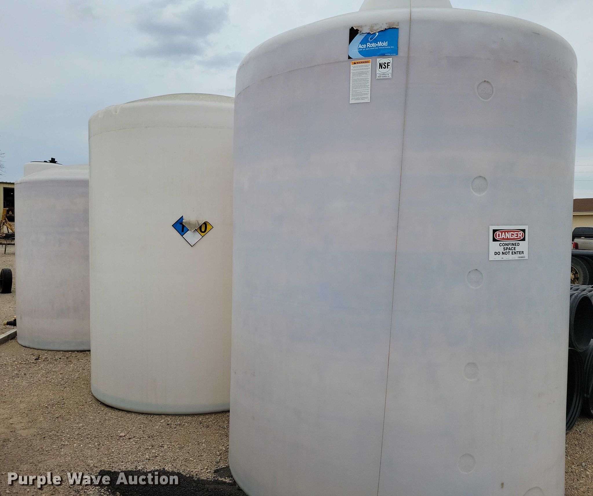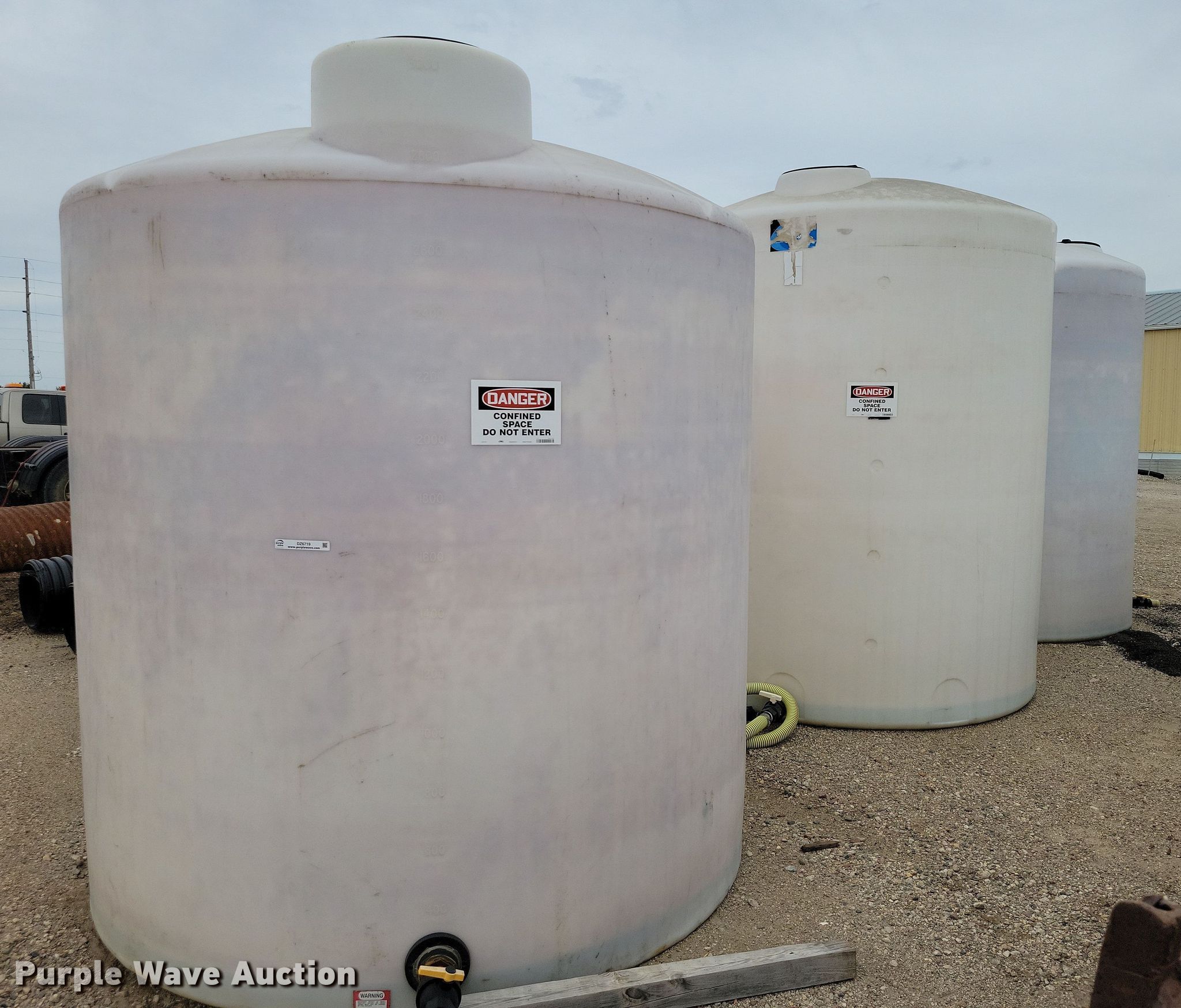 Purple Wave is selling a used Tanks in Iowa. This item is a (3) poly tanks with the following: Capacity: 2,500 gallons, Previously held chloride
