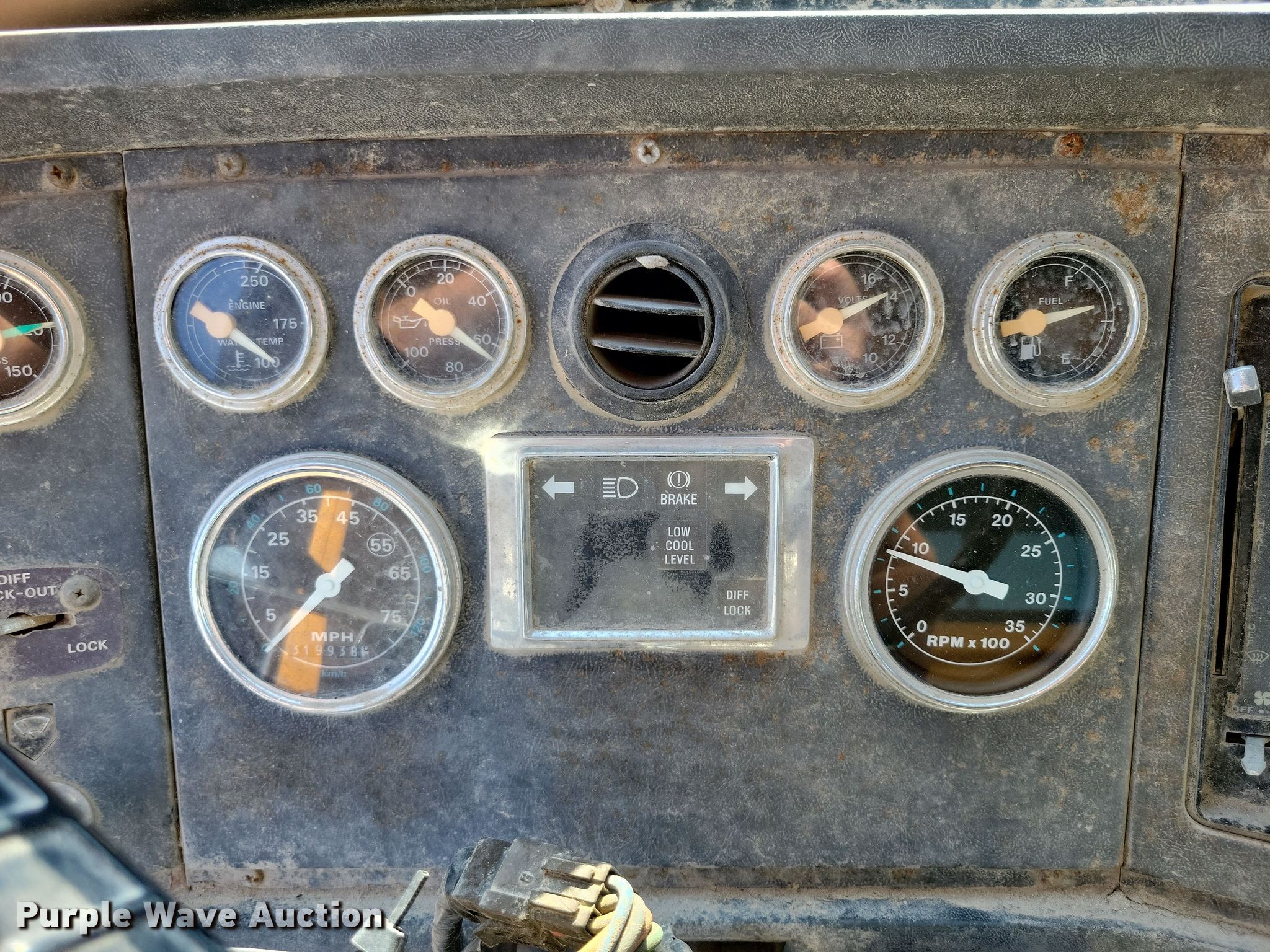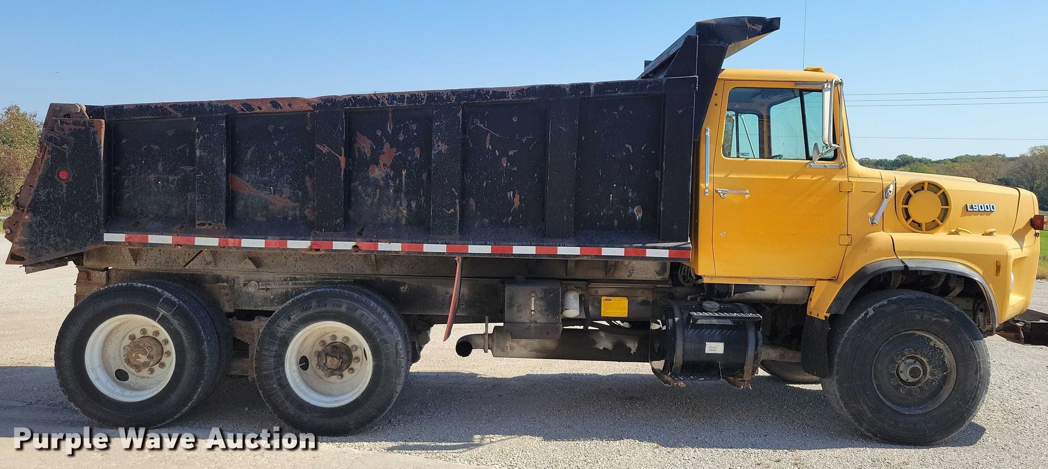 1988 Ford L9000 dump truck. Miles: 319,938 on odometer, VIN: 1FDZY90X0JVA58708. Engine Caterpillar, Displacement: 14.6L, Cylinders: 6, Fuel type: Diesel. Transmission Eaton Fuller RoadRanger RTO-11609-14609, Manual, Speed: 9. Chassis Double frame, Axles: Tandem, Differential lock: Inter-axle, Suspension: Spring over walking beam, Brakes: Air, Front mount PTO, GVWR: 57,300 lbs, Wheelbase: 185". Interior AC, Heat. Features Bed Dump bed, Length: 15', Width: 96", Side height: 40", Bed type: Steel, Liner, Ram: Single, End gate: Manual. Tires Front: 425/65R22.5, Rear: 11R22.5. Notes Bed rust damage, Windshield chipped or cracked. Iowa title. Seller is a government entity who will be assigning and distributing the title. Please contact the seller for distribution questions. Hamilton County, IA. Webster City, IA 50595