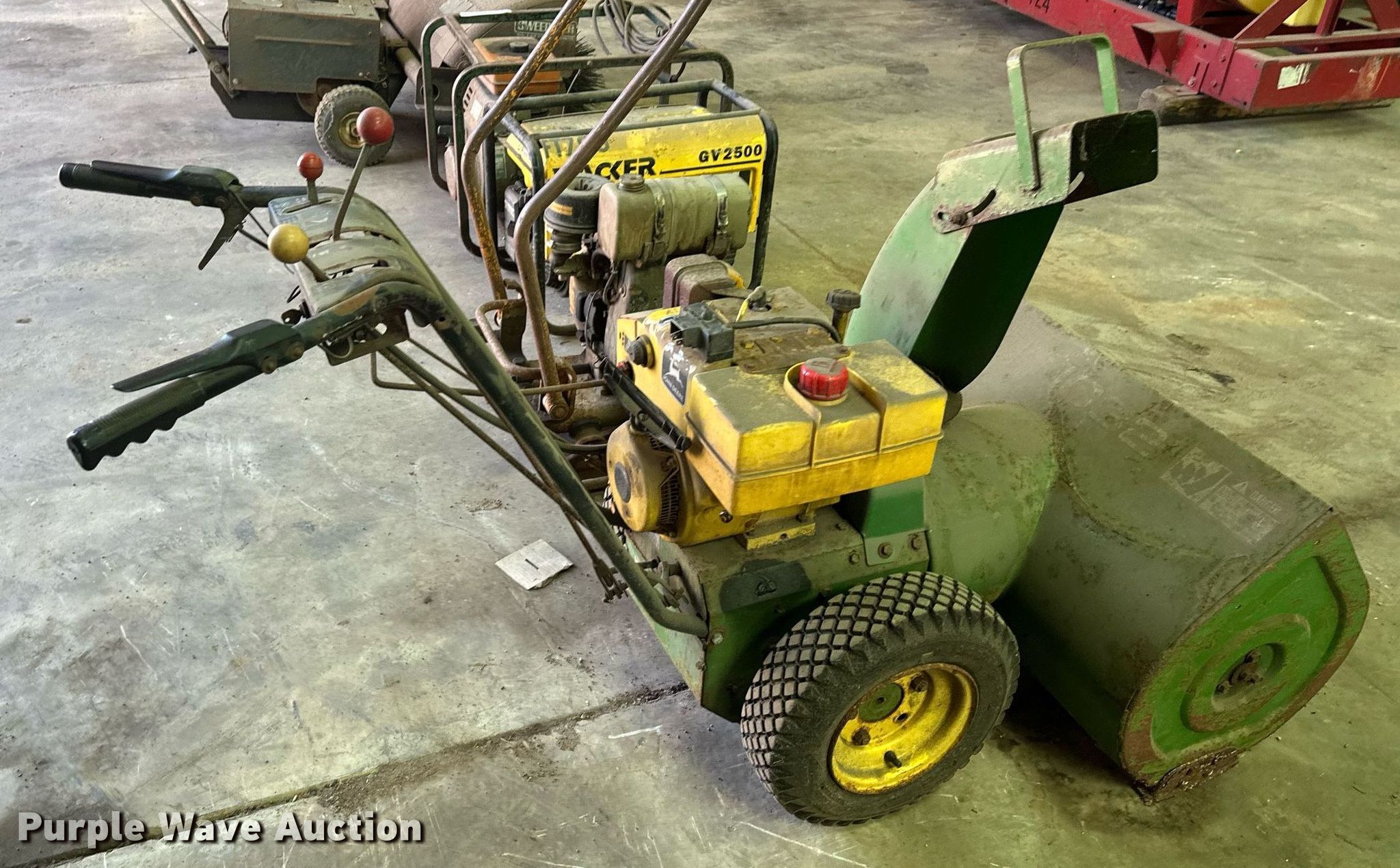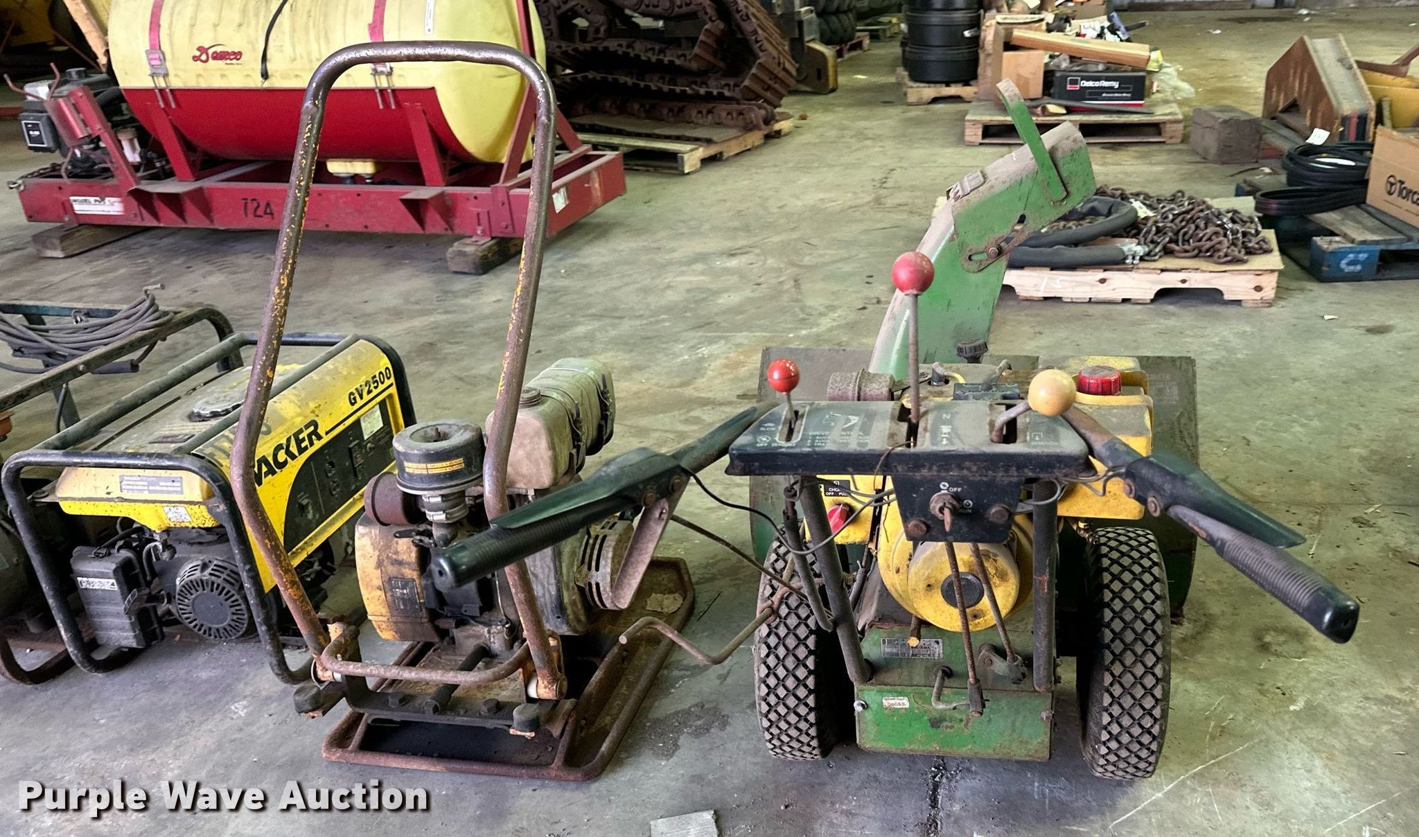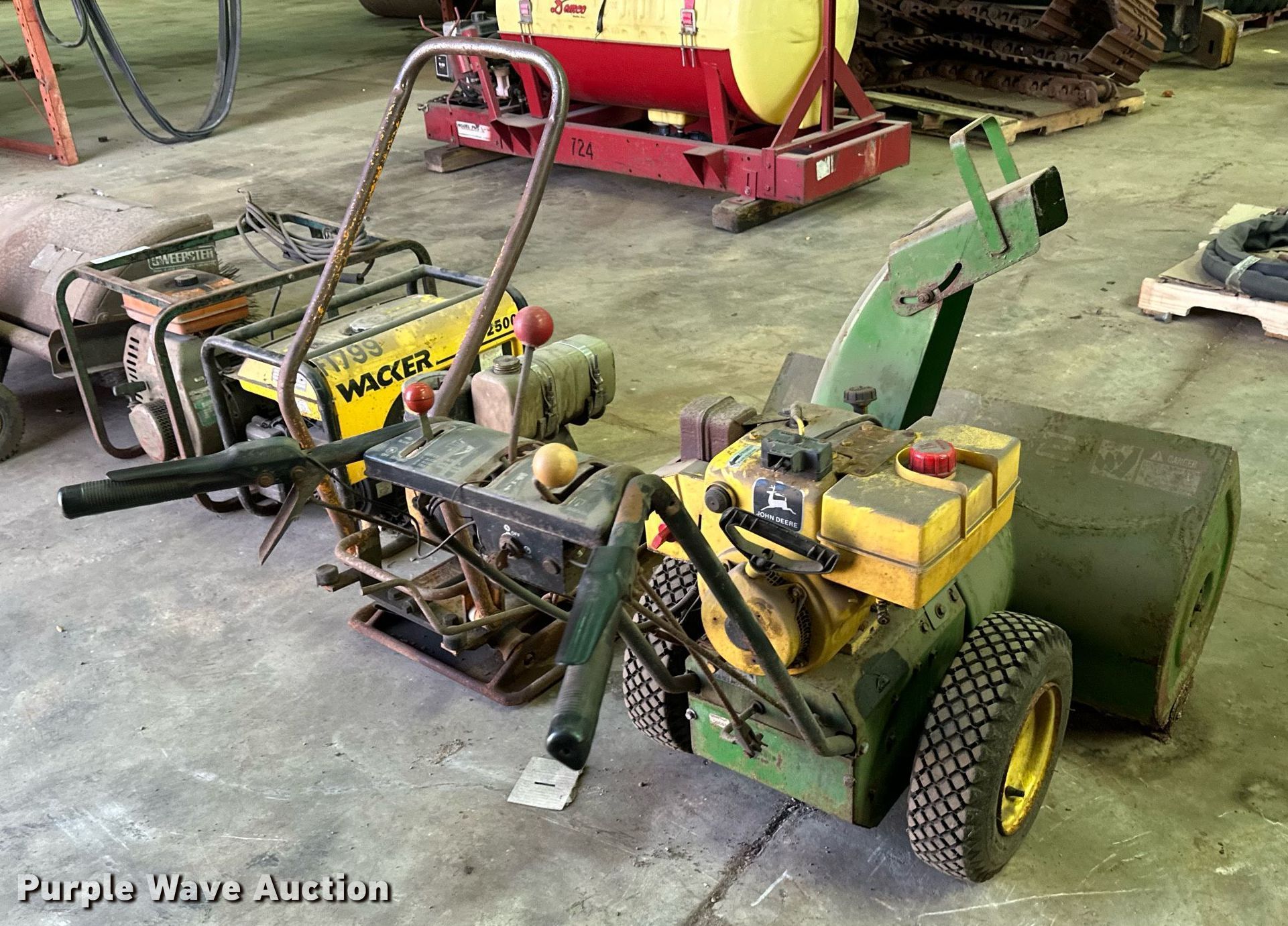 Purple Wave is selling a used Lawn and Garden in Wisconsin. This item is a Lot of tools Lawn and garden equipment with the following: John Deere snow blower, Width: 57", John Deere snow blower, 32", Plate compactor, (2) Generators, Sweepster broom, Width: 40", Broom attachment