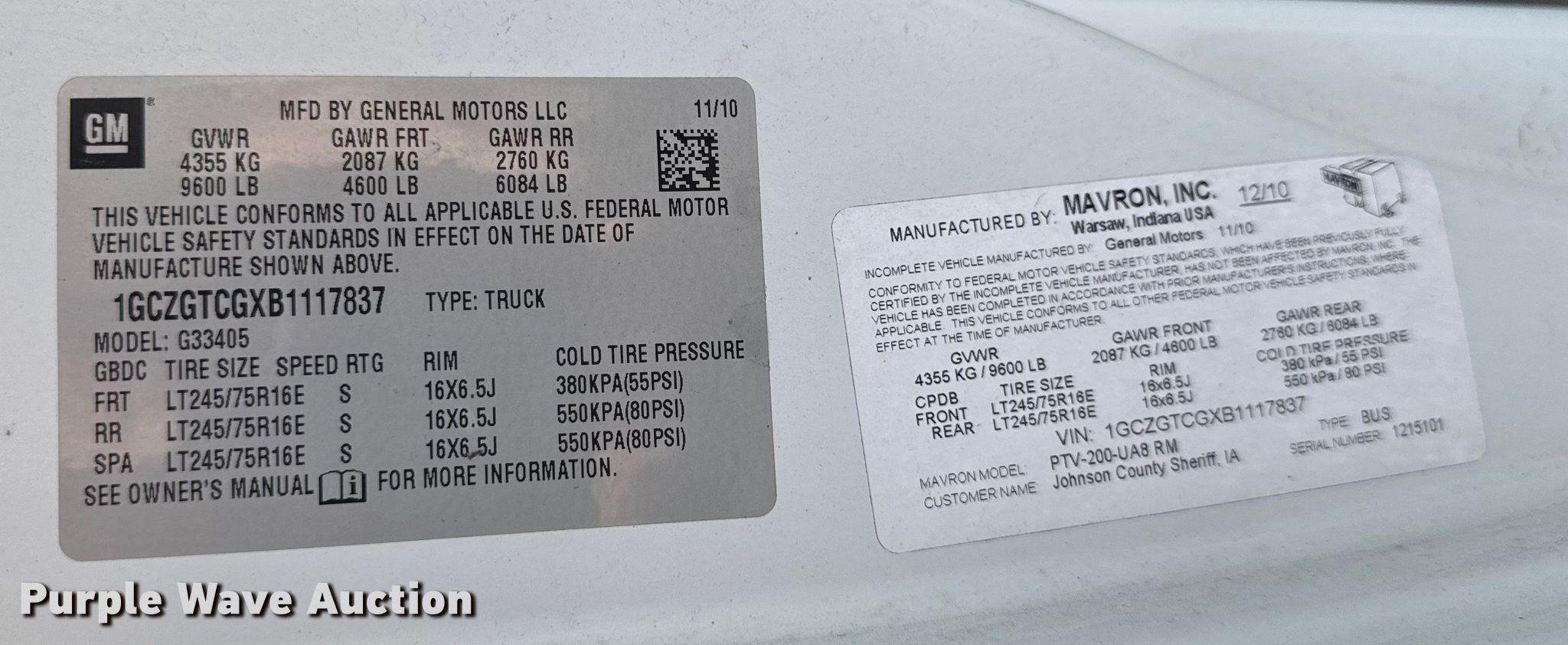 2011 Chevrolet Express prisoner transport van. Miles: 112,490 on odometer, Hours: 2,585 on meter, VIN: 1GCZGTCGXB1117837. Engine Displacement: 6.0L V8 OHV, Cylinders: 8, Fuel type: Gas. Transmission Automatic. Interior AC, Heat, Power windows, Power locks, Cruise control, Auxiliary controls. Tires Size: 245/75R16. Iowa title. Seller is a government entity who will be assigning and distributing the title. Please contact the seller for distribution questions. Johnson County Sheriff. Iowa City, IA 52240