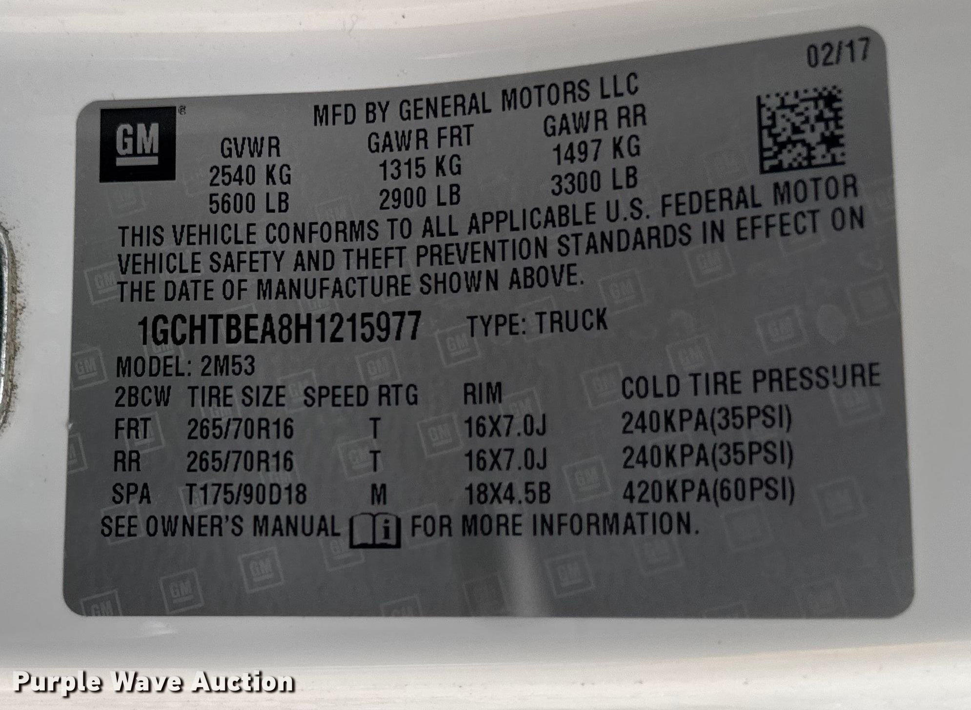 Purple Wave is selling a used Compact Pickup or Van in Iowa. This item is a 2017 Chevrolet Colorado pickup truck with the following: Miles: 89,439 on odometer, VIN: 1GCHTBEA8H1215977