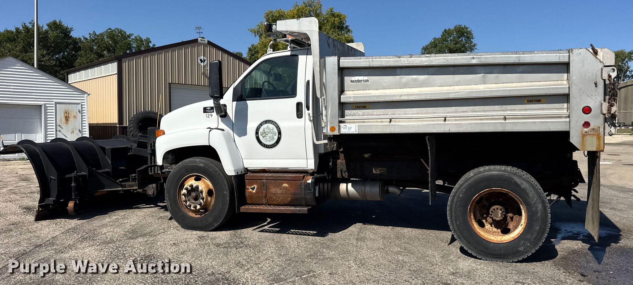 2005 Chevrolet C7500 dump truck. Miles: 50,403 on odometer, VIN: 1GBL7C1CX5F508486, Unit #: 129. Engine Caterpillar C7, Displacement: 7.2L, Cylinders: 6, Fuel type: Diesel. Transmission Automatic. Chassis Axles: Single, Axles: 2, Differential lock: Inter-axle, Suspension: Spring, Brakes: Hydraulic, PTO, Front mount PTO. Interior AC, Heat, Heated mirrors, Cruise control, Brake controller. Features Bed Dump bed, Henderson 10xUBx24x304SS, Length: 10', Width: 96", Side height: 36", Ram: Single, End gate: Manual, Plow Width: 120". Tires Size: 11R22.5. Notes Decals will be removed prior to auction. Illinois title. Title distribution may be delayed up to 14 days from verification of funds. City of Galesburg. Galesburg, IL 61401