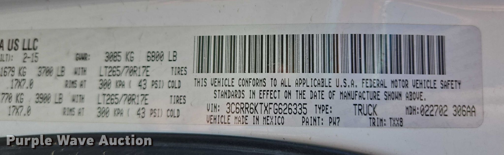 Purple Wave is selling a used 1/2 Ton Pickup or Van in Oklahoma. This item is a 2015 Dodge Ram 1500 Crew Cab pickup truck with the following: Miles: 111,448 on odometer, VIN: 3C6RR6KTXFG626335, Unit #: 1531