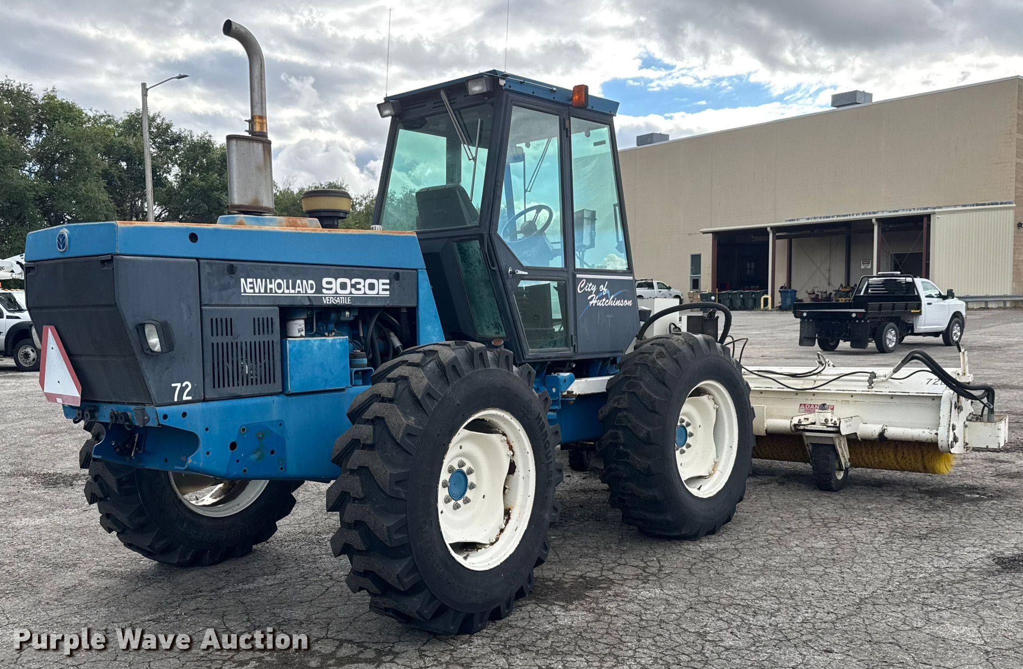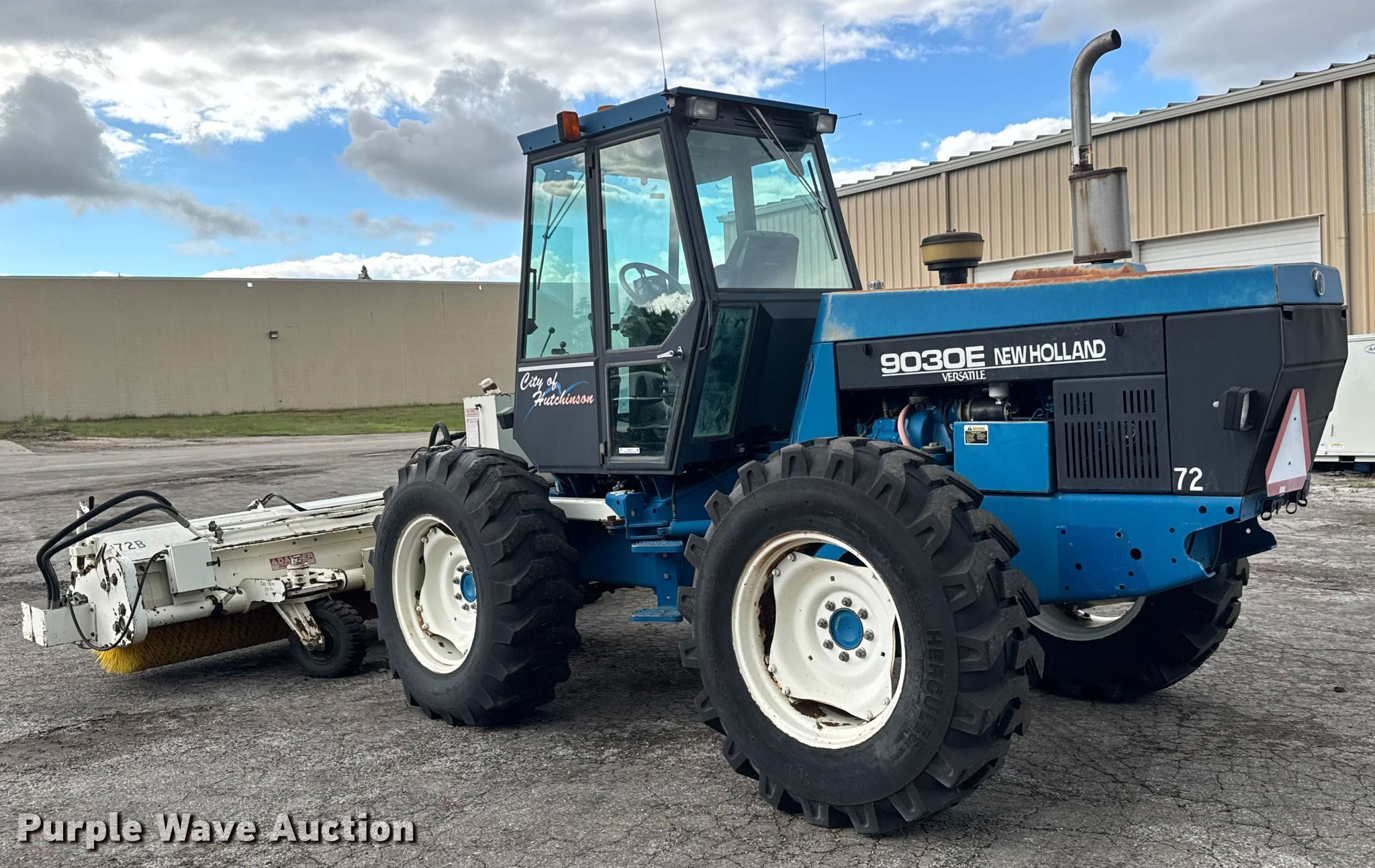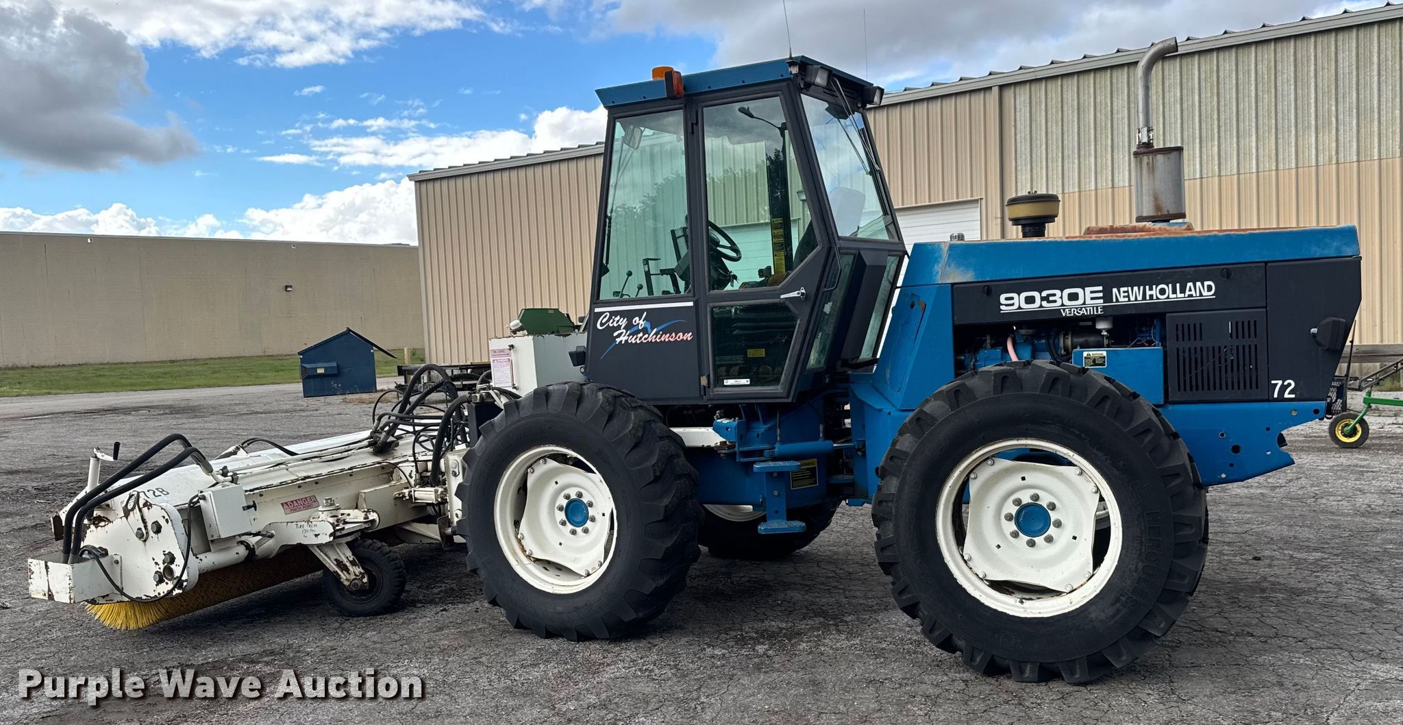 1998 New Holland 9030E bi-directional tractor. Hours: 3,980 on meter, Serial: D202732. Engine Displacement: 4.4L, Cylinders: 4, Fuel type: Diesel. Transmission Hydrostatic, Three speed travel. Operators station AC, Heat. Features PTO: 540, 1000, Three point, Seven pin outlet, Hydraulic remote sets Front: 2, Rear: 3, Broom MB, Serial: 150001397120162, Width: 12'. Tires Size: 16.9-28. City of Hutchinson. Hutchinson, KS 67501