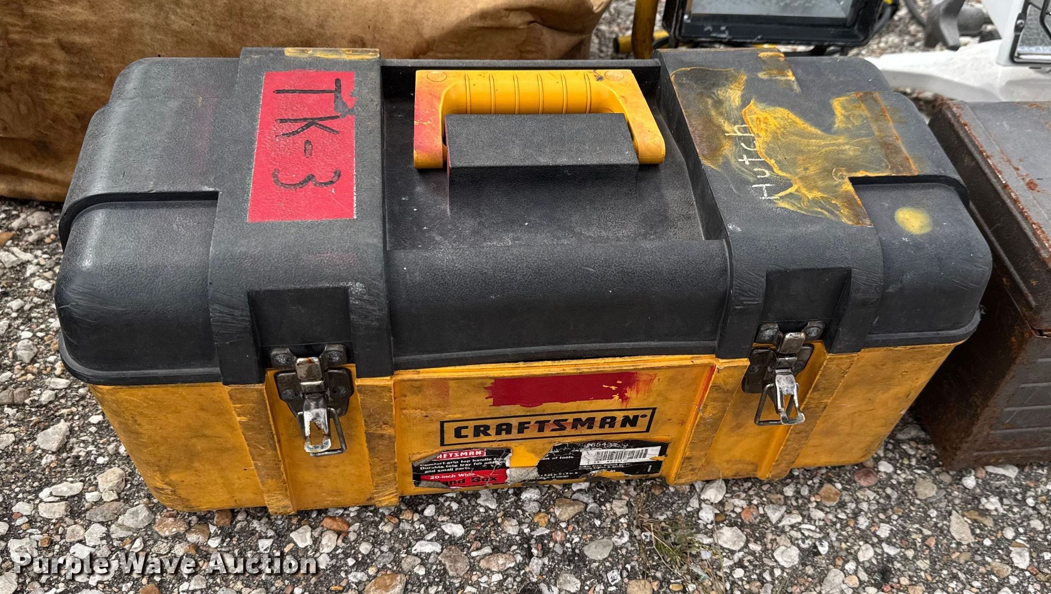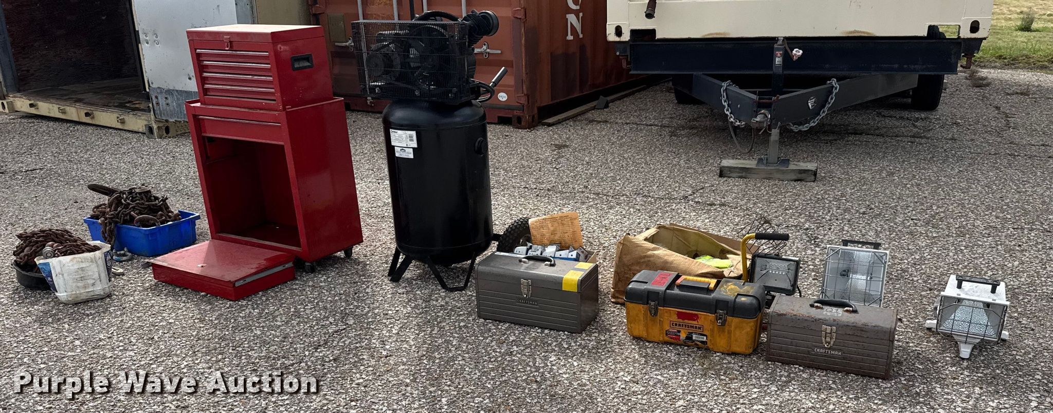 Purple Wave is selling a used Tools in Kansas. This item is a Tools with the following: Waterloo tool chest, (3) toolboxes, Kobalt 221495 air compressor, Capacity: 30 gallons, Safety vests, Lights, Chains and more