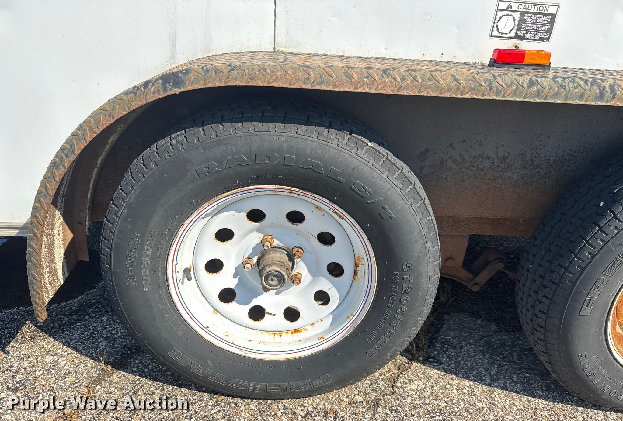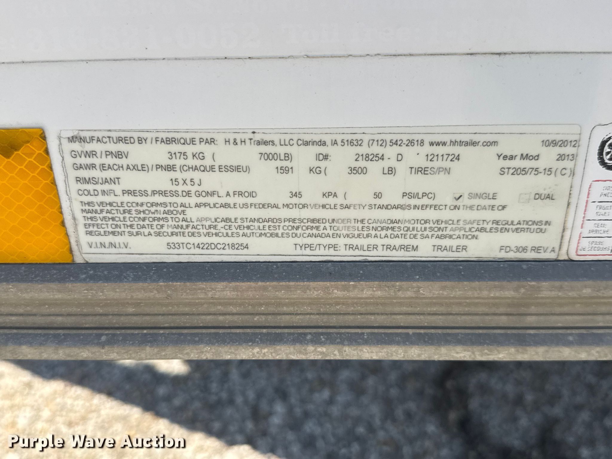 2013 H & H FD-306 REV A enclosed cargo trailer. VIN: 533TC1422DC218254. Dimensions Overall Length: 18' 6", Width: 102", Body Length: 15', Width: 85", Rear door / ramp 73" L x 77" W. Features Deck type: Wood. Chassis Ball hitch: 2 5/16", Landing gear: Single, Suspension: Spring, Brakes: Electric, Axles: Tandem, GVWR: 7,000 lbs. Tires Steel wheels, Size: 205/75R15. Notes Rear door issues. Kansas title. Title distribution may be delayed up to 14 days from verification of funds. El Dorado Correctional Facility. El Dorado, KS 67042
