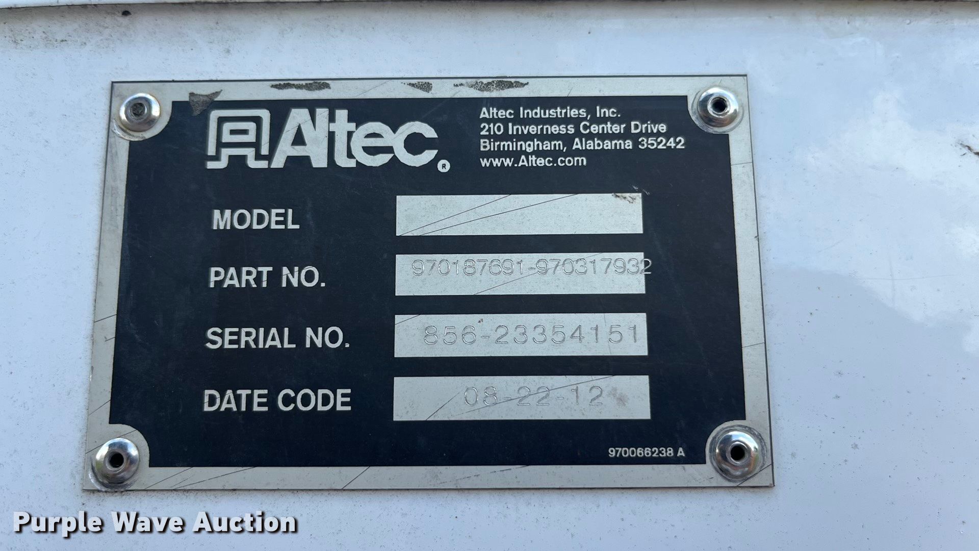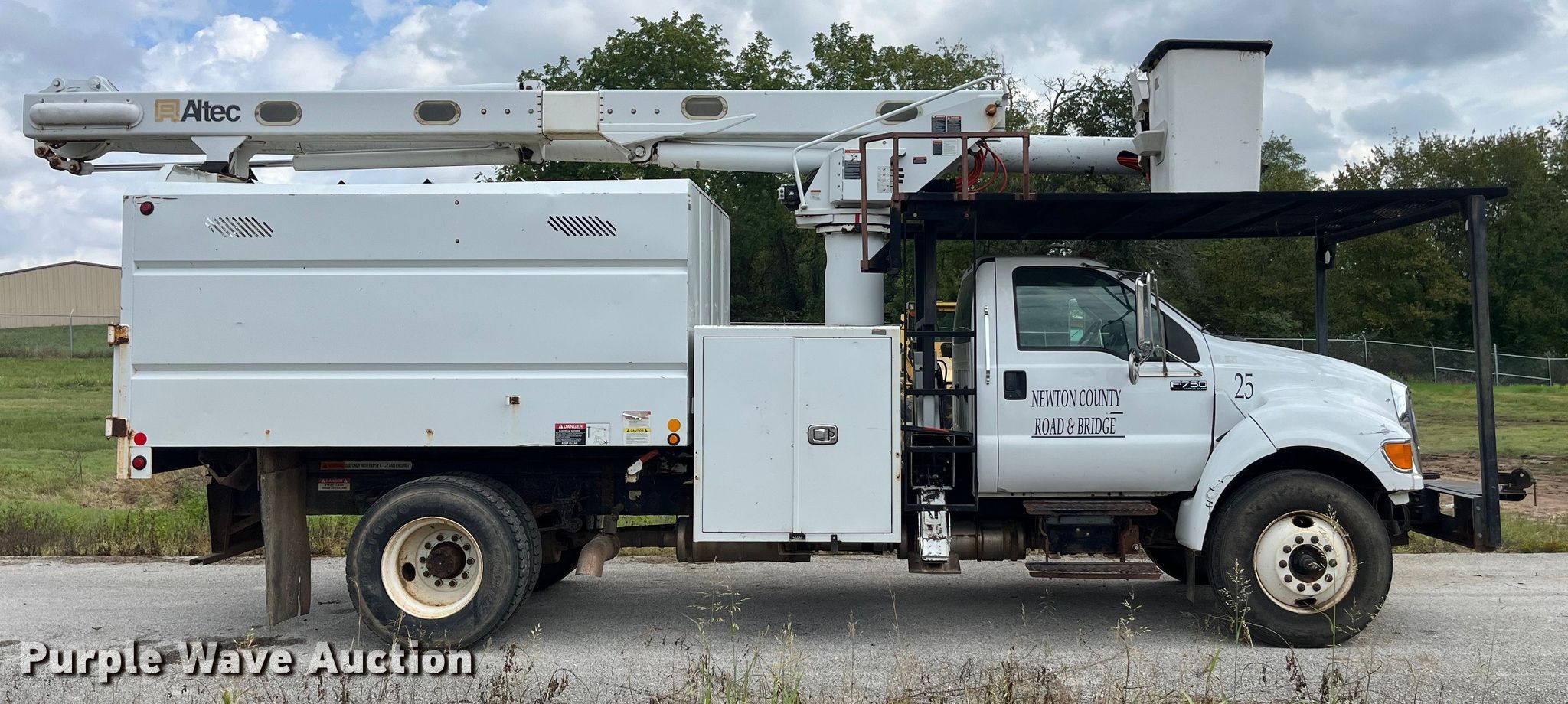 2012 Ford F750 Super Duty XL forestry bucket truck. Miles: 56,868 on odometer, VIN: 3FRNF7FC6CV297398, Unit #: 25. Engine Cummins ISB 6.7 240, Serial: 73415159, Displacement: 6.7L, Cylinders: 6, Fuel type: Diesel, HP: 240. Transmission Manual, Speed: 6. Chassis Axles: Single, Suspension: Spring, Brakes: Hydraulic, PTO, GVWR: 25,999 lbs. Interior AC, Heat, Cruise control, Auxiliary controls, Brake controller. Features Bed Chip bed, Altec, Serial: 856-23354145, Length: 16' 2", Width: 7' 9", Boom Altec LR756, Serial: 0912FF0161, Boom length: 26', Maximum lift capacity: 400 lbs, Maximum lift height: 56', Boom type: Articulating, Insulated, Man basket, Boom controls Ground, Platform/ basket.. Tires Size: 11R22.5. Notes PTO issues, cable may need replaced, Dash warning indicator: ABS, Jump start required during on-site data collection, Contents not included, Contents of chip bed will be removed prior to auction, Service records available upon request [email protected]. Missouri title. Title distribution may be delayed up to 14 days from verification of funds. Newton County Road and Bridge. Granby, MO 64844