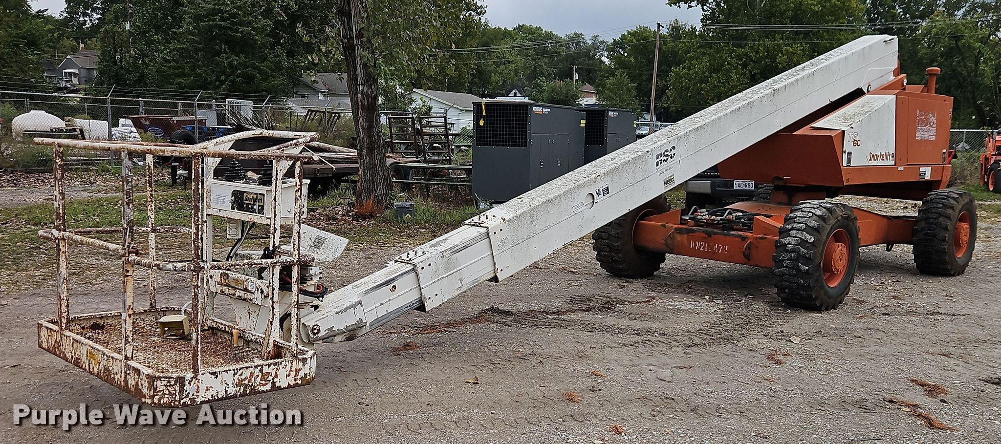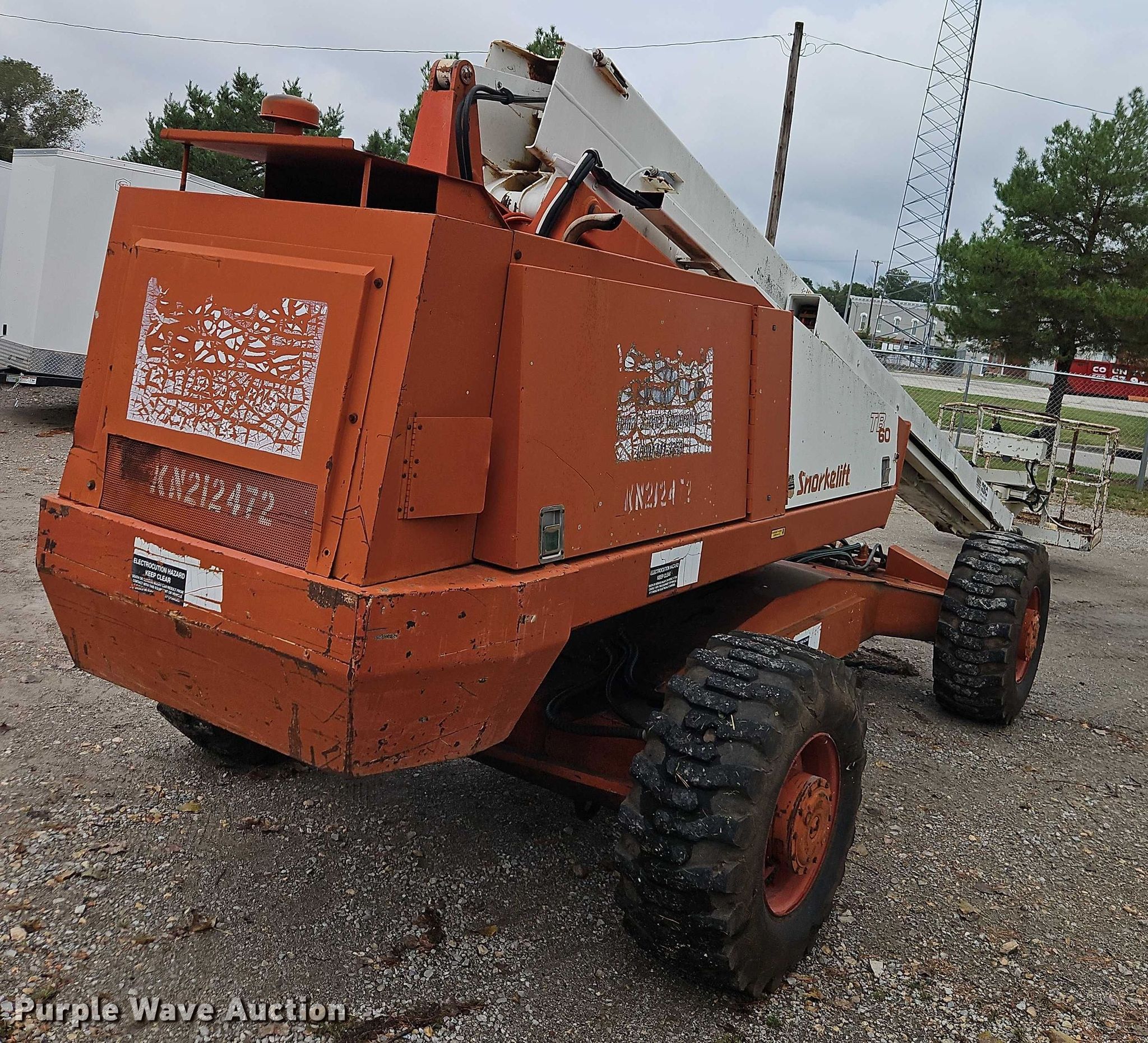 Snorkelift TB60 boom lift. Hours: 3,646 on meter, Serial: 9638241196. Engine Deutz F4L 1011 F, Cylinders: 4, Fuel type: Diesel. Chassis Four wheel drive. Features Rough terrain, Boom type: Telescopic, Maximum lift capacity: 500 lbs, Maximum reach length: 50', Maximum lift height: 60', Platform: 33" L x 63" W, AC power outlet, Controls: Platform, Ground, Platform rotation: Hydraulic. Tires Tire size: 15-19.5, Foam filled. Pleasant Hill, MO 64080