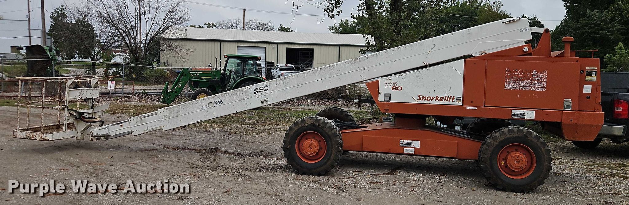 Purple Wave is selling a used Boom Lift in Missouri. This item is a Snorkelift TB60 boom lift with the following: Hours: 3,646 on meter, Serial: 9638241196