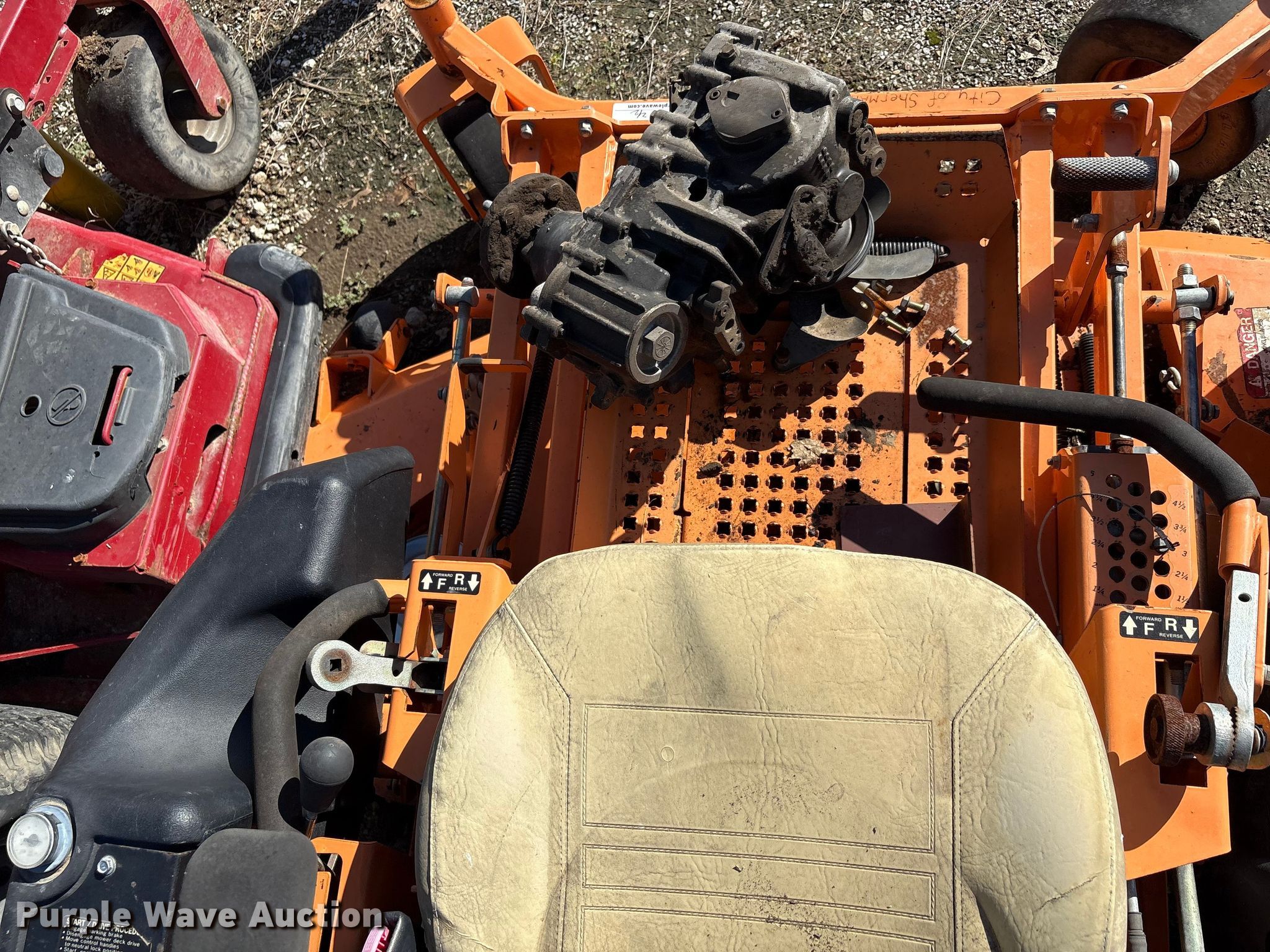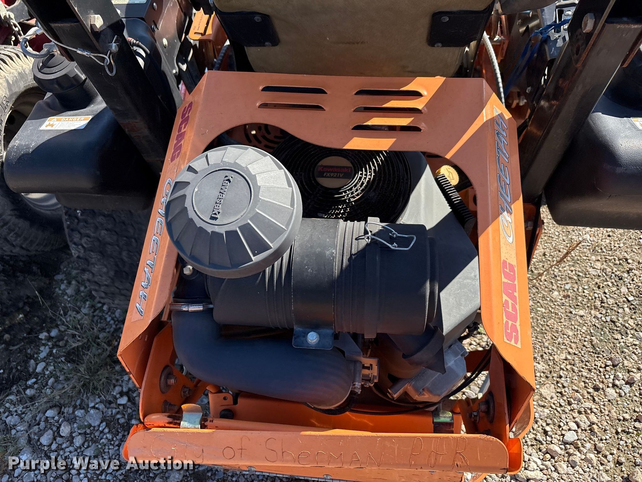 Scag / toro Cheetah / 6000 series ZTR lawn mower. Hours: Unknown, Cutting width: 60", Serial: H7600043, Unit #: 997 / 9970. Engine Kohler / Kawasaki ECV749. /. FX291V, Serial: ECV749-3046. / FX921VA13651, Displacement: 749cc. /999cm, Cylinders: 2, Fuel type: Gas. Transmission Hydrostatic. Features Width: 60". Tires Front: 13X6.50-6, Rear: 24X12.00-12, Brand: Carlisle. Notes Non-operational engine , Right drive motor removed but included, Oil pan damaged, Parts unit, Dead battery, Unknown operating condition. City Of Sherman. Sherman, TX 75090