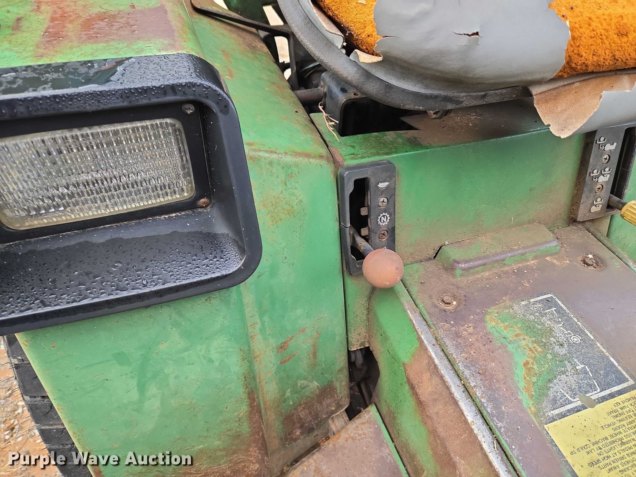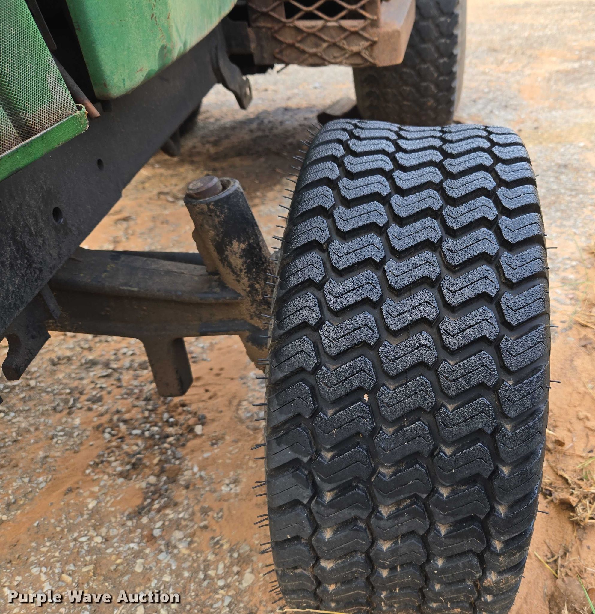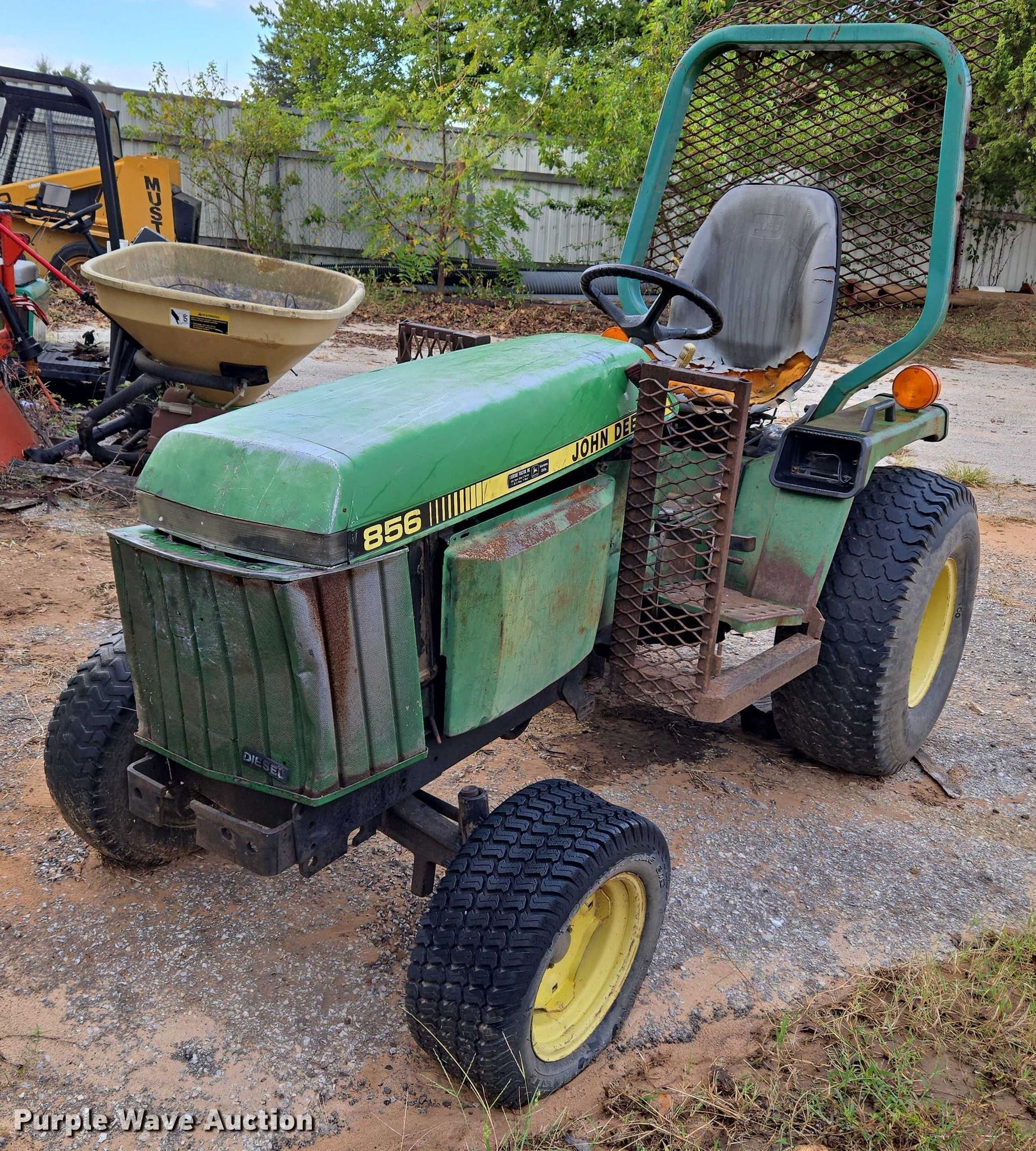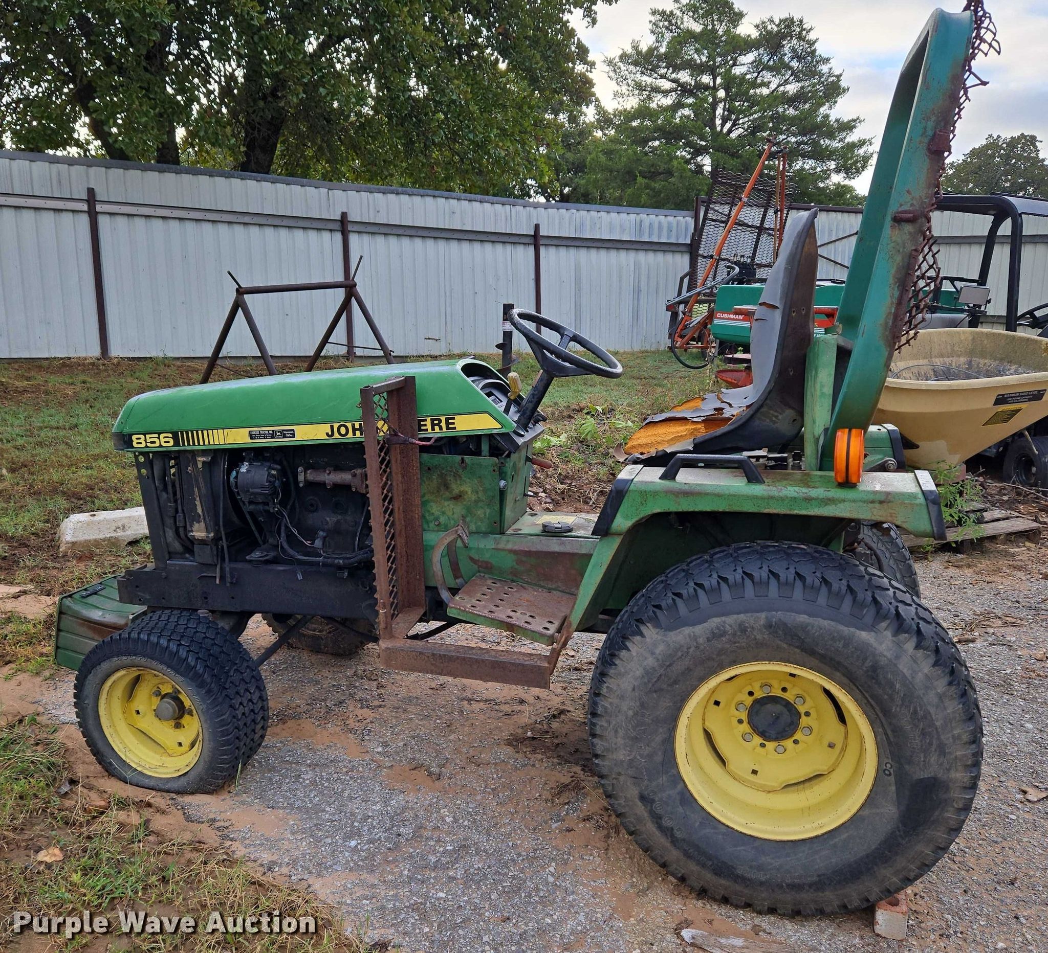 John Deere 856 tractor. Hours: 366 on meter, Serial: M00856A420066. Engine John Deere 3TN75RJ, Serial: CH3033D002967, Cylinders: 3, Fuel type: Diesel. Transmission Hydrostatic. Features PTO: 540. Tires Front: 23/8.50-12, Rear: 33/12.50-15NHS. Notes Dead battery, Key not included, Parts missing, Flat tire, Non-operational unit. Choctaw Golf Course - Maintenance Barn. Choctaw, OK 73020