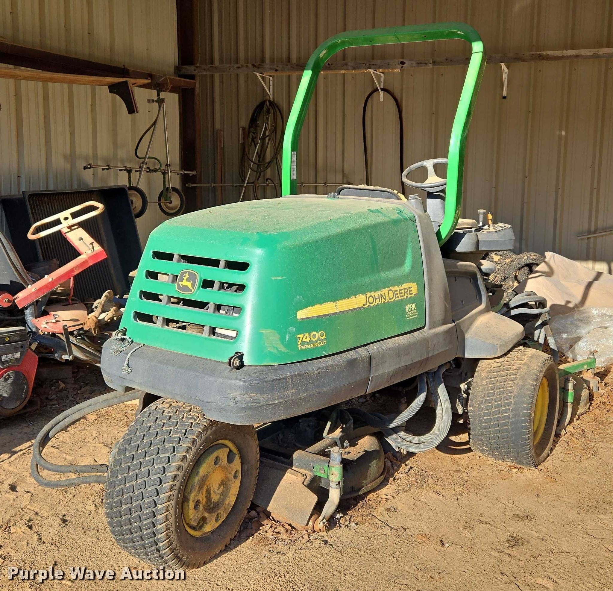 Purple Wave is selling a used Commercial Turf Mower in Oklahoma. This item is a John Deere 7400 Terrain Cut lawn mower with the following: Hours: 2,840 on meter, Cutting width: 64", Serial: TC7400X010163