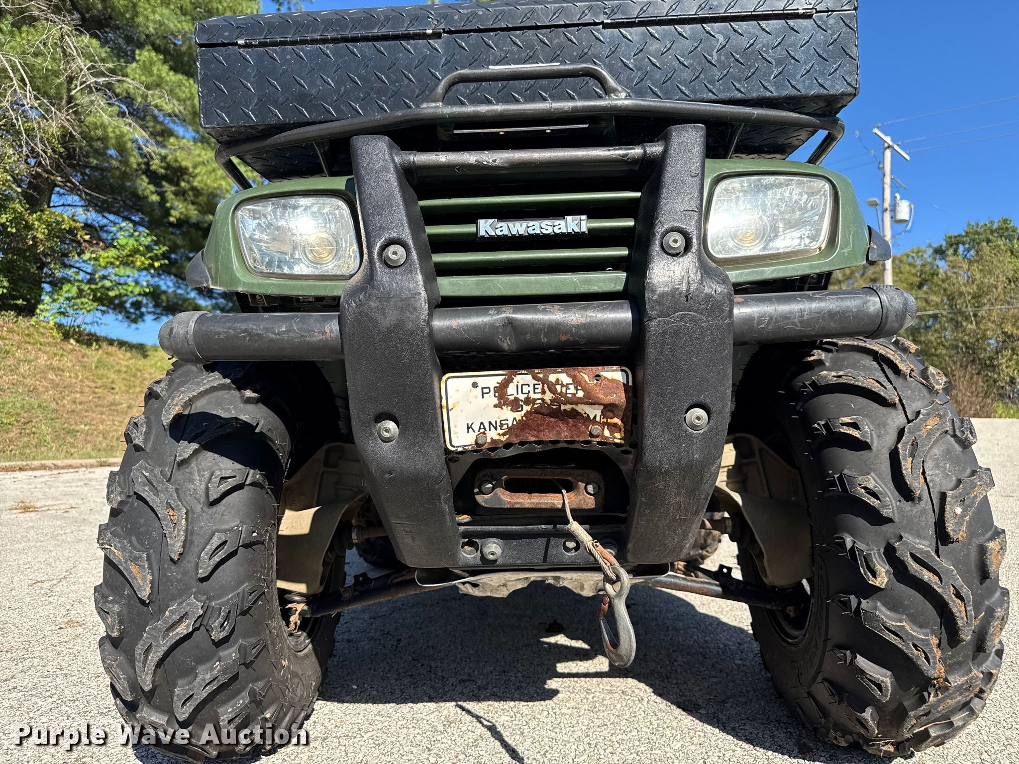2005 Kawasaki Prairie ATV. Miles: 6,326 on odometer, Hours: 856 on meter, VIN: JKAVF6A125B515800. Engine Kawasaki, Cylinders: 1, Fuel type: Gas, Electric start. Transmission Automatic. Chassis Four wheel drive/ All wheel drive. Features Winch, Grille guard. Tires Front: 25x8-12, Rear: 25x10-12. Notes Exhaust issues, leak. Missouri title. Title distribution may be delayed up to 14 days from verification of funds. Board of Police Commissioners. Kansas City, MO 64127