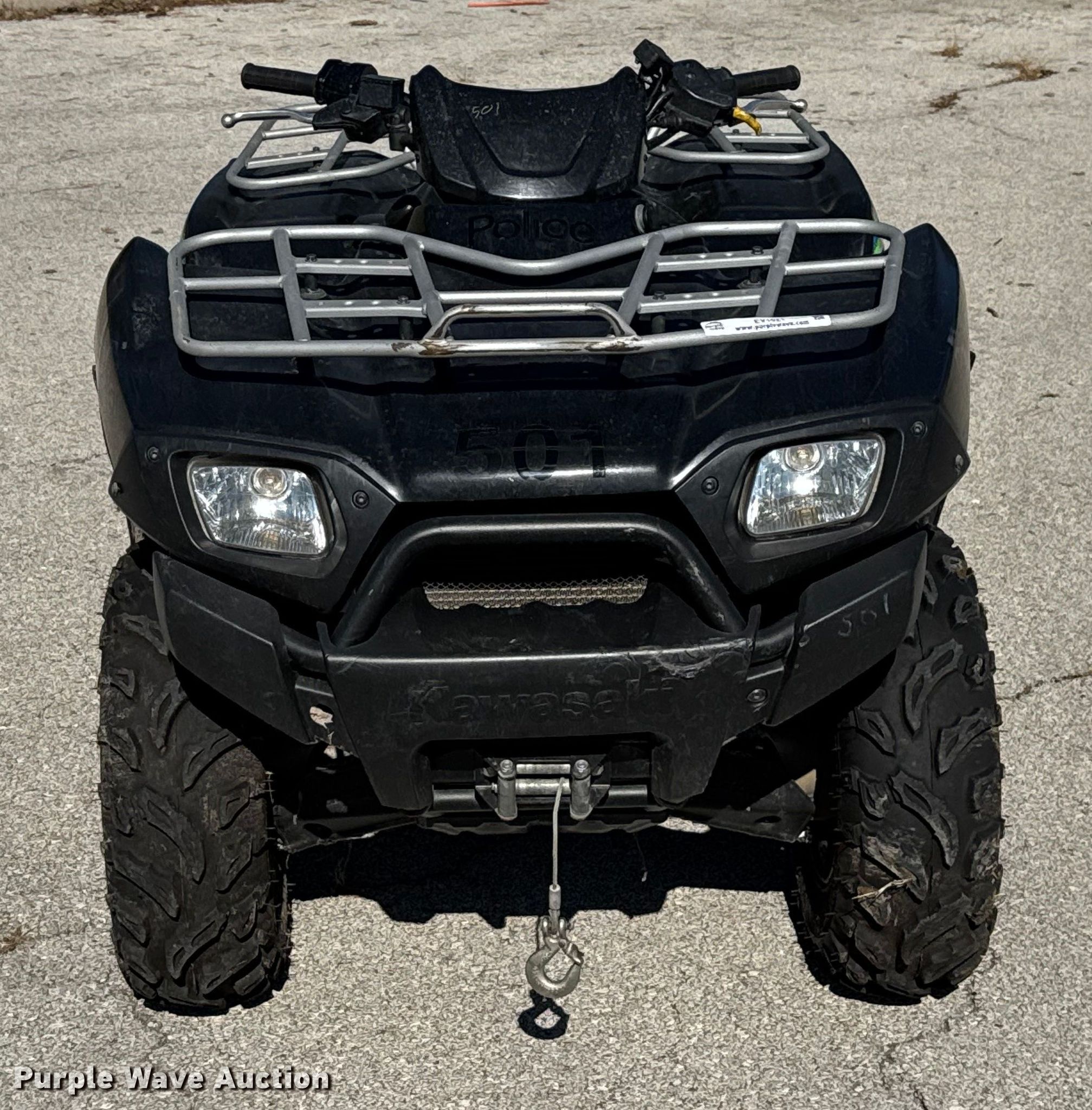 2012 Kawasaki 650 ATV. Miles: 3,129 on odometer, Hours: 450 on meter, VIN: JKAVFED1XCB531262. Engine Kawasaki, Cylinders: 1, Fuel type: Gas, Electric start. Transmission Automatic. Chassis Four wheel drive/ All wheel drive. Features Winch, Grille guard. Tires Front: 25x8-12, Rear: 25x10-12. Missouri title. Title distribution may be delayed up to 14 days from verification of funds. Board of Police Commissioners. Kansas City, MO 64127