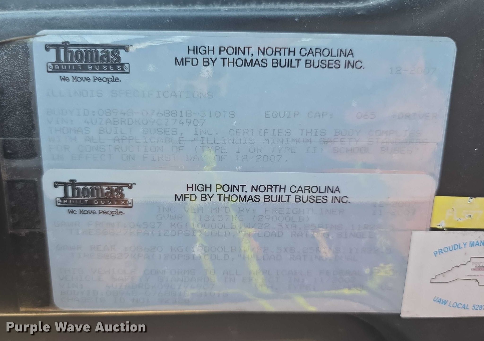 Purple Wave is selling a used Bus in Kansas. This item is a 2009 Freightliner Thomas Built school bus with the following: Miles: 159,570 on odometer, Hours: 8,431 on meter, VIN: 4UZABRDK09CZ74907, Unit #: 35-9