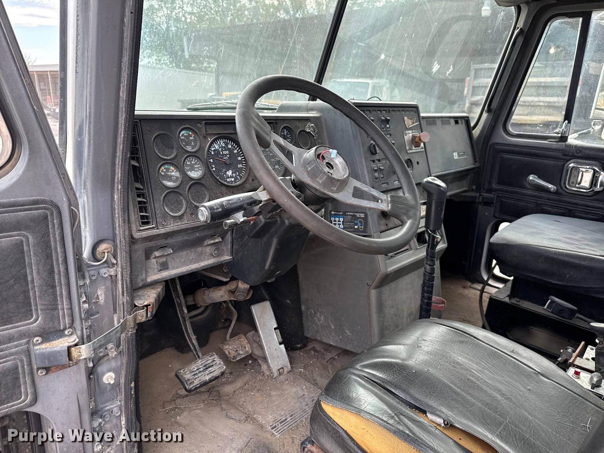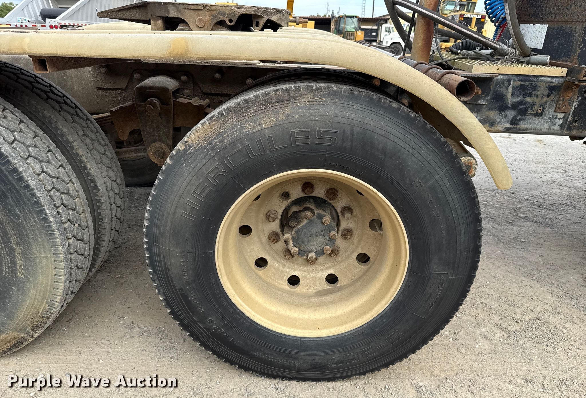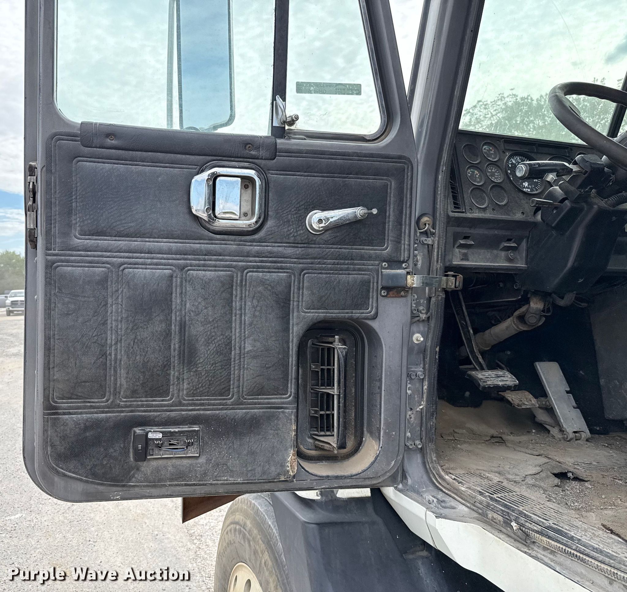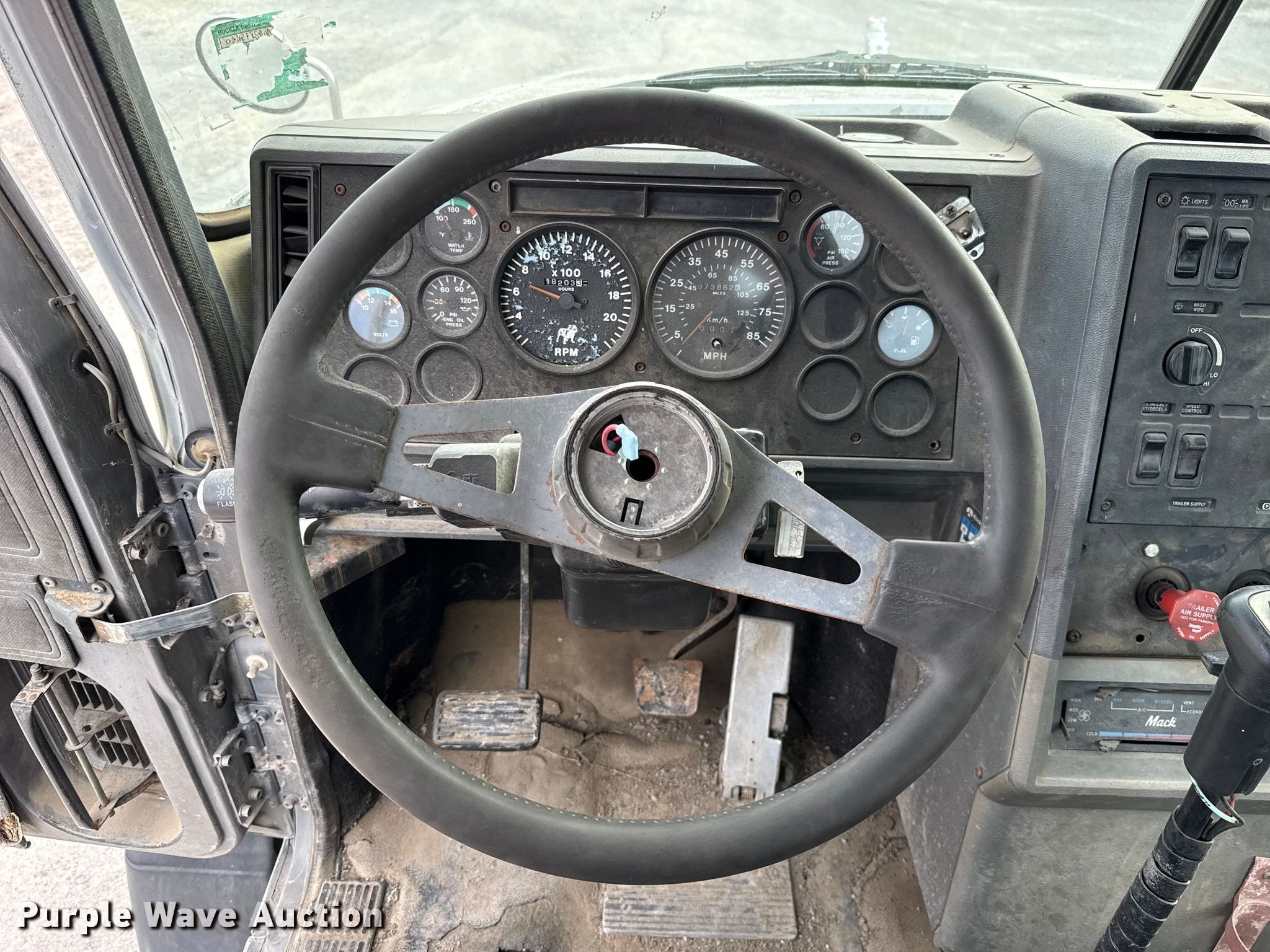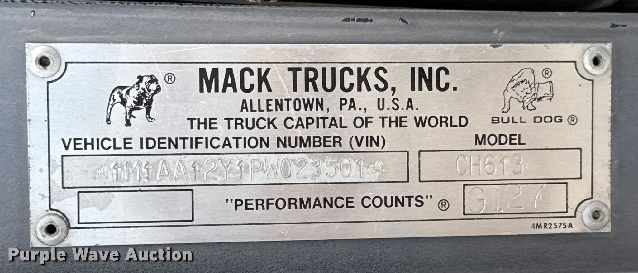 1993 Mack CH613 semi truck. Miles: 673,863 on odometer, Hours: 18,203 on meter, VIN: 1M1AA12Y1PW023501. Engine Mack, Displacement: 12.0L, Cylinders: 6, Fuel type: Diesel. Transmission Eaton Fuller, Manual, Speed: 9. Chassis Axles: Tandem, Suspension: Spring, Brakes: Air, PTO, Wet kit. Interior AC, Heat, Heated mirrors, Cruise control, Air ride cab. Features Deck plate: Aluminum, Fifth wheel type: Fixed, Fuel tank: Single. Tires Size: 11R22.5. Notes Air leak , Right rear outside dual tire issues, flat. Oklahoma title. Title distribution may be delayed up to 14 days from verification of funds. Muskogee County District 3. Muskogee, OK 74401