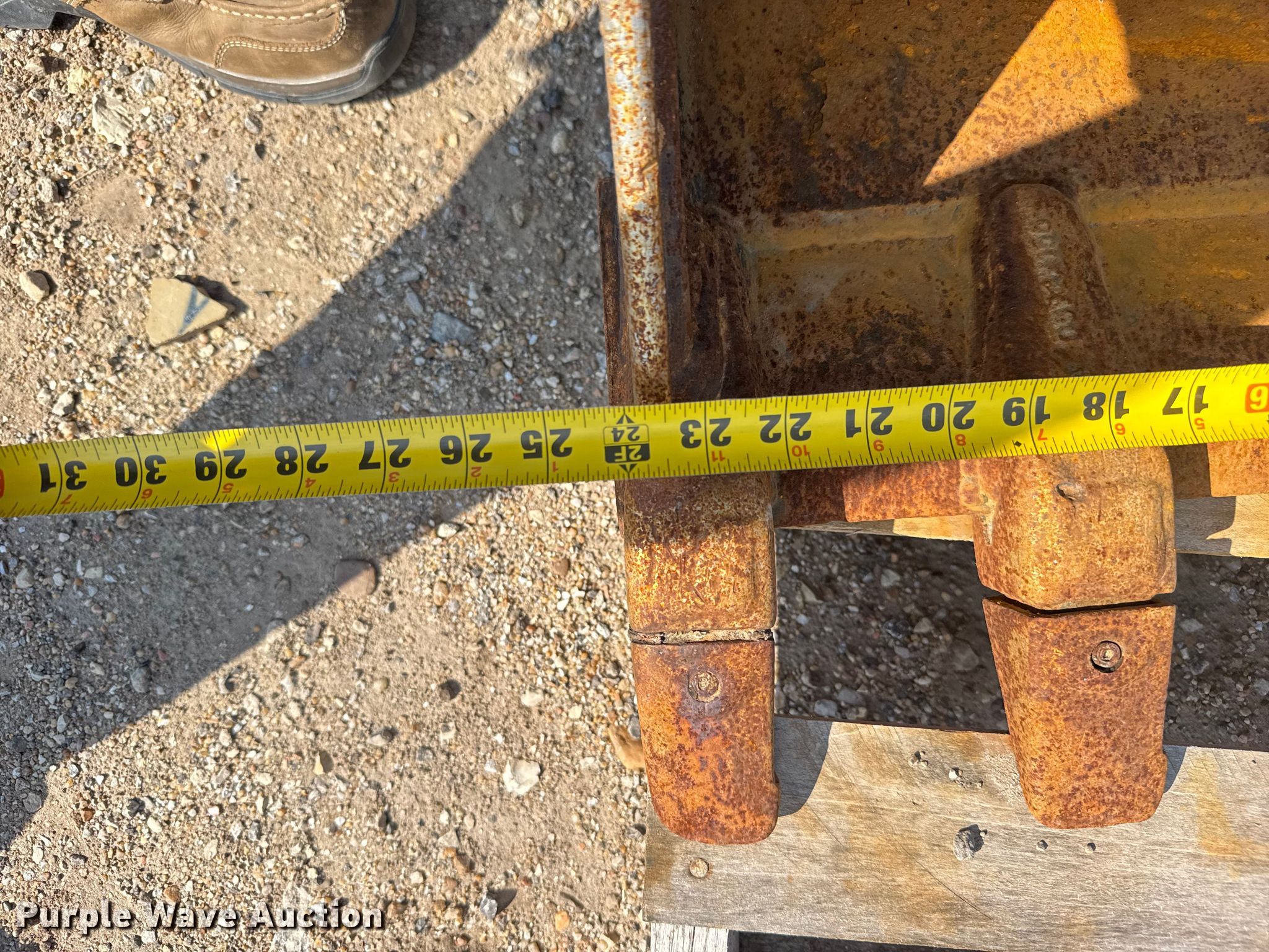 Purple Wave is selling a used Backhoe Attach. in Kansas. This item is a backhoe bucket with the following: Width: 24", Cutting edge: Weld-on, Teeth: 5, Ear damaged, bent