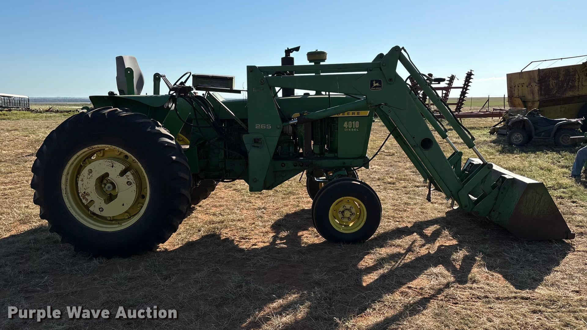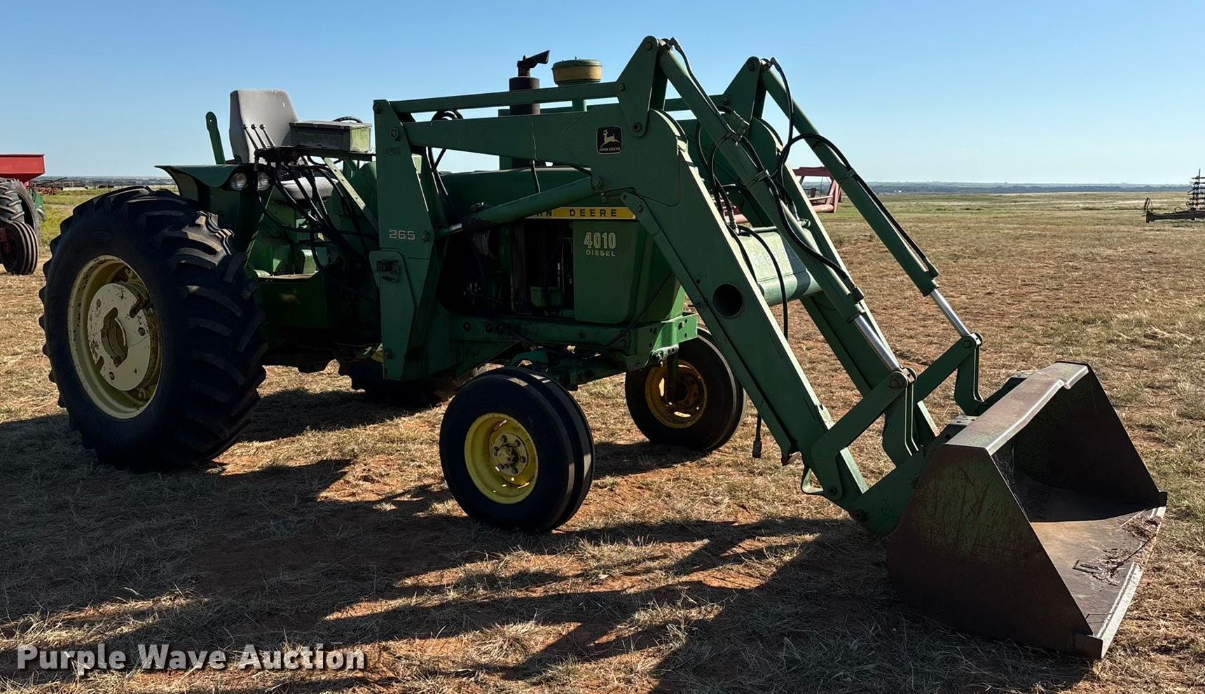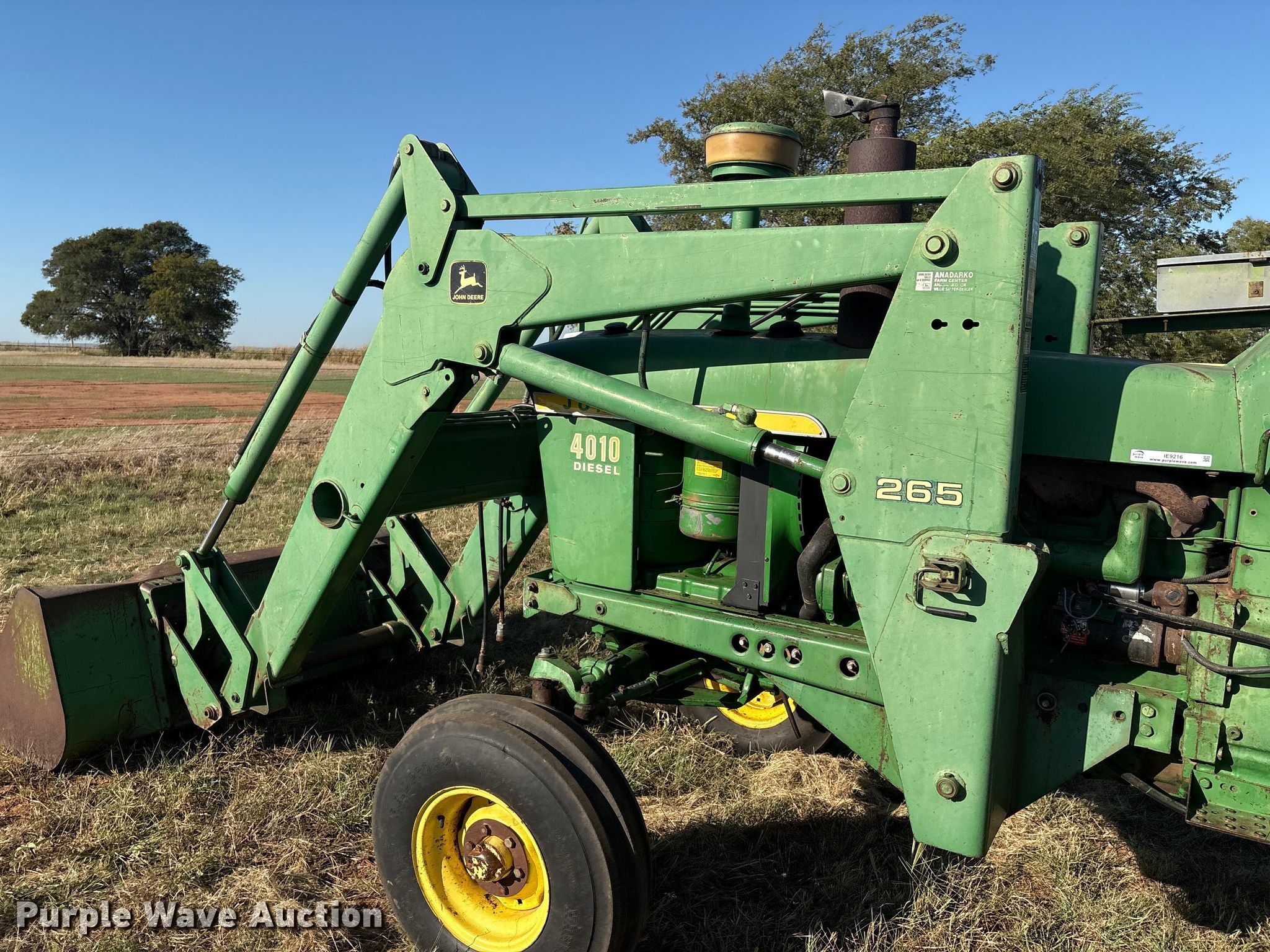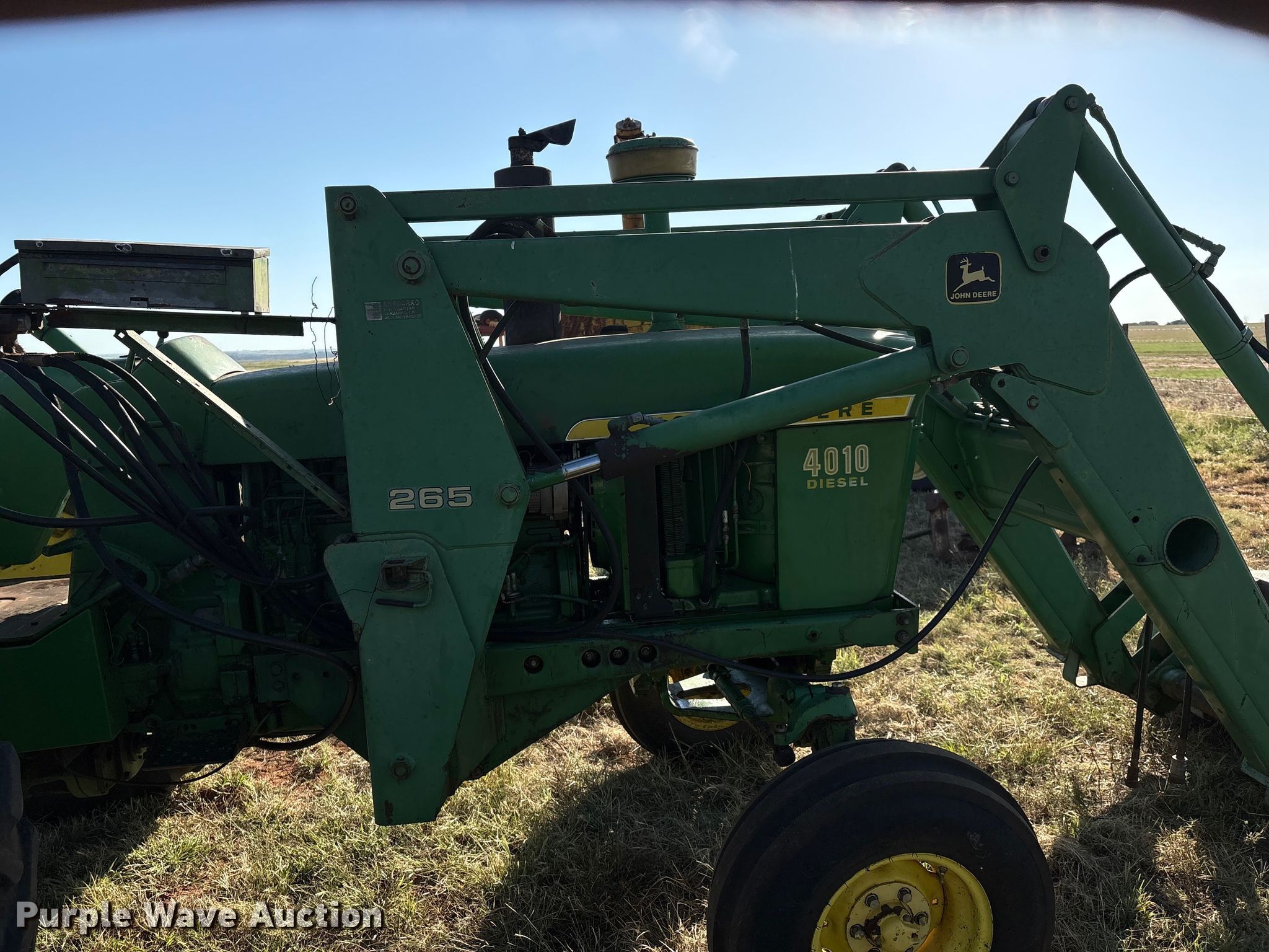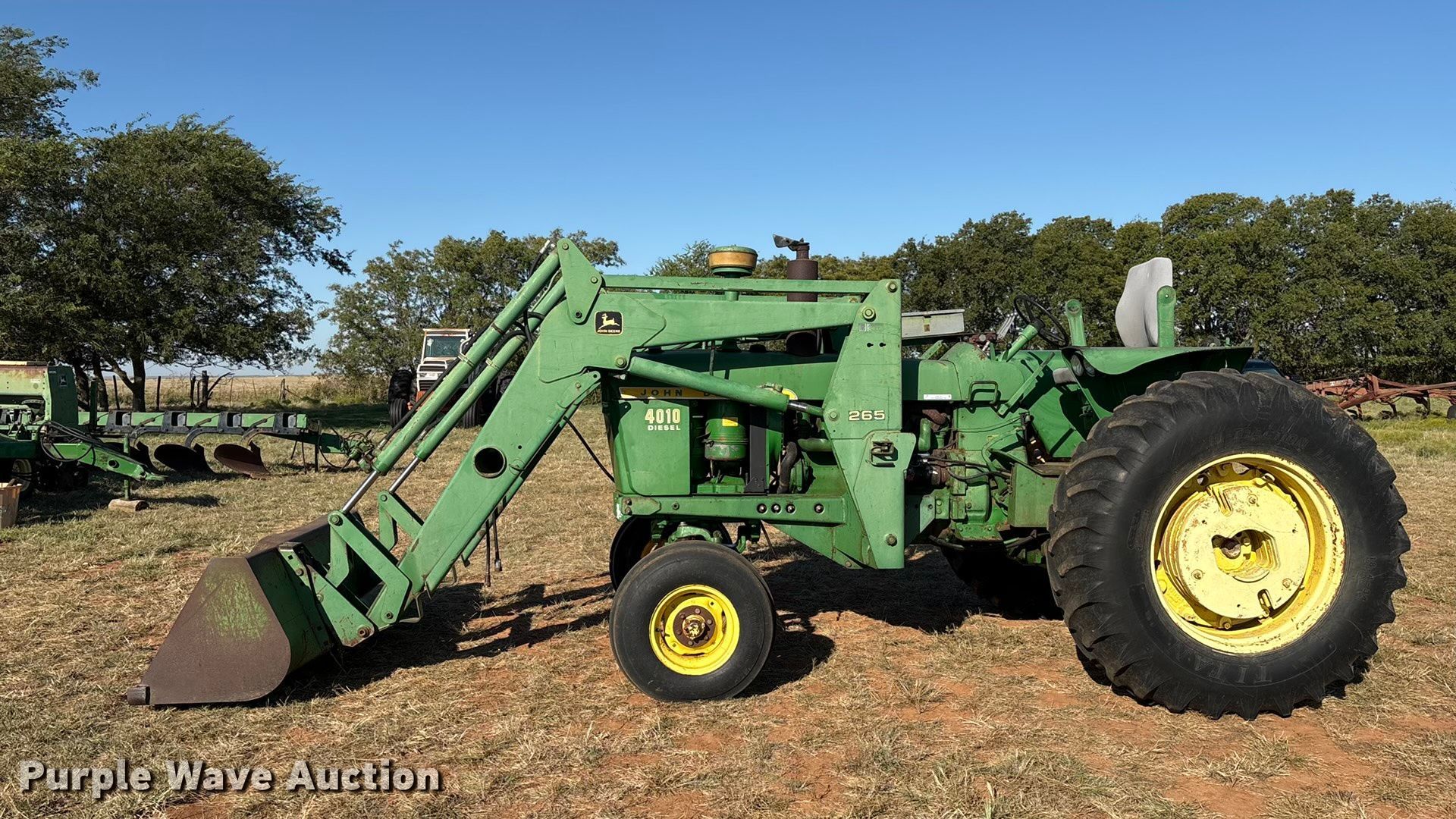 1960 John Deere 4010 tractor. Hours: 7,380 on meter, Serial: 21T40159. Engine John Deere, Displacement: 6.2 liter, Cylinders: 6, Fuel type: Diesel, HP: 89. Transmission Synchro, 8F - 3R, Differential lock. Features PTO: 540, Top link, Rear: 1, Loader John Deere 265, Quick attach, Bale spear, Controls: Two-lever, Bucket Width: 72".. Tires Front: 9.5L-15, Rear: 18.4-34, Wheel weights: 8. Notes Bucket, Width: 60�, Hay forks, Bale Squeeze w/ stand, Partially Synchronized. Chattanooga, OK 73528