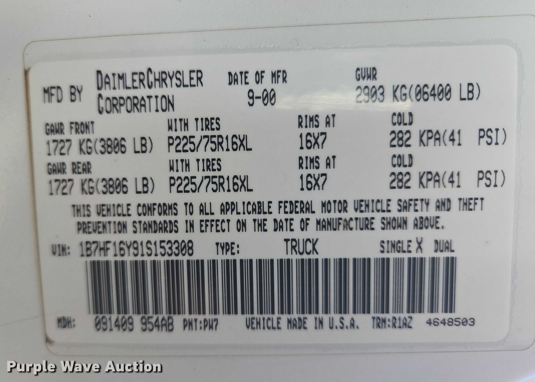 - VIN: 1B7HF16Y91S153308