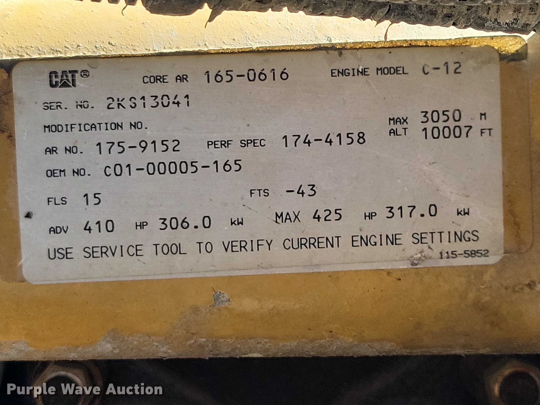 2000 Sterling AT9500 semi truck. Miles: 560,674 on odometer, VIN: 2FWYHWEBXYAF84659. Engine Caterpillar C12, Serial: 2KS13041, Displacement: 12.0L, Cylinders: 6, Fuel type: Diesel, HP: 425, kW: 317, Engine brake. Transmission Eaton Fuller, Manual, Speed: 10. Chassis Axles: Tandem, Differential lock: Inter-axle, Suspension: Air, Brakes: Air, GVWR: 52,000 lbs FAWR: 12,000 lbs, IAWR: 20,000 lbs, RAWR: 20,000 lbs. Interior AC, Heat, Heated mirrors, Power windows, Cruise control, Air ride cab. Features Deck plate: Aluminum, Fifth wheel type: Air operated, Sliding, Fuel tank: Dual. Tires Size: 295/75R22.5. Notes Jump start required during on-site data collection. Iowa title. Seller is a government entity who will be assigning and distributing the title. Please contact the seller for distribution questions. Chickasaw County Secondary Roads Dept. New Hampton, IA 50659