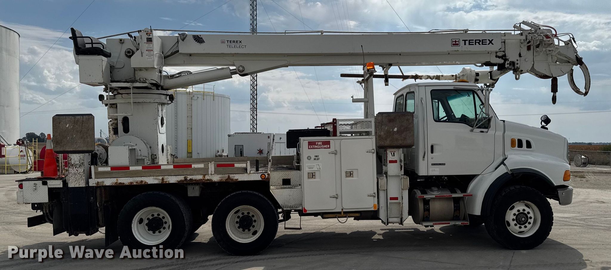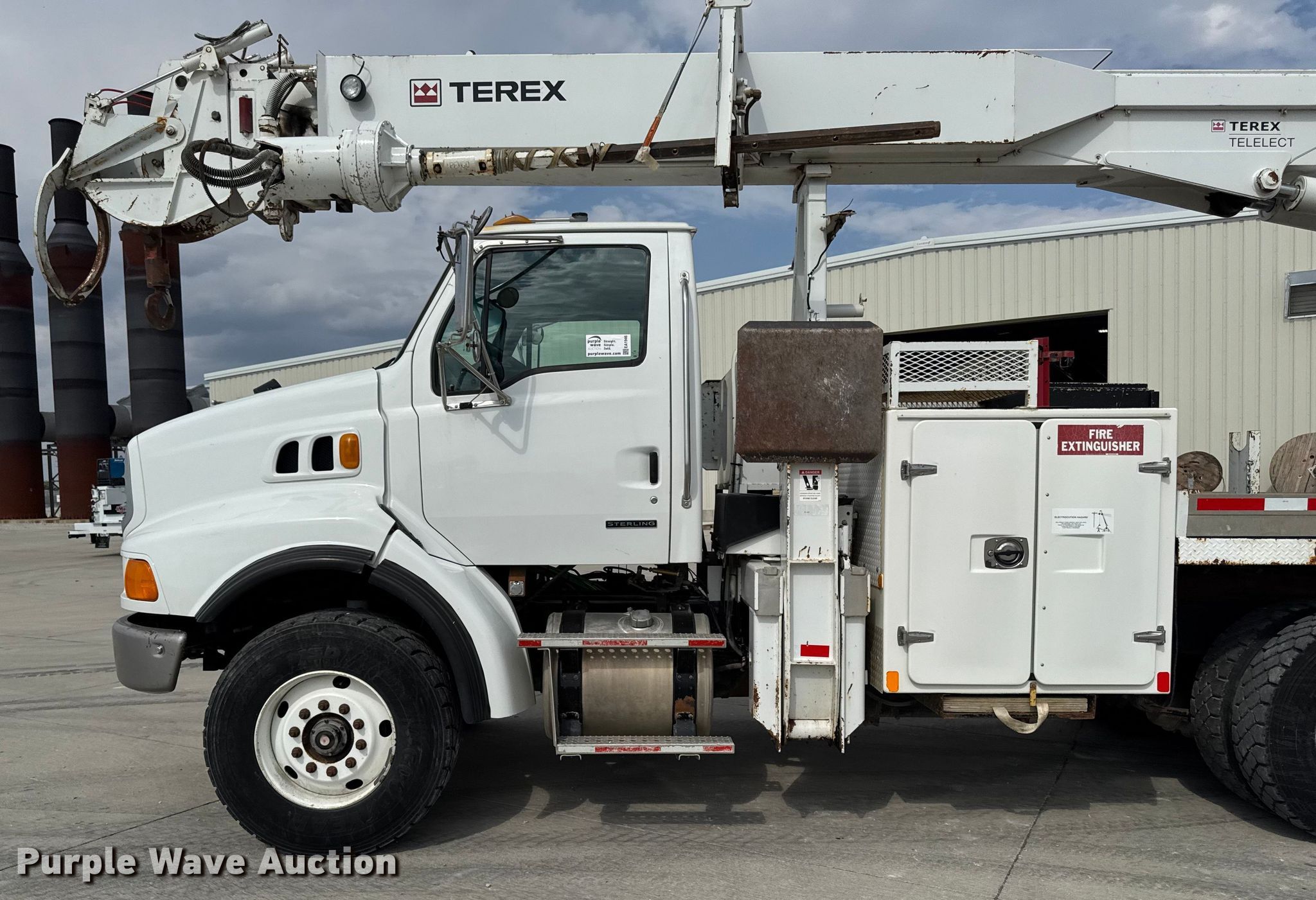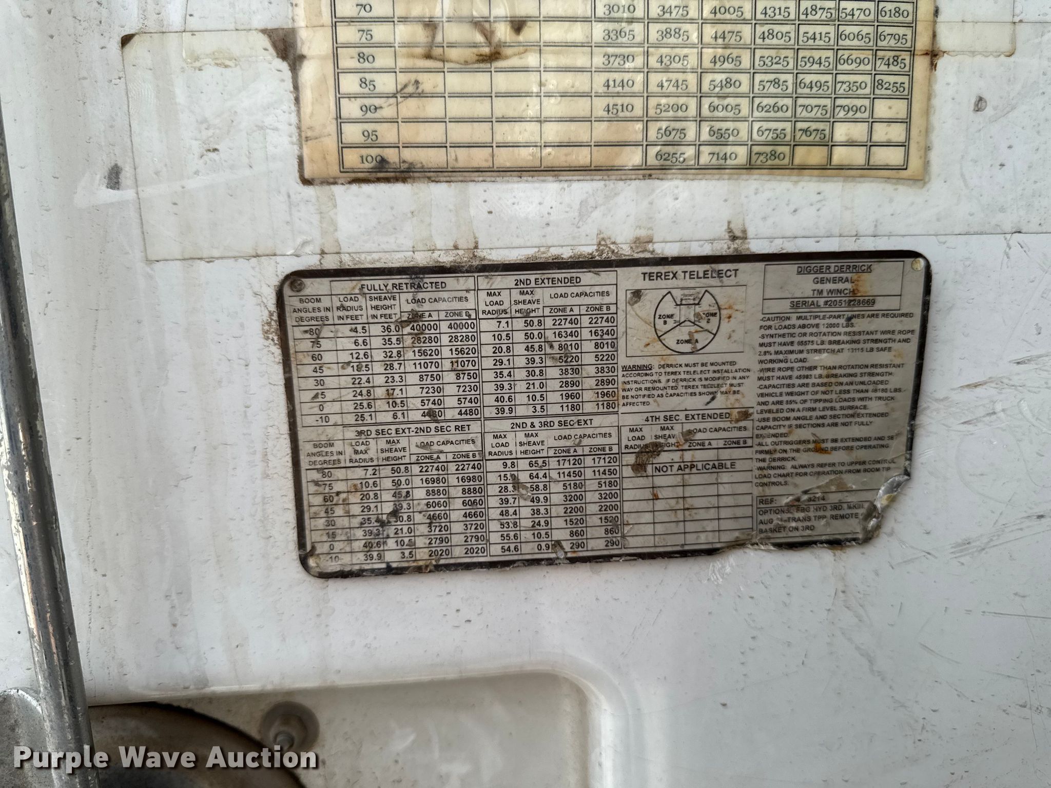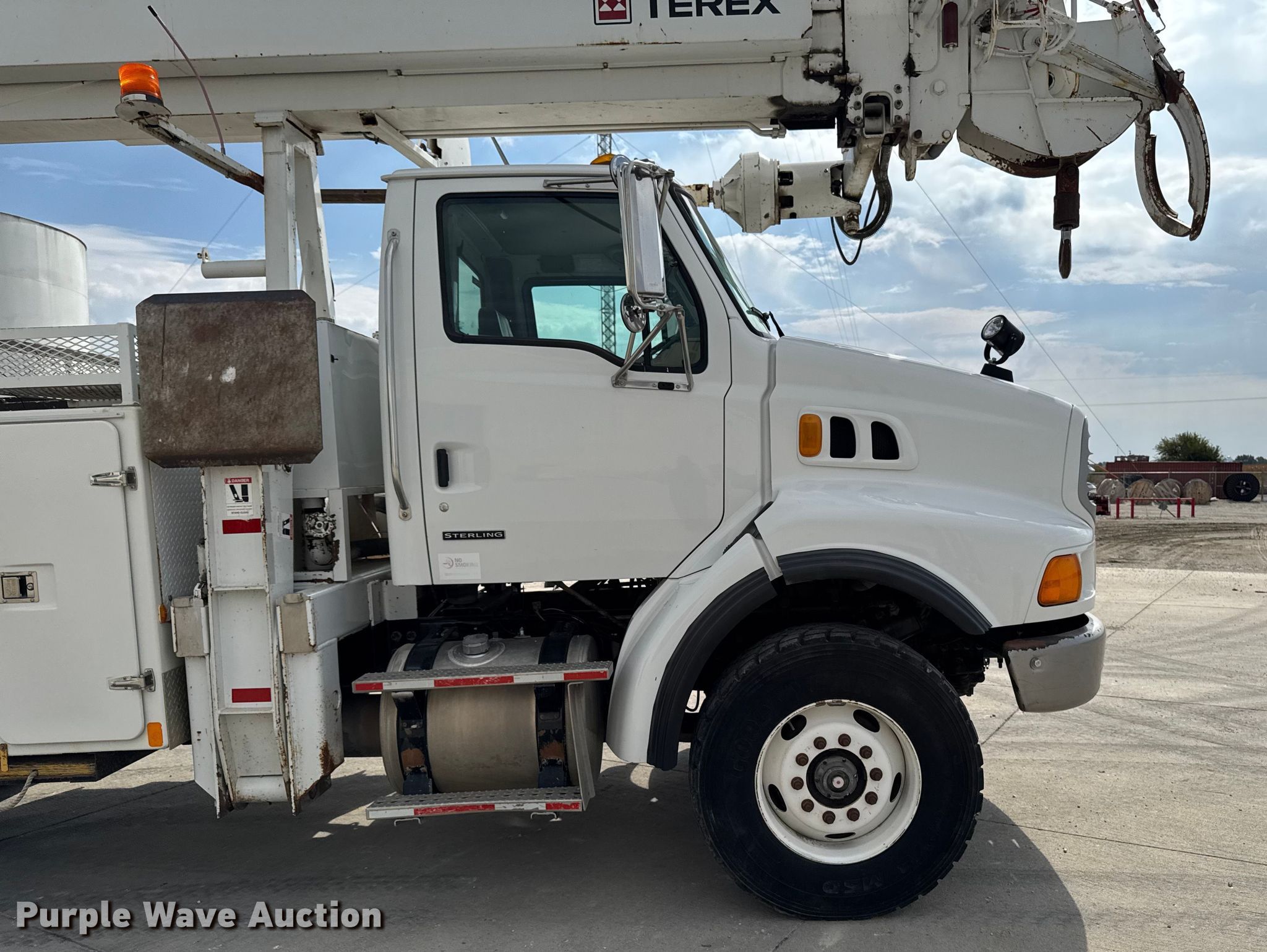 2006 Sterling L8500 digger derrick truck. Miles: 93,900 on odometer, Hours: 7,466 on meter, PTO hours: 3,329, VIN: 2FZHAWDA66AW67693. Engine Caterpillar C9, Serial: 9DG06474, Displacement: 8.8L, Cylinders: 6, Fuel type: Diesel, HP: 350. Transmission Allison, Automatic. Chassis Axles: Tandem, Differential lock: Full, Suspension: Air, Brakes: Air, PTO, GVWR: 58,740 lbs. Interior AC, Heat, Heated mirrors, Cruise control, Auxiliary controls, Brake controller. Features Bed Astoria, Length: 18', Width: 96", Boom 2005 Terex General, Serial: 2051228669, Boom length: 55', Maximum lift capacity: 40,000 lbs, Maximum lift height: 65', Boom type: Insulated, Telescopic, Boom controls Platform/ basket, Material handler, Pole guide, Auger. Tires Front: 385/65R22.5, Rear: 11R22.5. Iowa title. Title distribution may be delayed up to 14 days from verification of funds. Central Iowa Power Cooperative. Creston, IA 50801