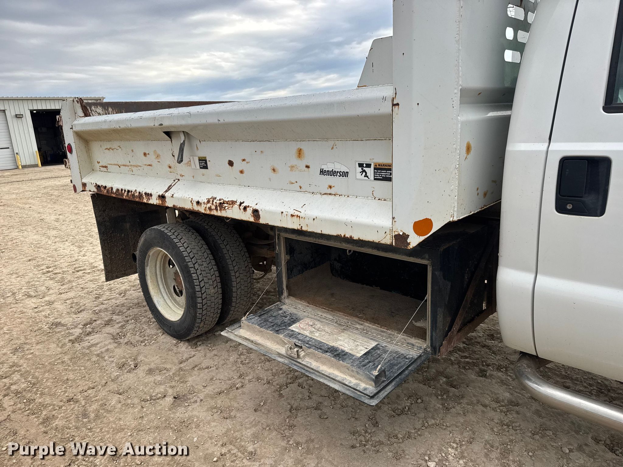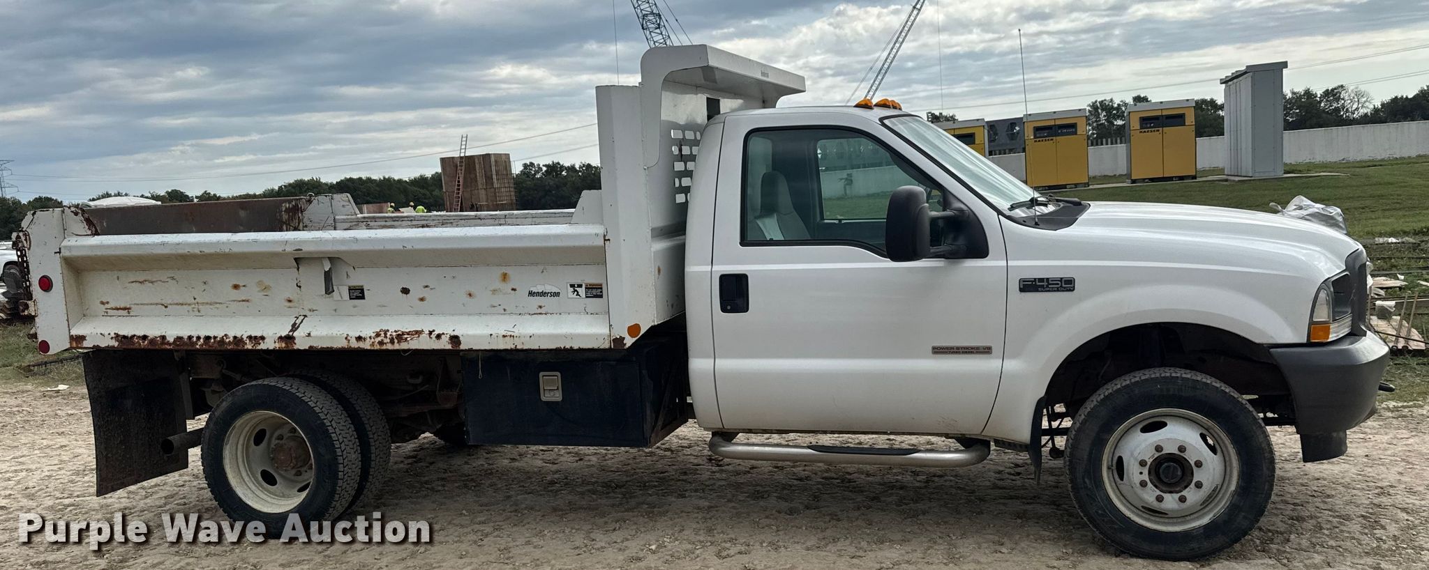 2004 Ford F450 Super Duty dump truck. Miles: 51,241 on odometer, VIN: 1FDXF47P64ED47098. Engine Displacement: 6.0L, Cylinders: 8, Fuel type: Diesel. Transmission Automatic, Four wheel drive. Chassis Axles: Single, Suspension: Spring, Brakes: Hydraulic, GVWR: 15,000 lbs. Interior AC, Heat. Features Bed Dump bed, Henderson 11X18XQRS, Serial: MK3 -15543, Length: 11', Width: 95", Side height: 18", Bed type: Steel, Ram: Single, End gate: Manual. Tires Size: 225/70R19.5. Notes Windshield chipped or cracked. Kansas title. Title distribution may be delayed up to 14 days from verification of funds. City of Andover Wastewater Department. Andover, KS 67002